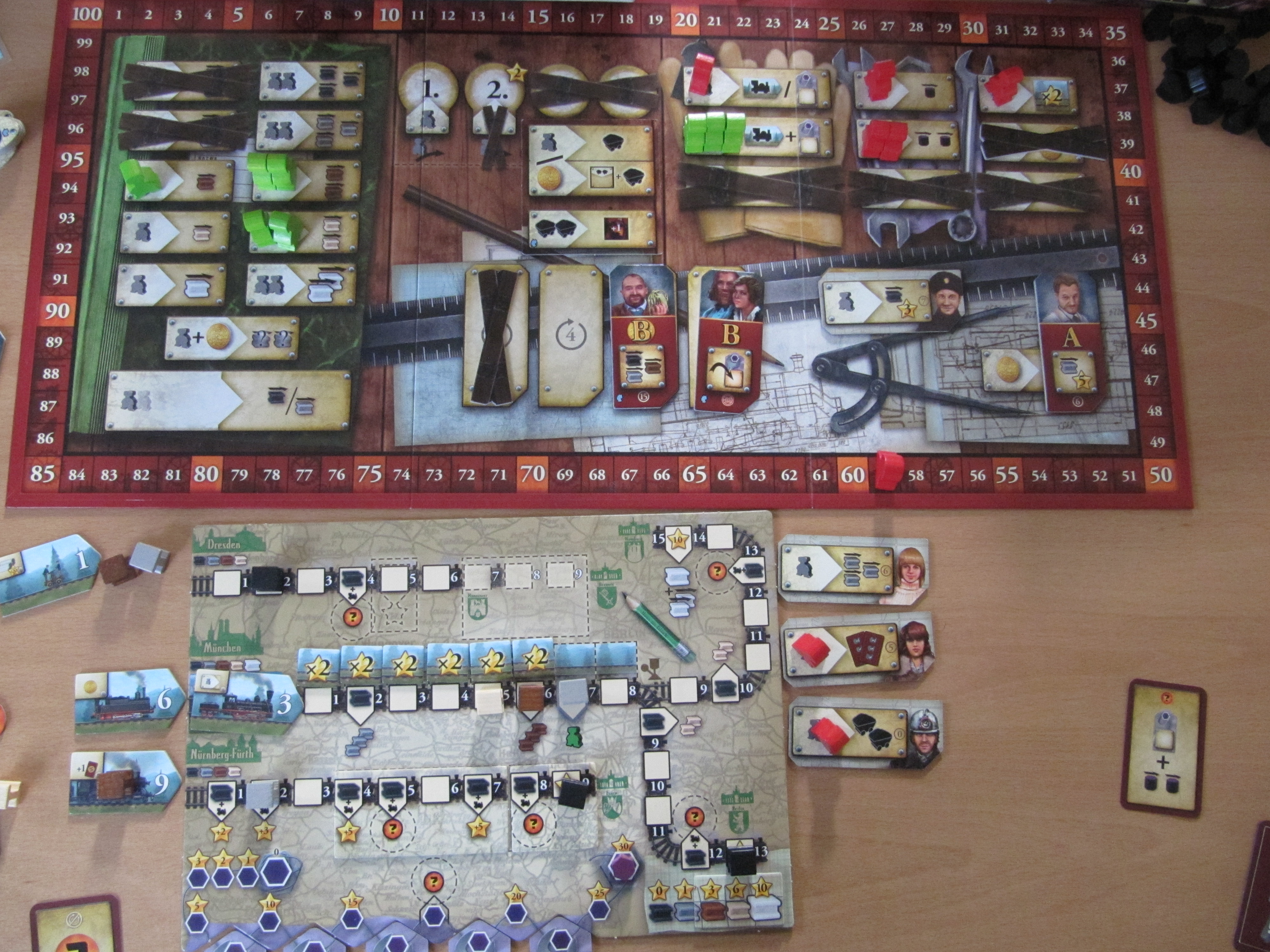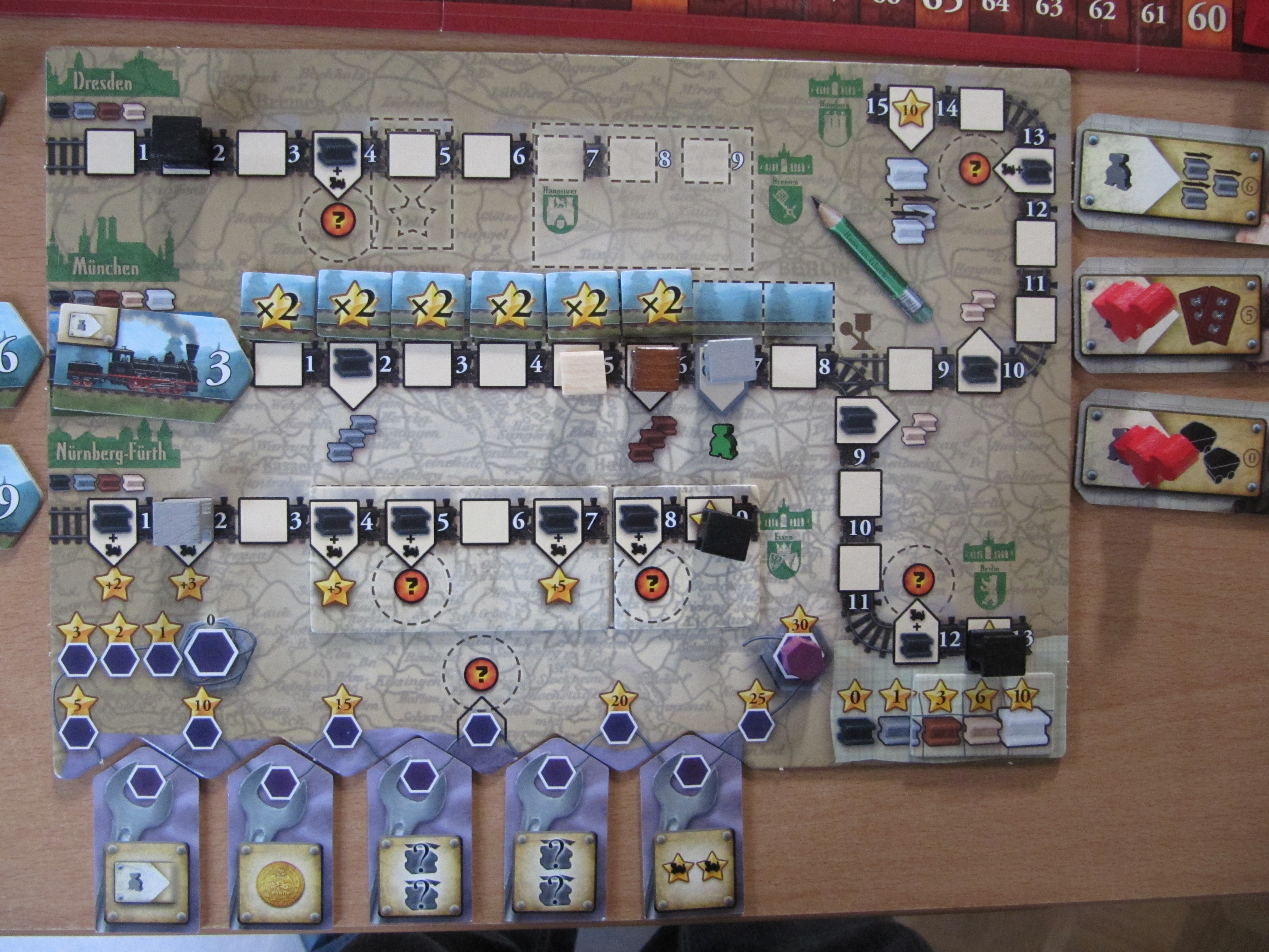 – La plus belle nouveauté est la possibilité de choisir les bonus de sa ligne.  En effet, 3 portions de ligne sont vides.  Lorsqu’on avance son rail noir sur une de ces portions, on doit choisir et prendre, parmi les tuiles portion encore disponibles, celle qu’on va placer sur sa ligne et sur laquelle on va profiter des bonus.  C’est bien vu car, non seulement ça apporte des choix supplémentaires, mais ça apporte également une nouvelle course entre les joueurs qui veulent pouvoir construire une portion spécifique.  Très chouette.
