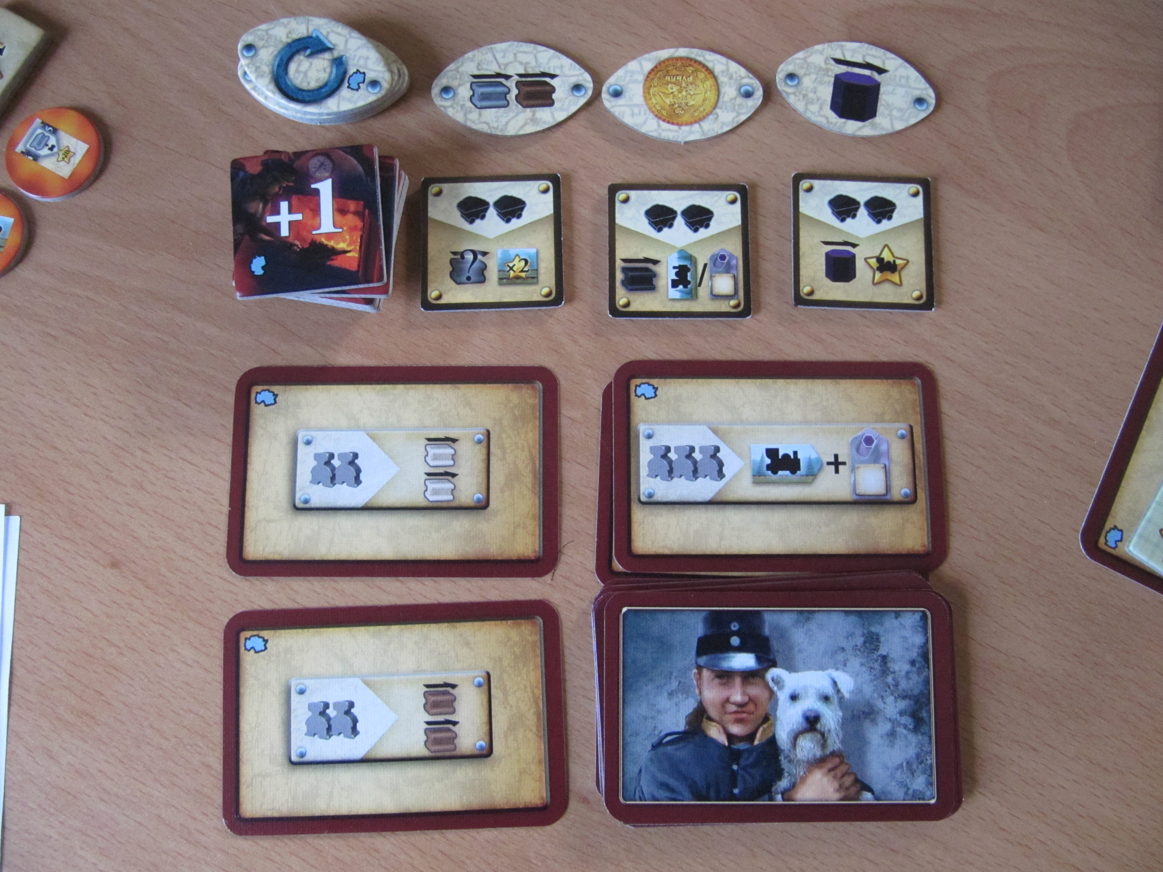 – Les bonus quant à eux sont disposés différemment mais sont les mêmes : PVs, jetons point d’interrogation, nouvel ouvrier, rails gris/bruns/beiges/blancs,…