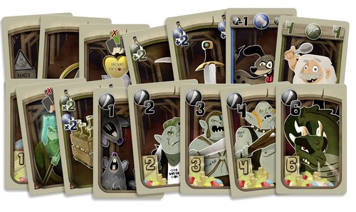 – Pouvoir piocher des cartes mines que si la force de ses nains est supérieure à celle des nains adverses. Ce sont ces cartes mines qui vont vous donner les PVs convoités. Mais, à l’image de Fool’s Gold, ces cartes mines peuvent tout aussi bien être des terres (=0 PV), des trésors (=PVs) que des rencontres qui vont se battre contre vos guerriers. On va alors comparer la force de vos nains et la force de la bestiole. Evidemment, mieux vaut être copain avec dame chance car on ne connaît pas la force des bestioles du paquet à l’avance. Si nos guerriers sont plus forts, on garde la carte rencontre qui peut rapporter des PVs et on défausse des nains guerriers dont la force cumulée est égale à celle des la bête. Sinon, on perd tous ses