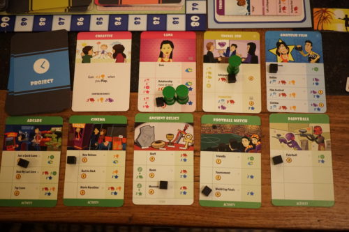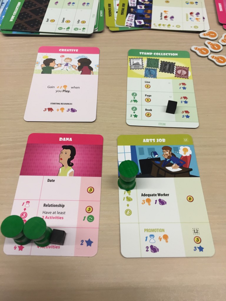 2)Acquérir une des cartes disponibles pour le tour. Il y a 5 types de cartes : les projets (créer un jeu de société (si si 😉 ), fonder un groupe de rock, se lancer dans la collection de timbres-poste,…), les choses (une voiture, des vêtements, une armoire,…), les activités (faire du parachute, partir en vacances, aller au resto,…), les jobs (dans l’art, la science, le soclial,…), et les partenaires. Chaque carte nécessite des ressources pour être acquises et donnent un bonus en ressources, en stress ou en point de victoire (les fameux points de bonheurs 🙂 ). De plus, certaines cartes nécessitent d’être entretenues chaque tour ce qui nécessitera des ressources spécifiques qu’on pourra décider de ne pas dépenser mais qui nous coûteront alors du stress…