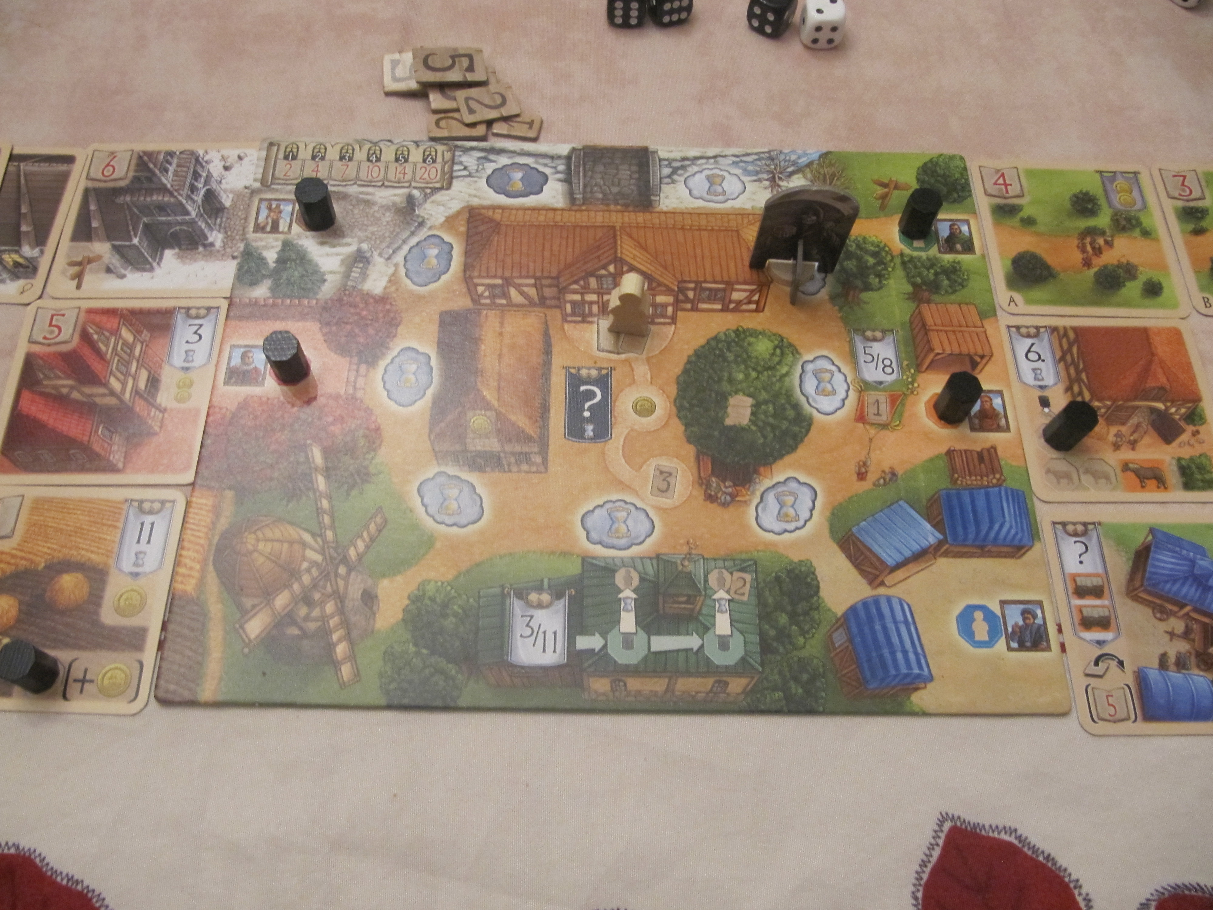 Bien qu’inspirée d’Yspahan et des Colons (mais alors de très très loin 😉 ), la mécanique du choix des dés est excellente : En fonction du nombre de joueurs, le premier joueur jette un certain nombre de dés blancs & noirs. Puis, chacun à son tour en choisit 2 et exécute une action dont le chiffre fait la somme des 2 dés (à chaque action correspond un chiffre). Si on prend un dé noir, tout comme les cubes noirs de Descendance, on perd 2 temps qui vont nous rapprocher d’une mort certaine… La mécanique est excellente en effet mais il faut admettre que les choix sont forts peu limités car on obtient bien souvent le nombre qu’on désirait et, au pire, on peut changer la valeur d’un dé assez facilement. Que le jeu des dés ne limite pas plus que ça les choix donne un côté un peu bizarre. D’un autre côté, aucun joueur ne pourra se plaindre ni de la malchance aux dés 🙂 ni des choix trop limités de Clochemerle 🙂