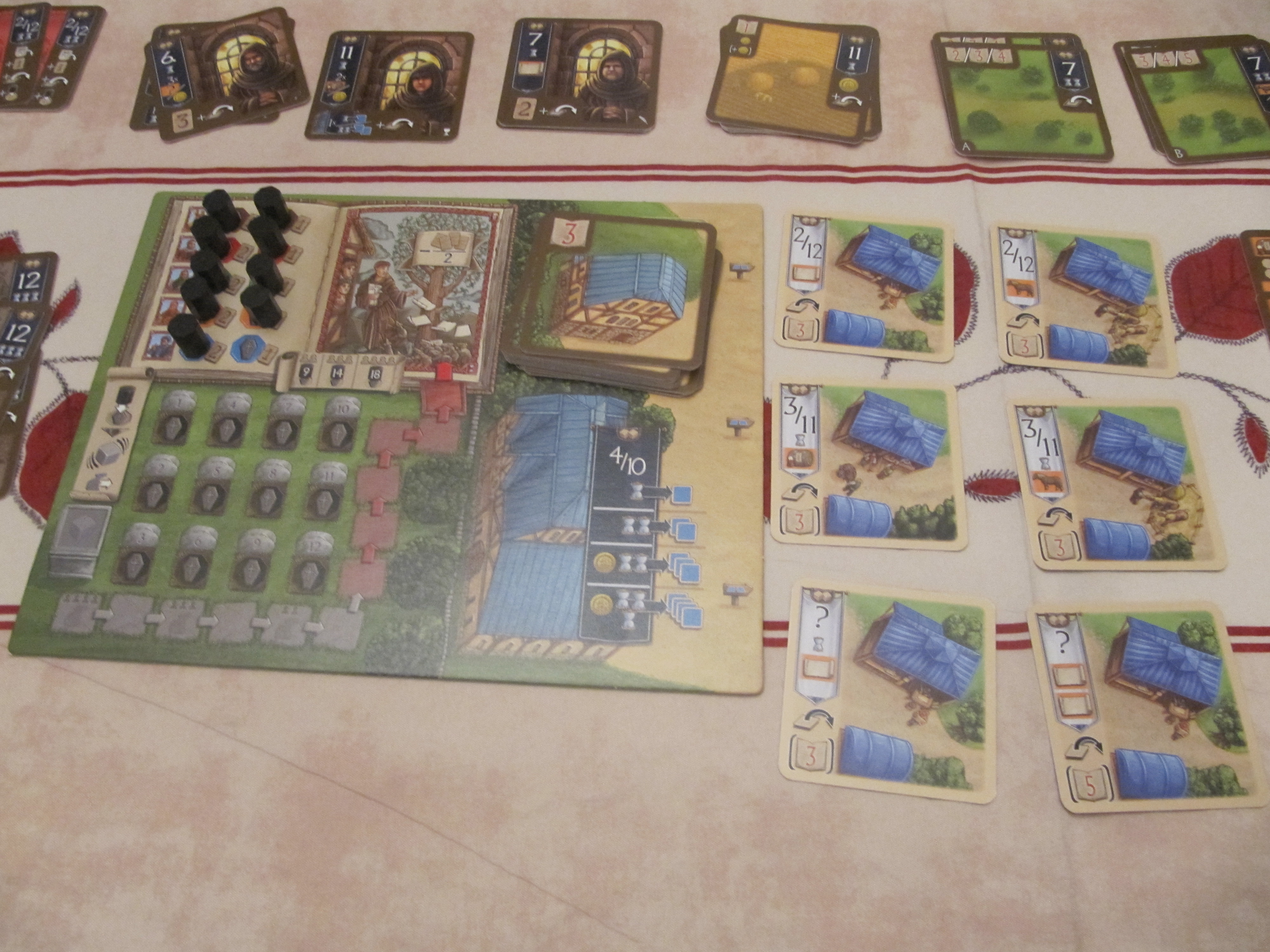 Les coûts sont un mélange de pièces et de biens. Chaque construction d’église rapporte des PVs (exponentiels au plus on en a) et des bonus one shot.
