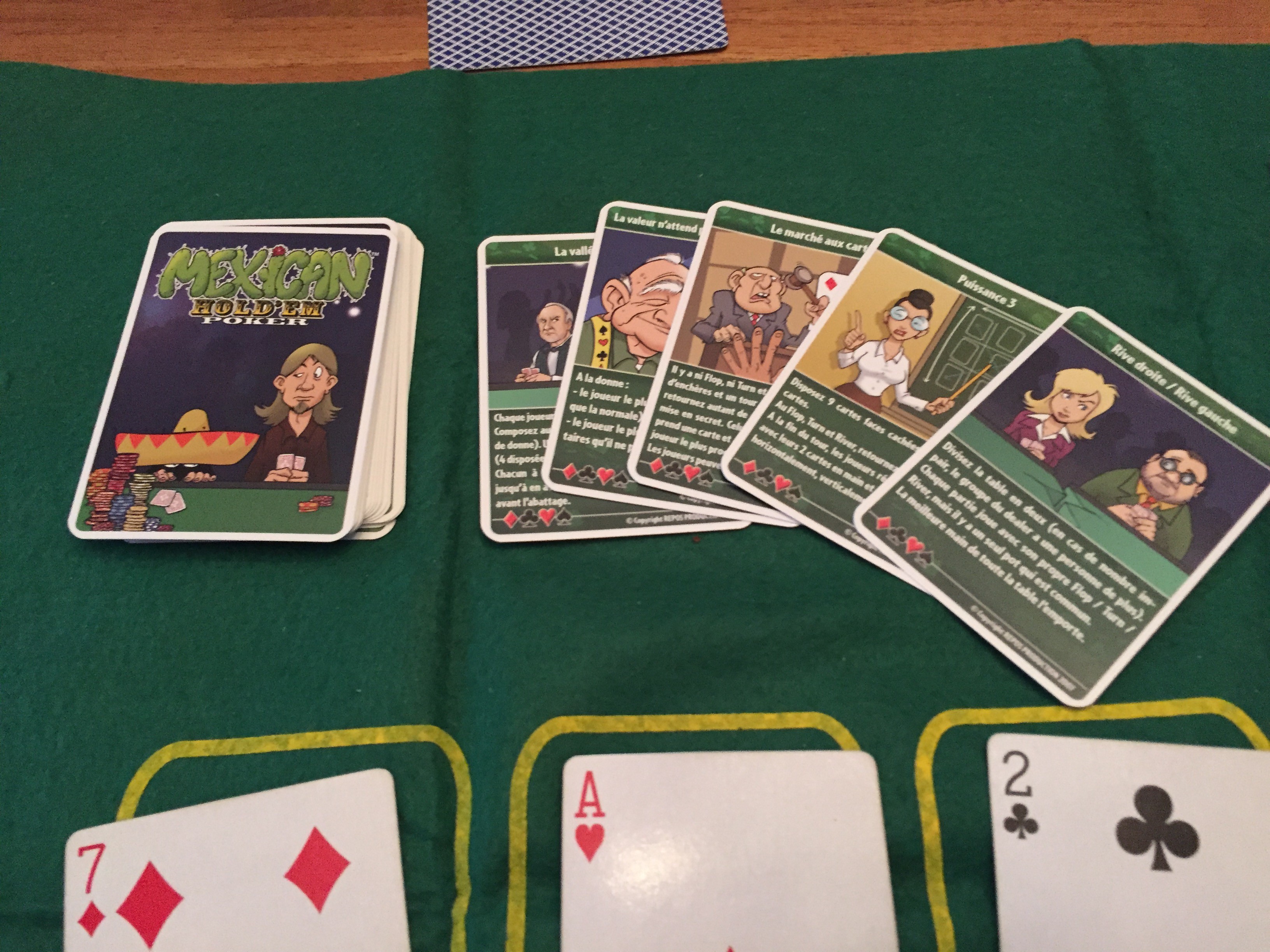 Mexican Hold’em poker introduit un jeu de cartes supplémentaire au Poker traditionnel.  A chaque tour, on tire une de ces cartes et on applique sa règle qu’on intègre aux règles du poker traditionnel.  Pour vous donner une idée, en voici quelques-unes :