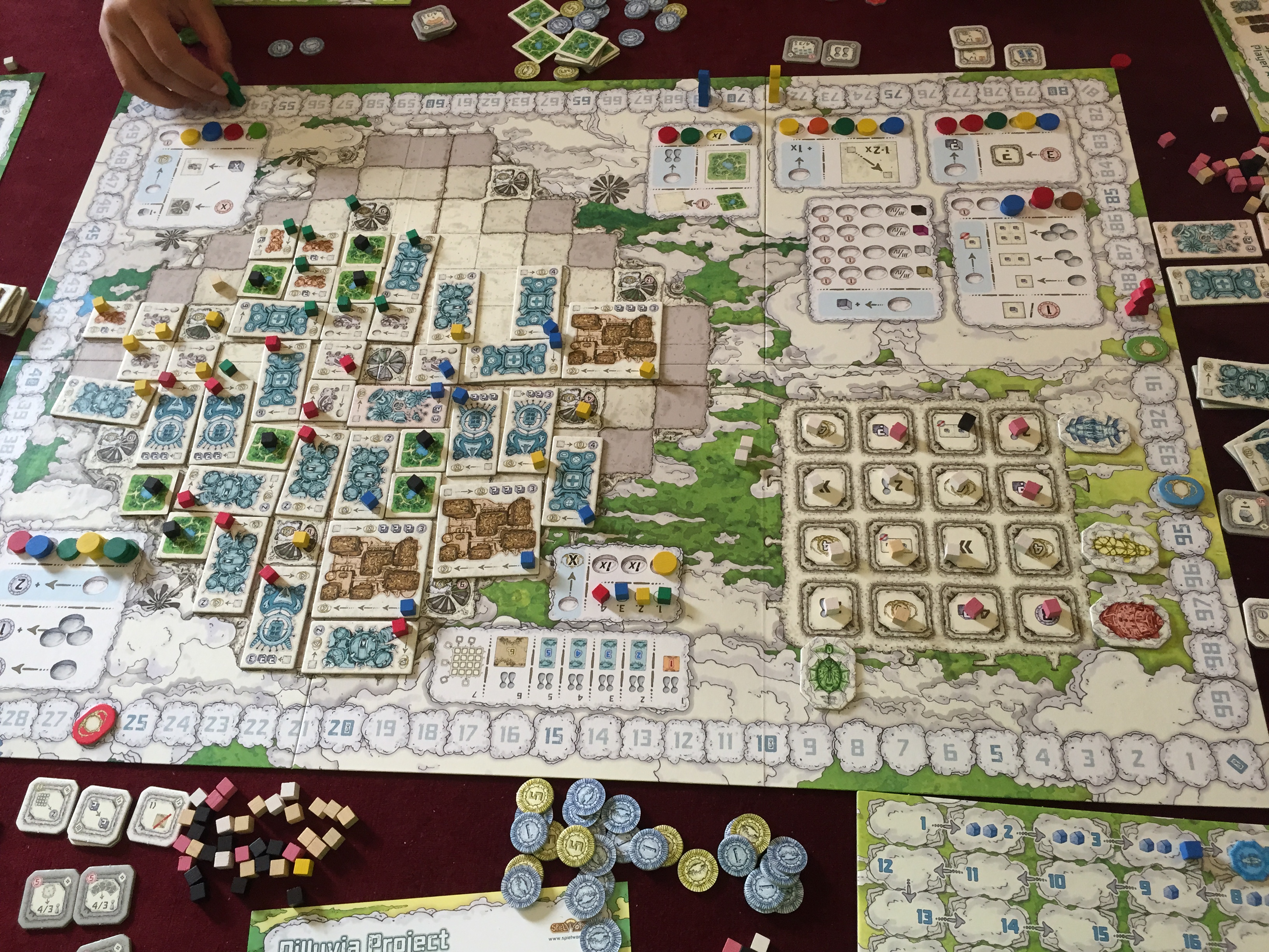 Pour cela, rien de tel qu’une mécanique déjà bien amortie : celle du placement d’ouvriers. La particularité ici, c’est qu’on peut placer, en une seule fois, plusieurs ouvriers sur la même case d’action afin de pouvoir la réaliser plusieurs fois de suite et même d’obtenir certains bonus si le nombre d’ouvriers atteint le minimum requis pour l’action en question. De plus, chaque joueur dispose d’un ouvrier spécialisé. Chacun des 8 types d’actions donne un bonus supplémentaire à celui qui y place son ouvrier spécialisé en premier. Et ce petit bonus est bien vu car non seulement il est équilibré et les joueurs vont vouloir obtenir différents bonus en cours de partie (les choix sont donc nombreux) mais, en plus, il apporte une tension dans la course à être le premier à placer son spécialiste sur telle ou telle autre case.