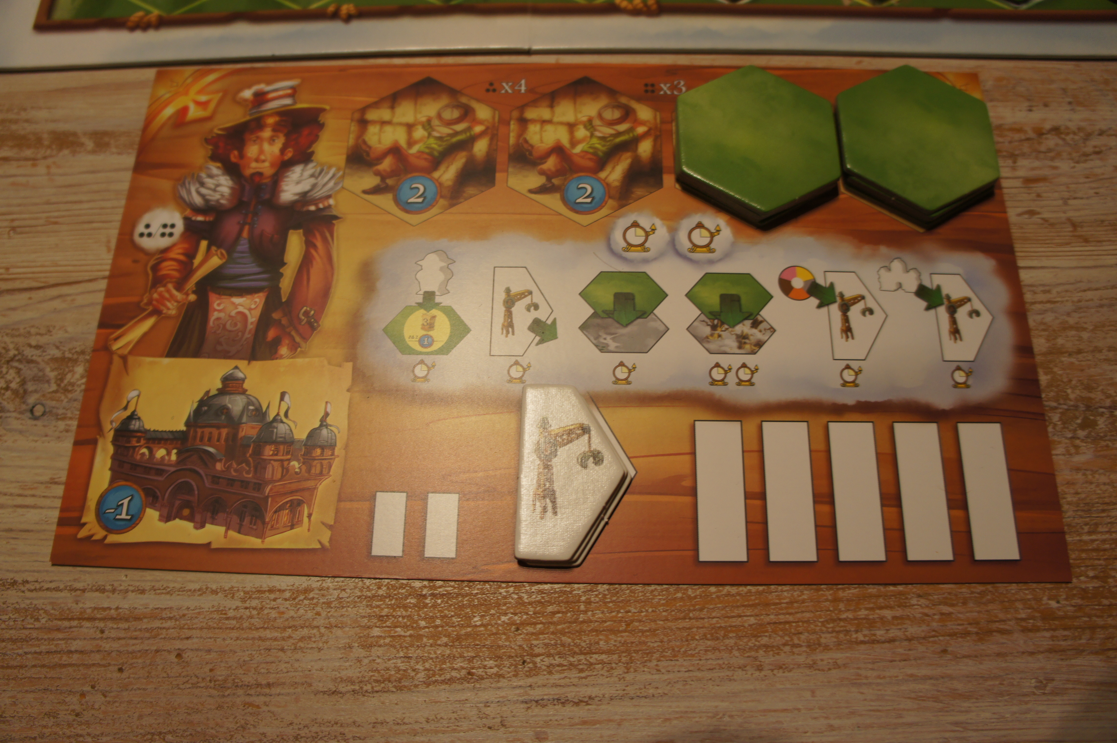 1 poser un artisan: chaque joueur dispose de 3 artisans au départ. Avec cette action il peut en placer un sur une case du plateau ayant un jeton d’exploitation. Cela signifie qu’il « ouvre » une exploitation, disposant des ressources qui étaient mentionnées sur le jeton, qu’il récupère en passant. A noter que chaque jeton procure également des points de victoire à la fin de la partie.