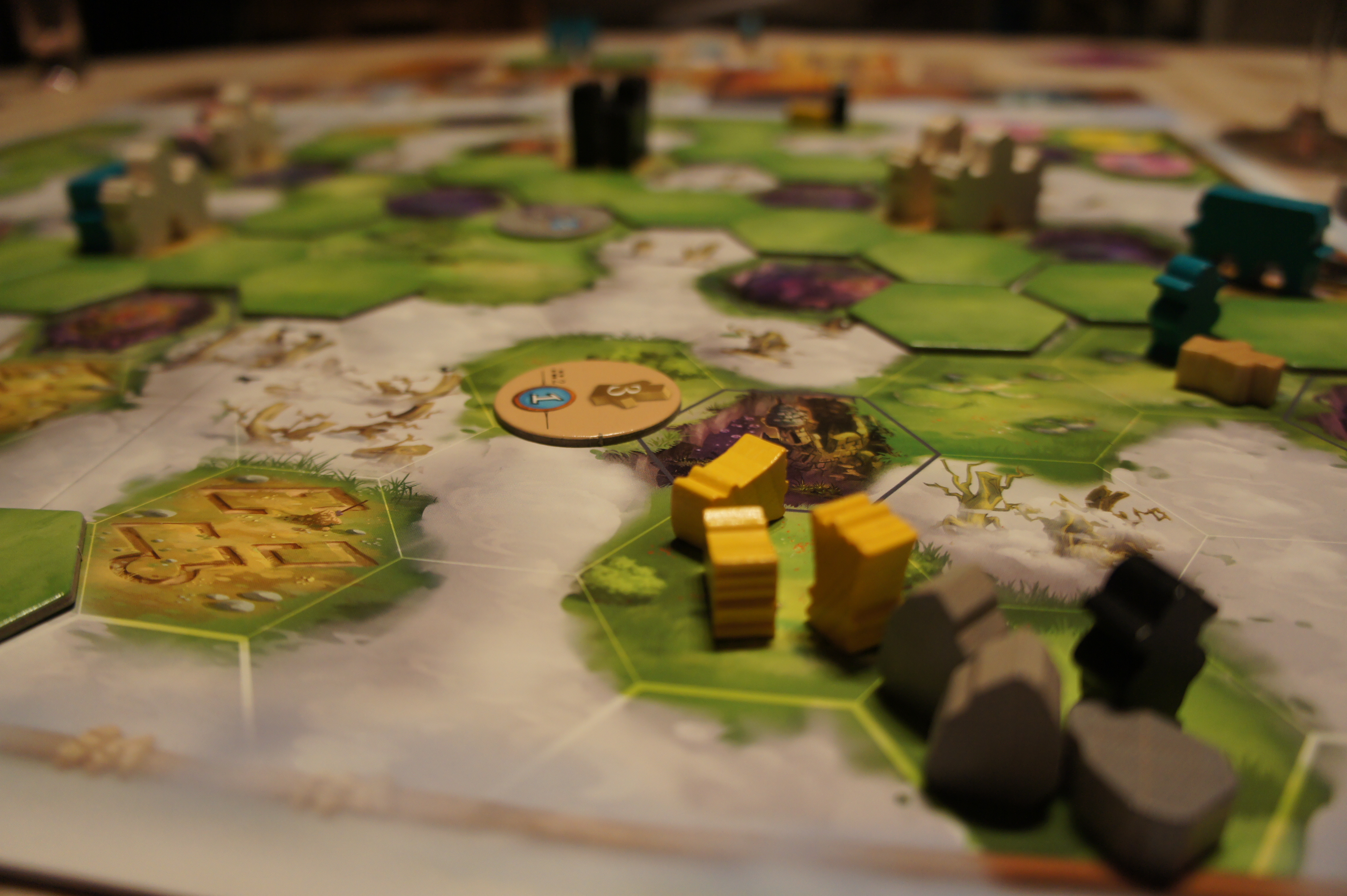 3 explorer une zone de brume: chaque joueur dispose de 4 piles de 3 tuiles plaine au départ. Avec cette action il peut en placer une (prise sur la pile la plus à gauche de son plateau) sur une case de brume libre, et qui est soit adjacente à une case ayant un élément à sa couleur, soit adjacente à une autre case plaine vide. Ce faisant il rend la case accessible à tout le monde.