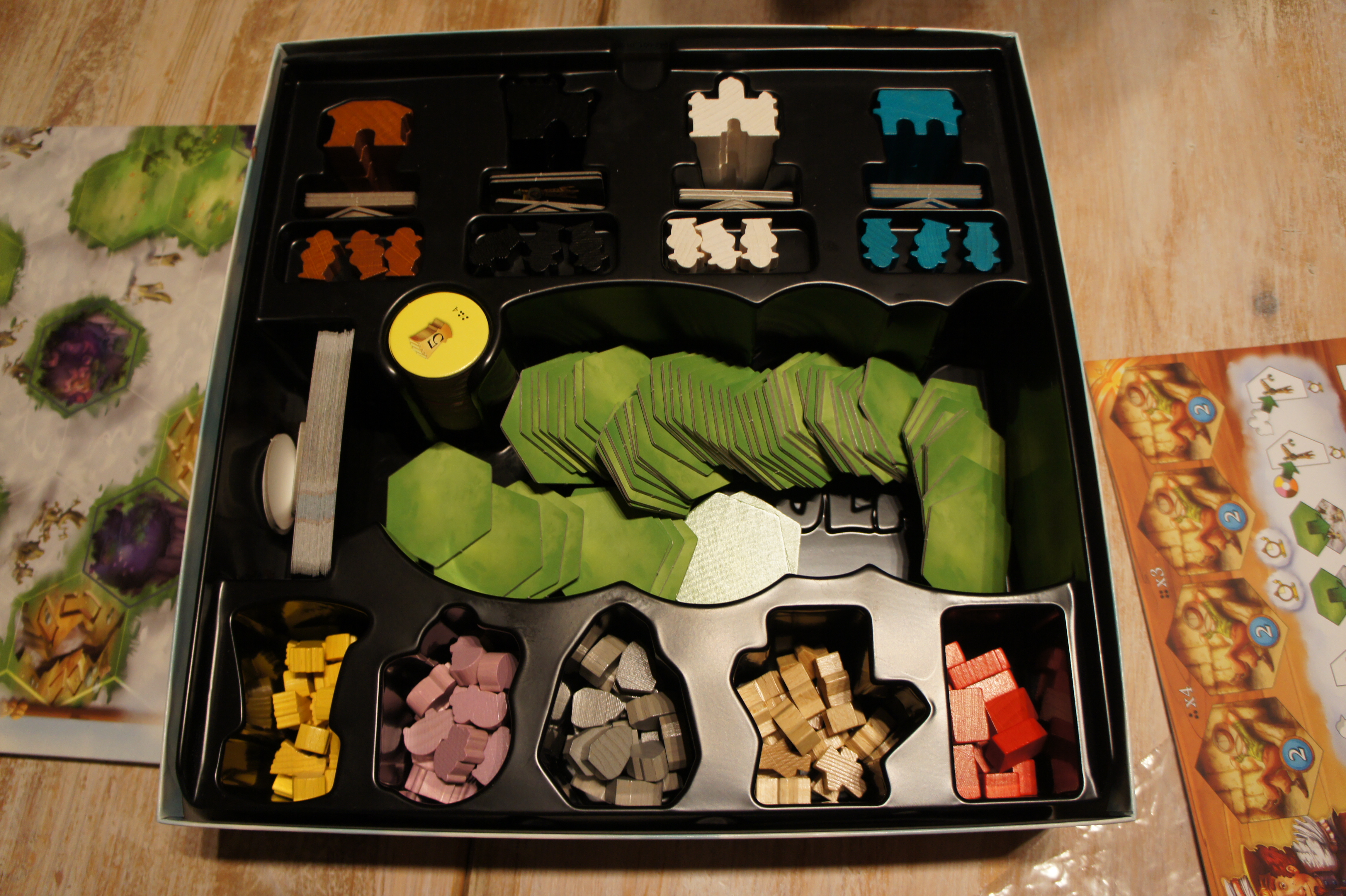 Et cette touche éditoriale se remarque très rapidement. Tout d’abord par des graphismes beaucoup moins austères. Ensuite, par un matériel somptueux. Fini les cubes en bois, maintenant, les ressources sont représentées par des jetons en bois de forme de la ressource : des briques, des branches d’arbre, des cochons, du blé et des blocs de pierre, tous du plus bel effet. Et ce n’est pas tout, les ouvriers des joueurs sont magnifiques et chaque joueur a 5 bâtiments de forme unique. La claque ! Cerise sur le gâteau, et les Space Cowboys commencent tout doucement à en faire leur marque de fabrique (voir l’excellent Splendor), le thermoformage de Via Nebula est juste … parfait ! Une petite entaille pour glisser les tuiles de chaque joueurs, les formes spécifiques pour chaque bâtiment, des espaces de rangement pour les ressources dont la forme est celle de la ressource sont tout bonnement « waouw » 🙂 . Le plus magnifique de tout est le plateau qui vient s’emboiter parfaitement au thermoformage rendant impossible tout chambardement à l’intérieur de la boite. Et dieu sait si je suis un « maltraiteur » de boite !!! Je les transporte dans mon coffre où elles glissent en suivant les tournants de la route, je les range à la verticale, je les déplace souvent,… Et bien, je pense que Via Nebula est le premier jeu à se sortir parfaitement de toutes ces manipulations. Pas une pièce n’a bougé de son rangement !!! J’ai jamais vu ça. Pour une fois, je peux ranger mes sachets zippés 🙂