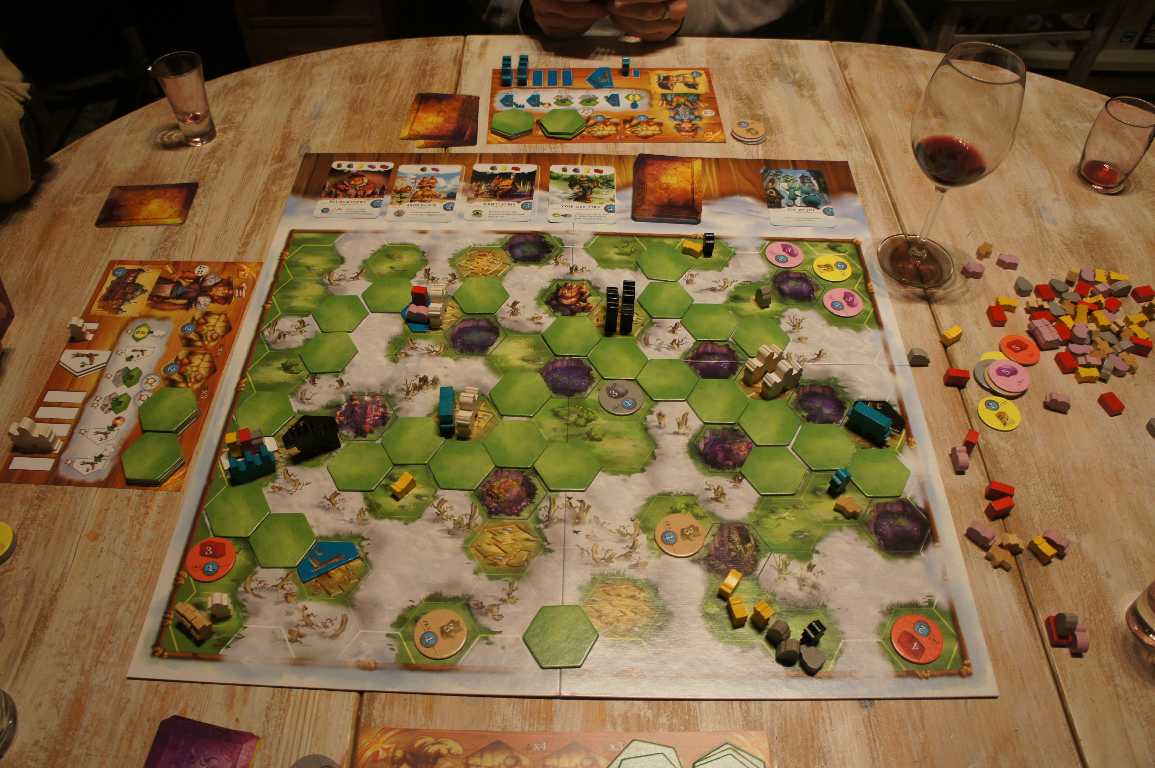 Le plus gros avantage à mes yeux est l’interaction entre les joueurs. En effet, les actions effectuées influencent immédiatement les choix possibles des autres joueurs. Limitant ces derniers ou leur offrant de nouvelles opportunités. Ajoutons à cela une certaine part de hasard dans l’apparition des cartes objectifs.