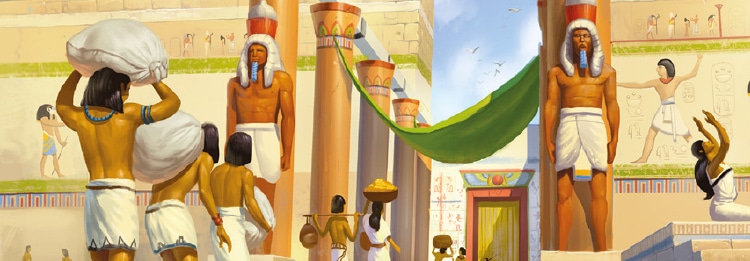 Sous me masque est clairement un scénar de tout haut vol. Il est rempli de surprises, de nouveaux mécanismes et d’humour. Et oui, certains petits détails du jeu sont hilarants si on y porte suffisamment d’attention. Ca donne un petit effet private joke succulent. Cette fois-ci, on est plongé dans l’Egypte antique, on y vit et interagit avec les citoyens de l’époque. C’est tout bonnement excellent. On remarque que le scénario a dû demander de nombreuses recherches qui permettent de donner le ton juste. Ce scénario a d’ailleurs été co-réalisé par Guillaume Montiage qui semble affectionner ce thème à travers ses différents jeux (Kemet et Nefertiti). Les splendides illustrations de Gaël Lannurien (qui a aussi réalisé celles de Ginkgopolis) et de Pascal Quidault n’y sont pas étrangères non plus. Dès l’arrivée en Egypte, on est scotché par la beauté des dessins.
