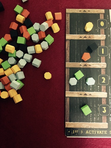 Au début de son tour, on doit faire « monter » ses ressources. Pour cela, on prend toutes les ressources d’une des 4 cases, et on les « monte » en déposant une ressource dans chaque case passée jusqu’à déposer tout le reste au-dessus de la case « 0 ». On doit utiliser toutes les ressources mises au dessus de la case 0 à ce tour-ci car le reste est perdu à la fin du tour.