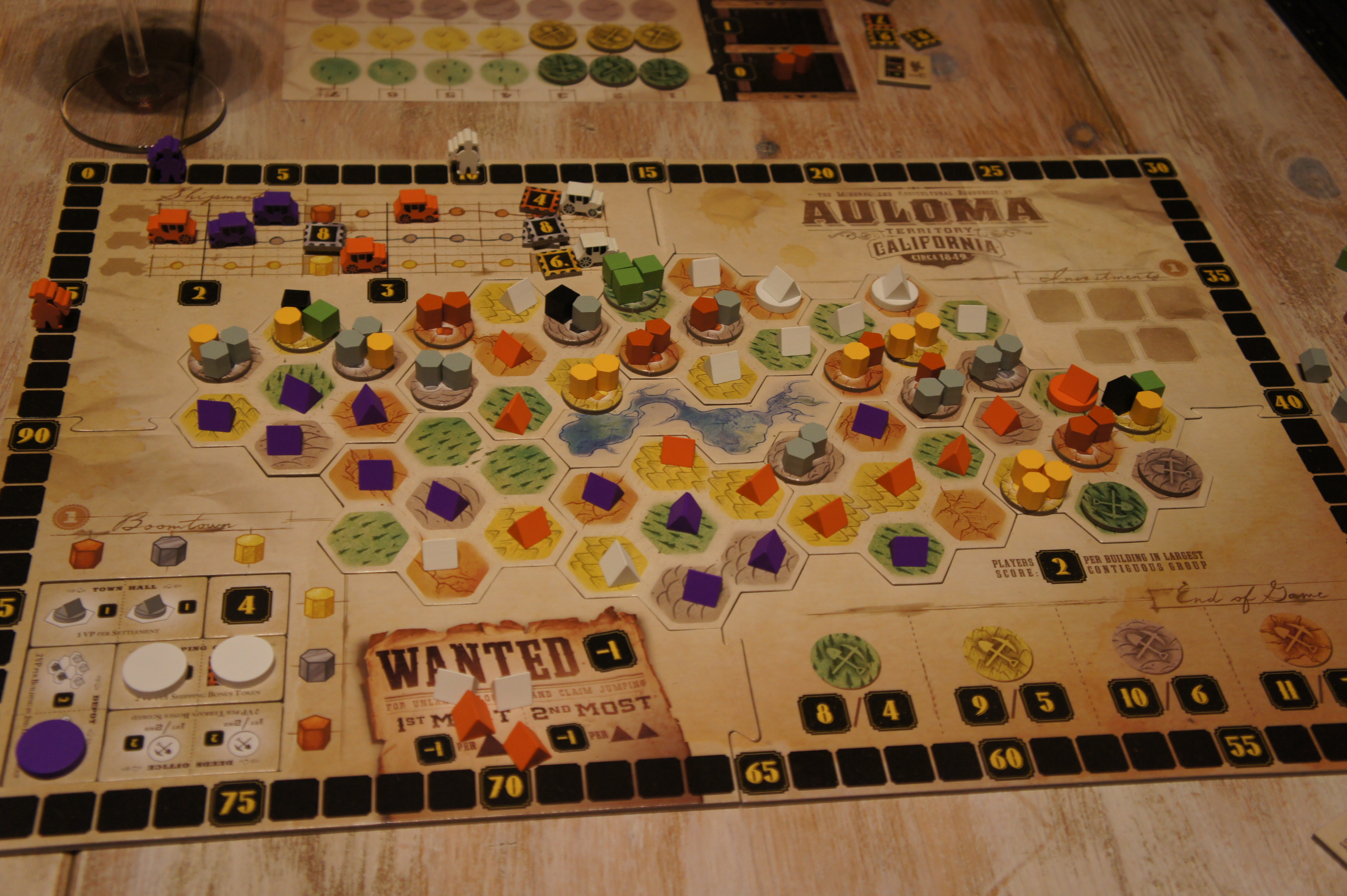 La manière de scorer est assez classique, mais la rejouabilité est assurée par les différents bonus disponibles en bas à gauche du plateau (visible sur les photos). Le nombre de jeton assure que chaque partie sera différente. Un petit regret quand même : le texte est très petit et donc peu lisible … Equilibré, simple de par ses règles, mais exigeant de par sa mécanique basé sur l’awalé, Gold West nous a fait passer un bon moment.