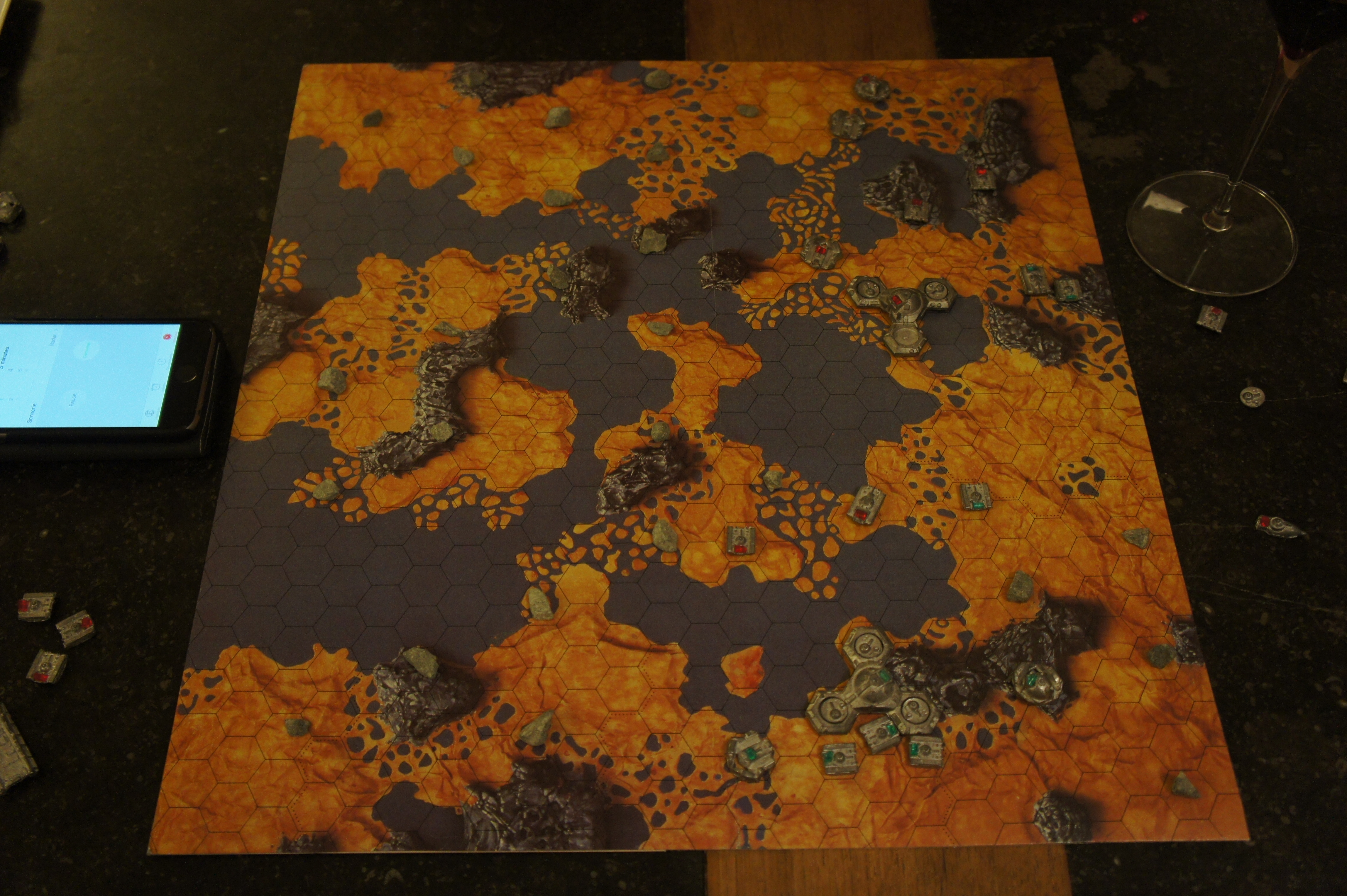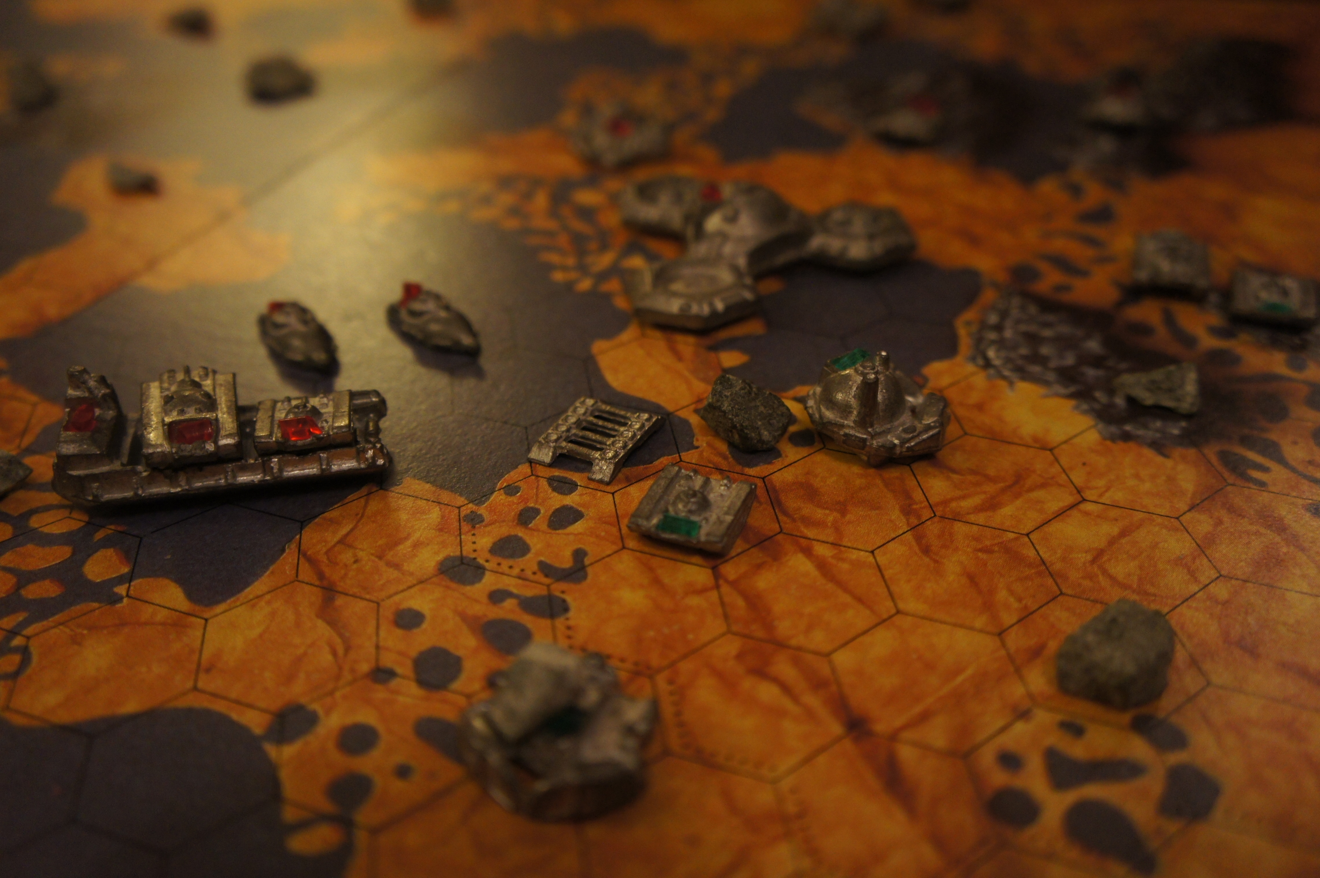 Et pour finir, évidemment, ses aspects épiques et thématiques.  Grâce à son matériel de ouf et ses règles voulant se calquer un maximum au thème (quelques fois un peu trop d’ailleurs ce qui engendre une multitude d’exceptions difficiles à retenir), on est à fond dedans : on débarque d’abord notre aéronef sur cette planète hostile, puis on débarque ses unités de son aéronef pour ensuite explorer la planète, récolter du minerais pour soit le charger dans son aéronef, soit le transformer en nouvelles unités.  On va déplacer nos petites unités sur la planète, combattre et tenir certaines positions cruciales, attaquer ses adversaires et récolter du minerai.  On va planifier ses mouvements à long terme dans sa tête pour établir un plan de conquête.  Magnifique.