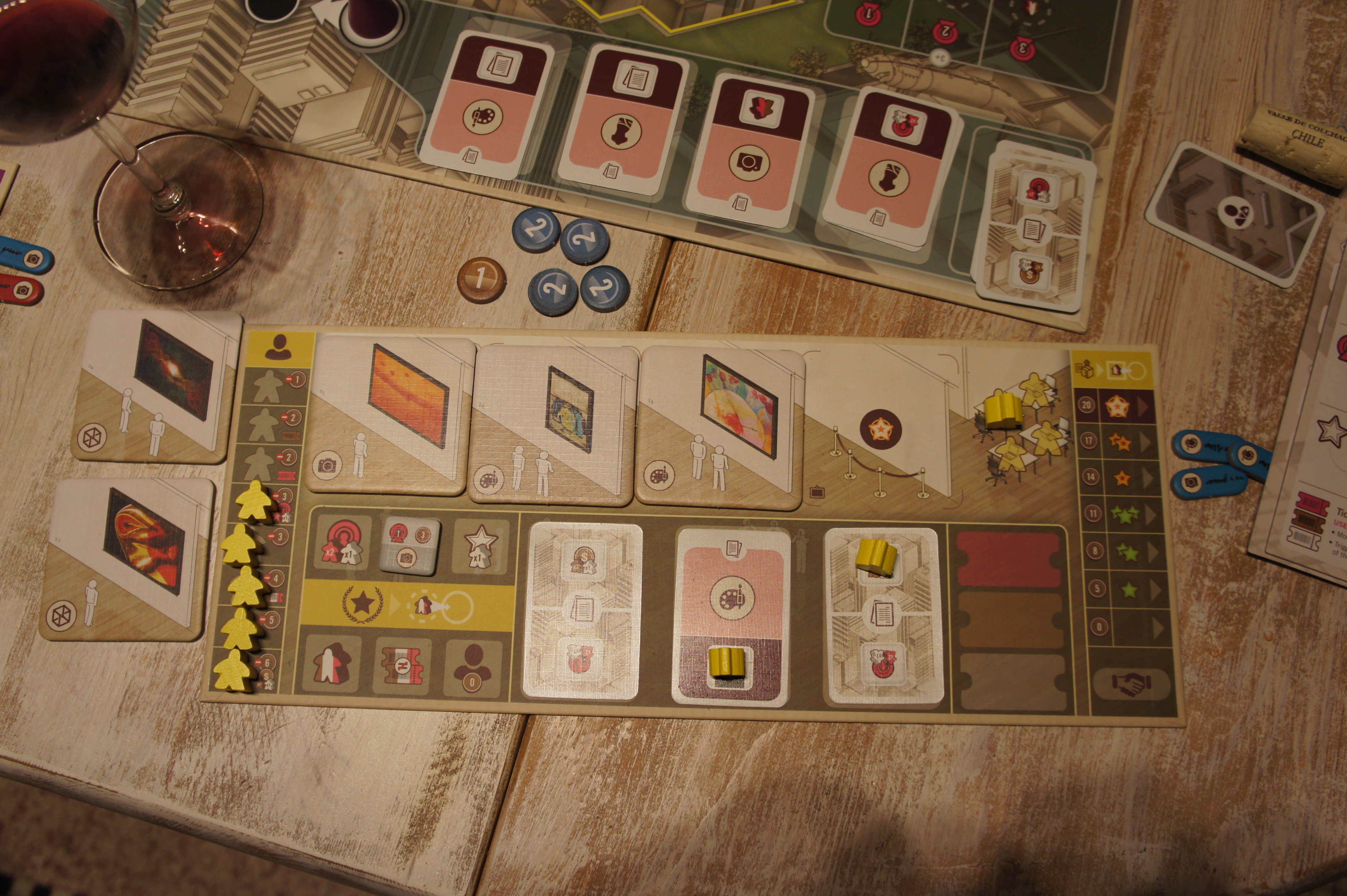 J’ai adoré cette sensation de construction. En fonction de mes cartes objectifs et des tuiles bonus qui étaient sur le plateau j’ai conçu dès le premier tour ce que je voulais faire. Puis l’enchainement des actions a été perturbé par les actions des autres, j’ai pu attendre pour acheter certaines œuvres et me presser vers le marché international car les autres prenaient ce chemin. Puis face à la montée des prix des œuvres j’ai vite découvert un artiste et pris sa commission pour me réserver une de ses œuvres pour plus tard, car elle devait être exposée en fin de partie dans ma galerie. Là un joueur me prend la place tant convoitée au marché international, tant pis j’en prends une autre pour garder une majorité dans ledit marché et les points qui vont avec, du coup je bénéficie d’un bonus inattendu pour ma fin de partie. Au dernier moment je ne fais pas une vente qui devait me rapporter des points, ceci pour garder les œuvres et gagner ces même points en exposition plutôt qu’en vente, j’achète, fais passer un artiste maitre et l’expose et… ho bénéficie du bonus inattendu qui dépendait justement d’une œuvre de maitre…