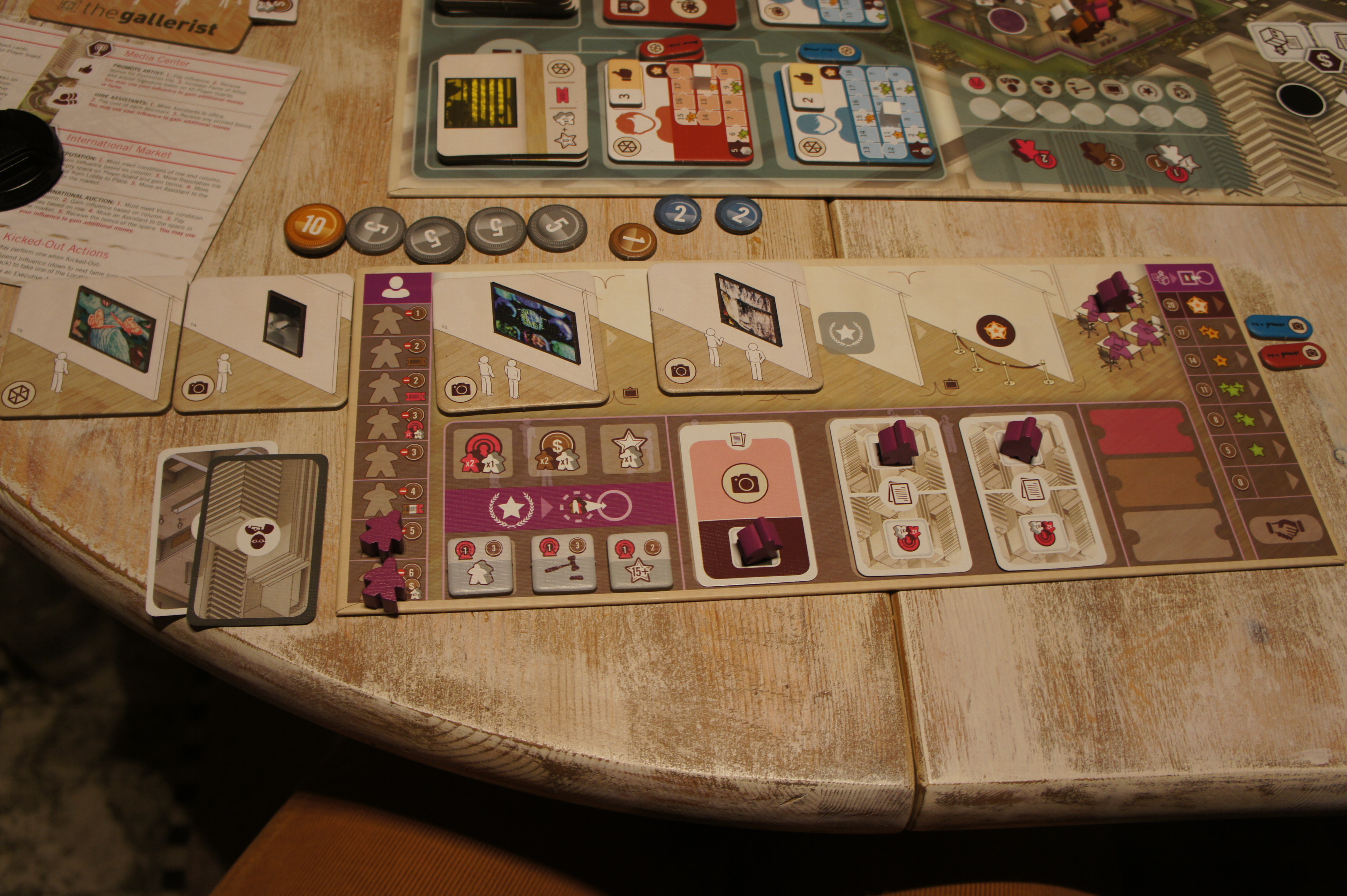 Car les mécanismes aussi sont aux petits oignons. Tout s’enchaine et crée une forte interaction entre les joueurs. On découvre des artistes et les promeut dans les médias pour faire monter leur cote, on achète des œuvres d’art puis on les revend avec des acheteurs sous contrat, on va sur le marché international, on participe à une vente aux enchères de grandes œuvres en fin de partie, que l’on prépare pendant toute la partie (ou pas..), on bénéficie de bonus de réputation, on utilise notre influence, nos assistants, et surtout nous faisons rentrer un maximum de monde dans notre galerie, des collectionneurs, des VIP, des financiers (3 couleurs de Meeple).