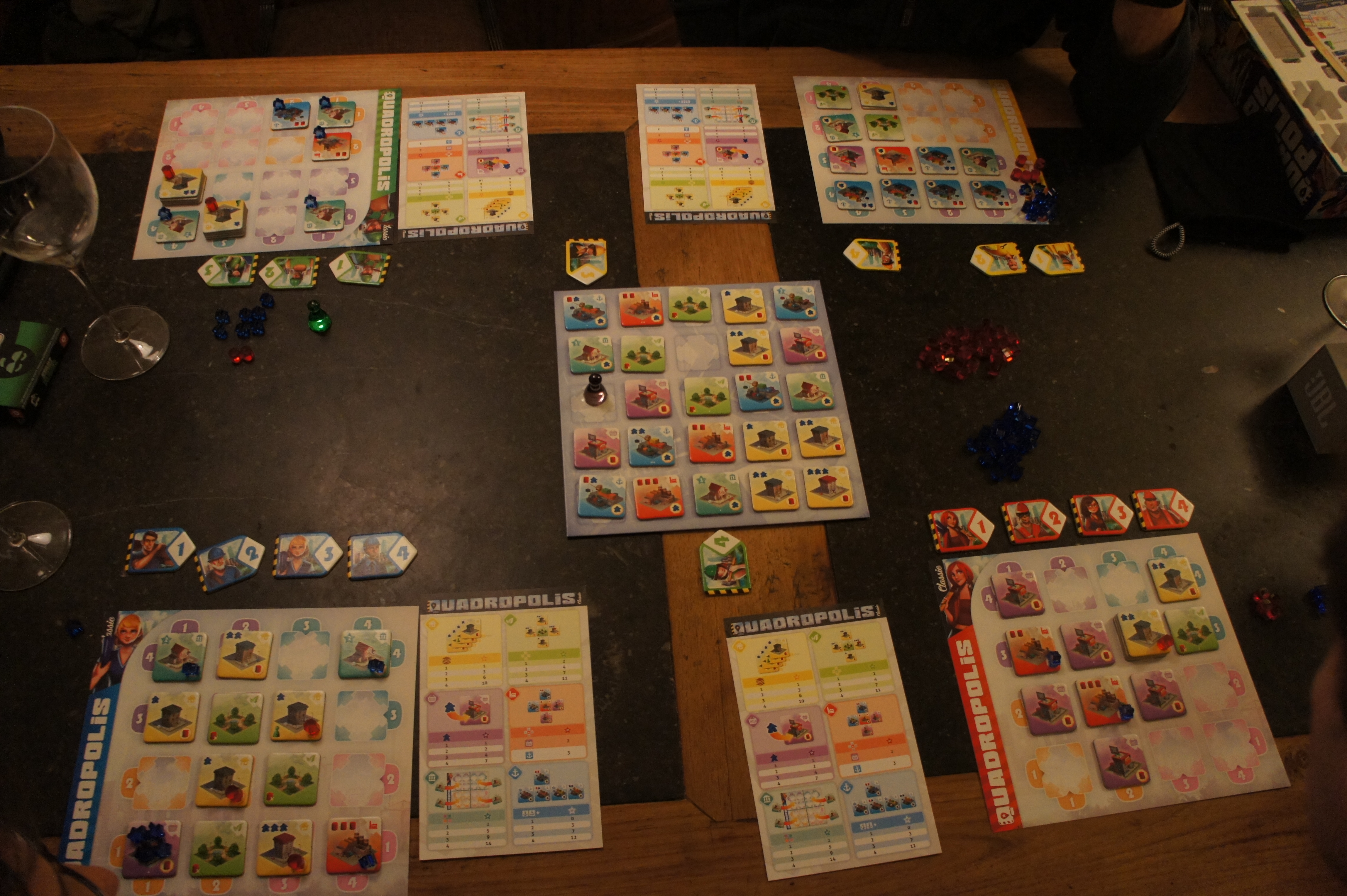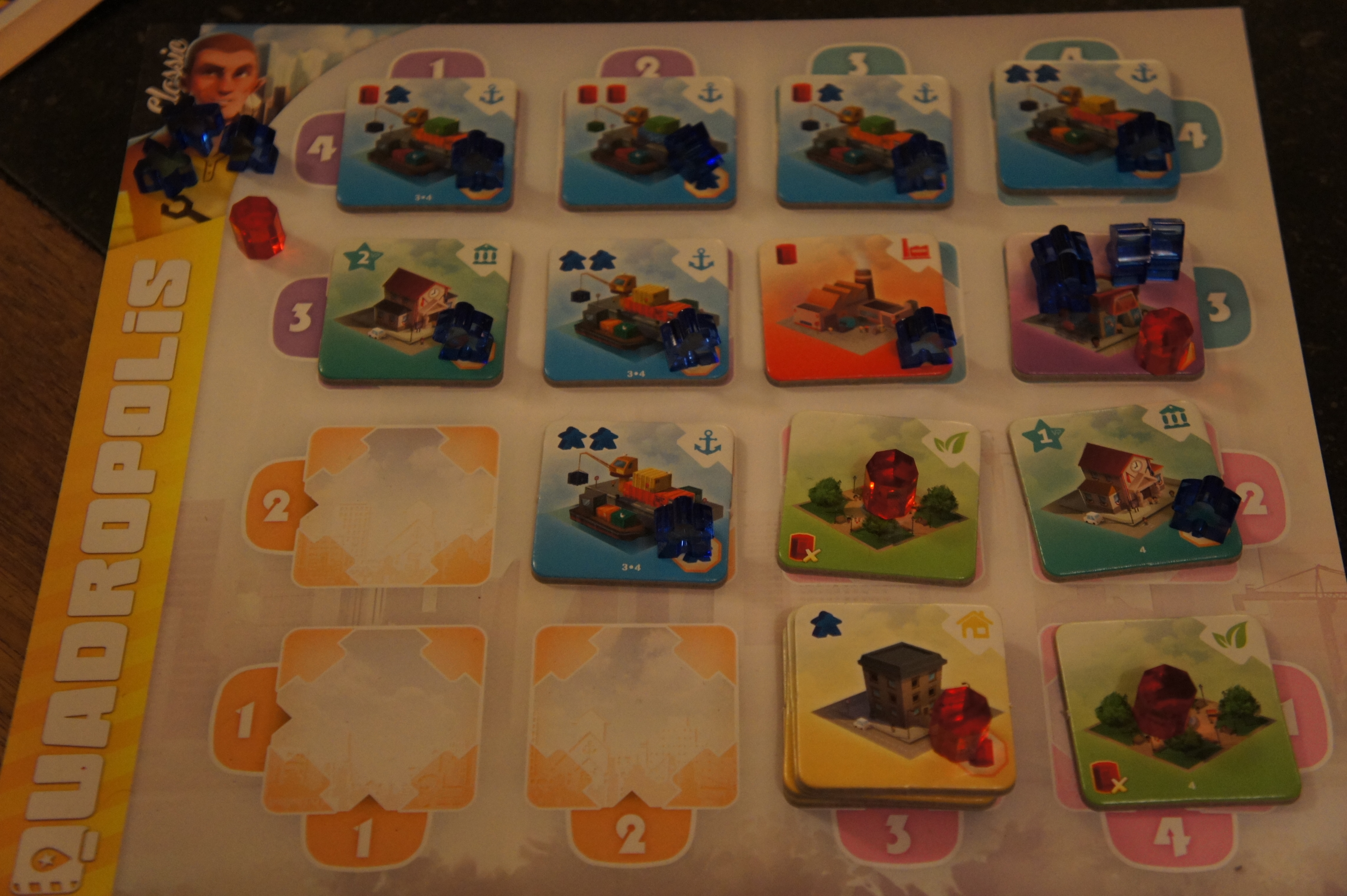 Quadropolis est un jeu stratégique-light, le joueur « expert » s’amusera sans se faire une entorse neuronale, car la stratégie reste tout de même assez simple. Le système est celui archi-classique du jeu de ville : le placement d’un bâtiment influence les bâtiments qui sont à coté. Archi-classique certes mais indispensable dans un jeu de construction de ville, c’est pour cela que c’est sympa, on réfléchi à l’organisation de la ville que l’on construit. L’important est comment cette mécanique est utilisée. Dans Quadropolis c’est simple et efficace, on dispose d’une aide de jeu qui nous récapitule les points gagnés selon les bâtiments qui seront voisins et leur agencement (lignes…). L’originalité de quadropolis vient de la manière dont on va pouvoir prendre les tuiles pour les poser dans sa ville. L’interaction entre joueur est là. Chaque choix d’un joueur réduira celui des autres et plus le tour avance plus cela se réduit, tension tout à fait sympathique et tactique. De plus la population (Meeple) et les barils de pétrole sont comme 2 ressources, produites par certaines tuiles et consommées par d’autre, cela amène un petit mécanisme de gestion agréable et certainement pas casse-neurone, c’est tout doux pour le cerveau mais demande néanmoins une réflexion fort sympathique.