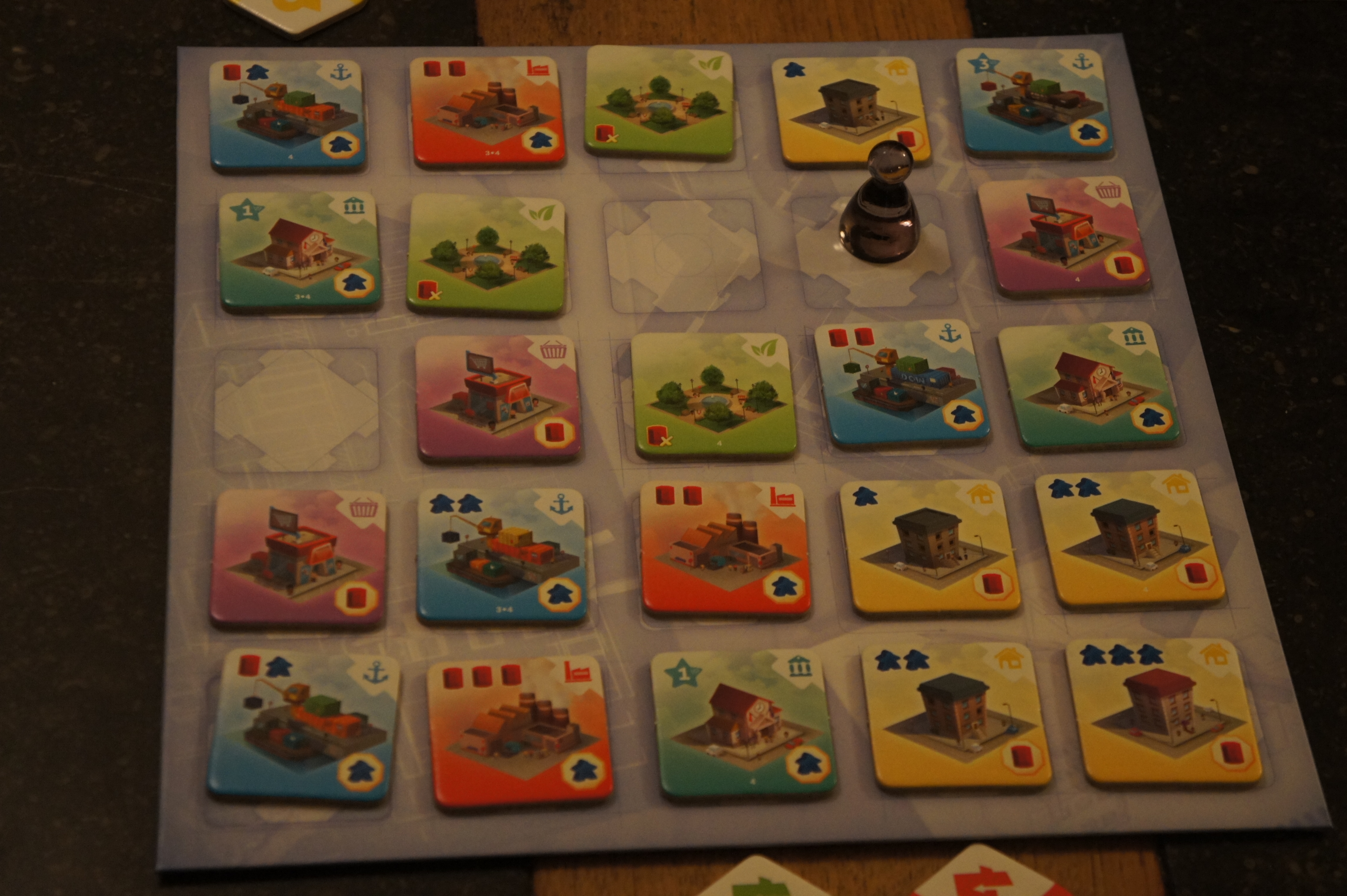 Outre cette gestion de ressources, les bâtiments nécessitent certaines combinaisons entre eux afin d’optimaliser les PVs qu’ils génèrent. Par exemple, au plus on a de bâtiments bleus sur une même ligne/colonne, au plus de PVs ils génèrent. Au plus de bâtiments jaunes on a superposés, au plus de PVs ils génèrent, au plus de bâtiments violets on a adjacents à des bâtiments rouges, au plus de PVs,…