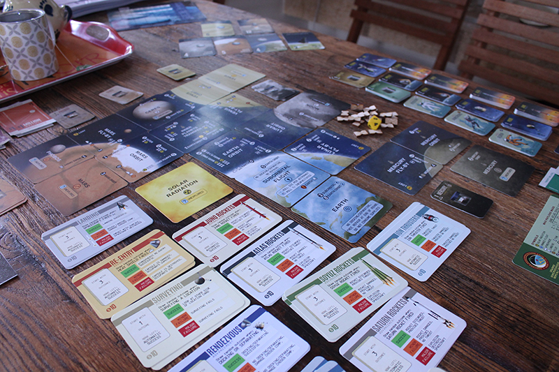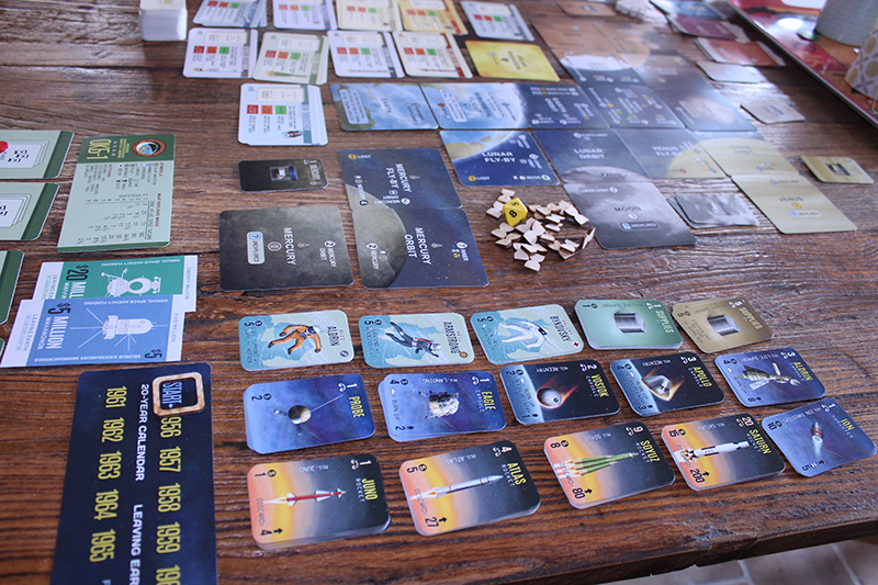On débute avec des missions communes à tous et qui changent bien sûr entre chaque partie. La course à l’espace est lancée, le premier qui réalise une mission empoche le prestige qui va avec (variable selon la difficulté de la mission), les autres n’ont plus qu’à en faire une autre… Le calcul est vite fait  5 à 9 missions en tout (selon la difficulté), on va essayer d’en faire suffisamment pour que les autres joueurs ne puissent pas gagner plus de prestige que soi. On regarde les missions, on décide de celles qui nous intéressent et c’est parti ! A vous de ne pas voir vos plans échouer face à un autre joueur plus prompt à réaliser ce que vous aviez prévu de faire… Sinon il faut changer de plan et la pression monte… Surveillez vos concurrents !