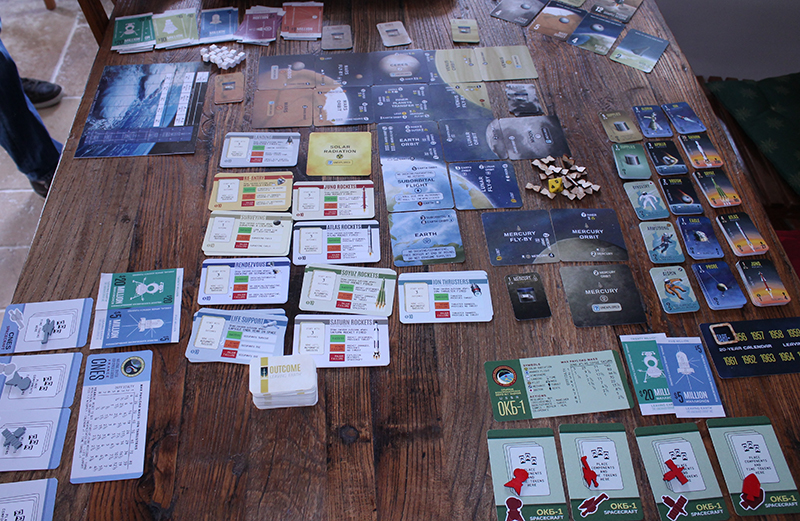 Ma dernière partie : je prévois d’honorer 2 missions : Aller observer Mars puis ramener un échantillon de Phobos, voilà qui m’a occupé toute la partie (2 joueurs, ces 2 missions représentaient un peu plus de la moitié du prestige de toutes les missions proposées).  Et j’ai perdu… Pourquoi ? Parce-qu’ayant longuement tout bien planifié j’ai oublié qu’ensuite aller sur Mars c’est 3 ans, revenir ? 3 ans… Ma mission s’est fini en 1977, la partie en 1976, mon adversaire qui avait envoyé des sondes de-ci de-là (et tué un astronaute …)  a doucement sourit en voyant ma tête lorsque la fin de partie a sonné et que mes échantillons étaient encore en transit inter-planétaire direction la Terre…