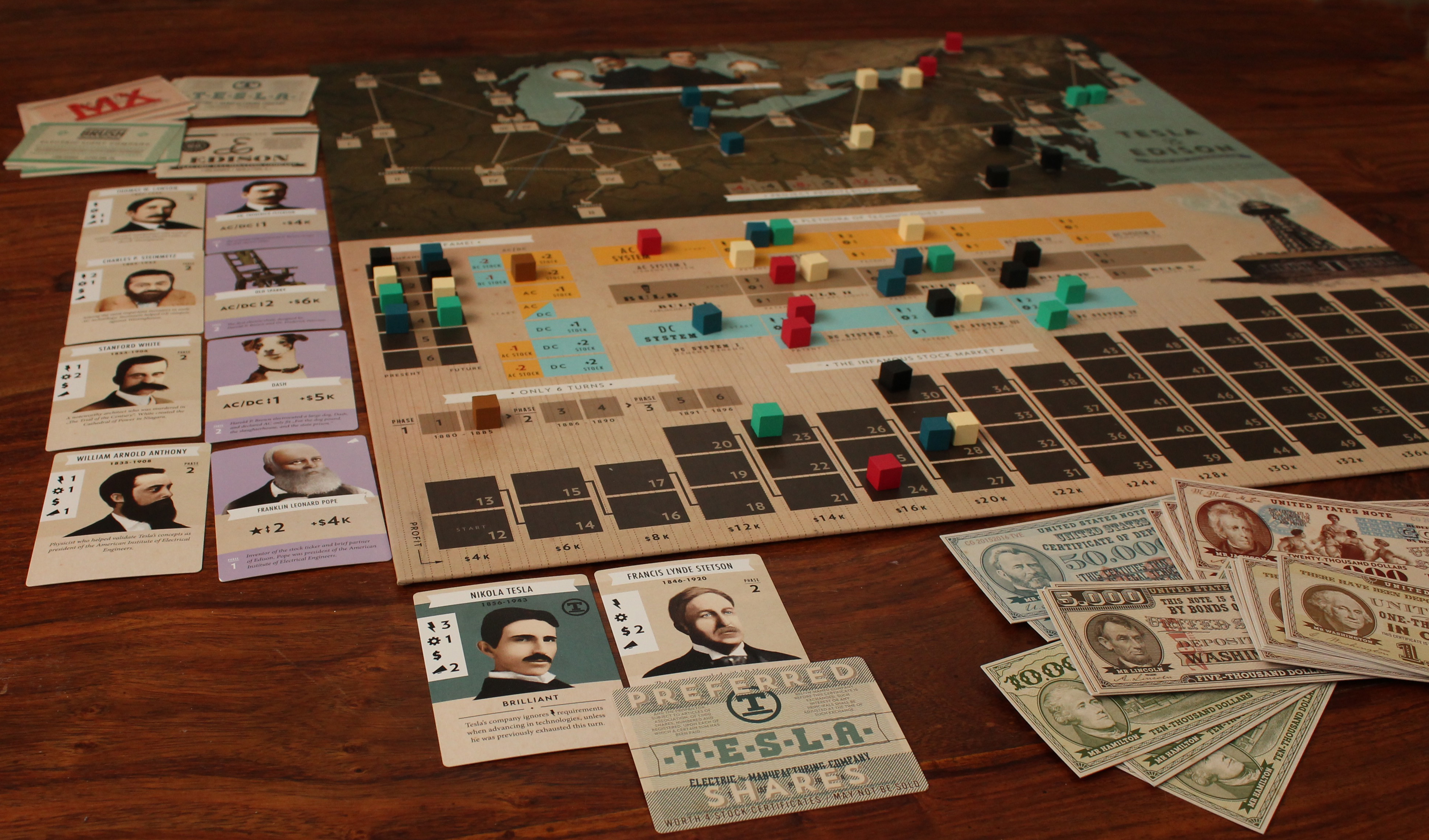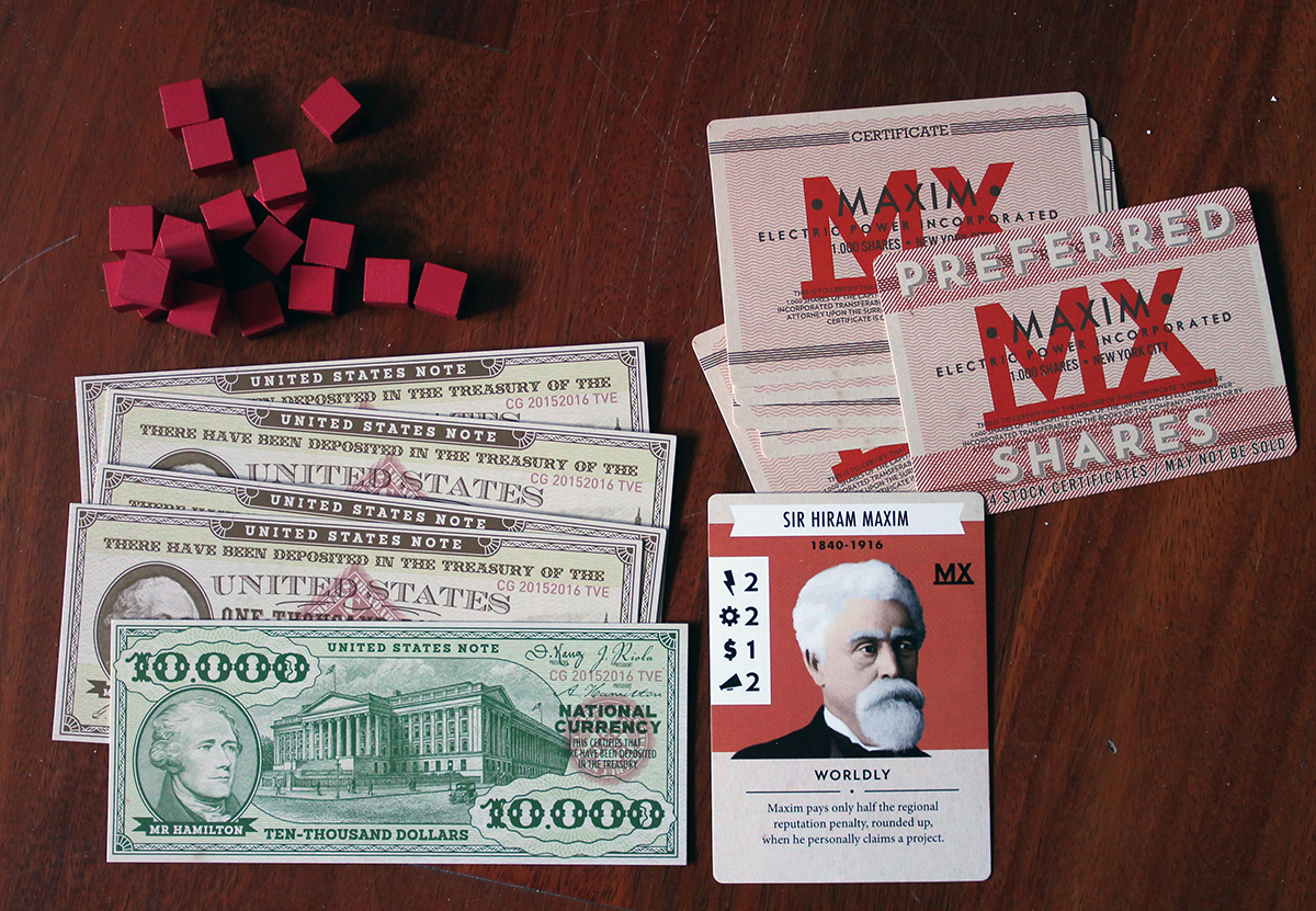 Nous voilà plongé dans cette guerre concurrentielle. Chaque joueur est un investisseur qui va prendre sous son aile une grande célébrité de l’époque (dans le domaine de l’électricité pas du cinéma…) ainsi que son entreprise et affronter la concurrence des autres joueurs afin de finir en fin de partie avec… Le plus gros portefeuille boursier…