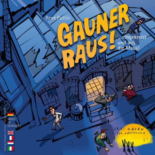 Gauner Raus est un petit jeu de déduction familial.  Le but est de découvrir l’endroit où se cachent un maximum de voleurs dans l’immeuble quadrillé comme un damier.