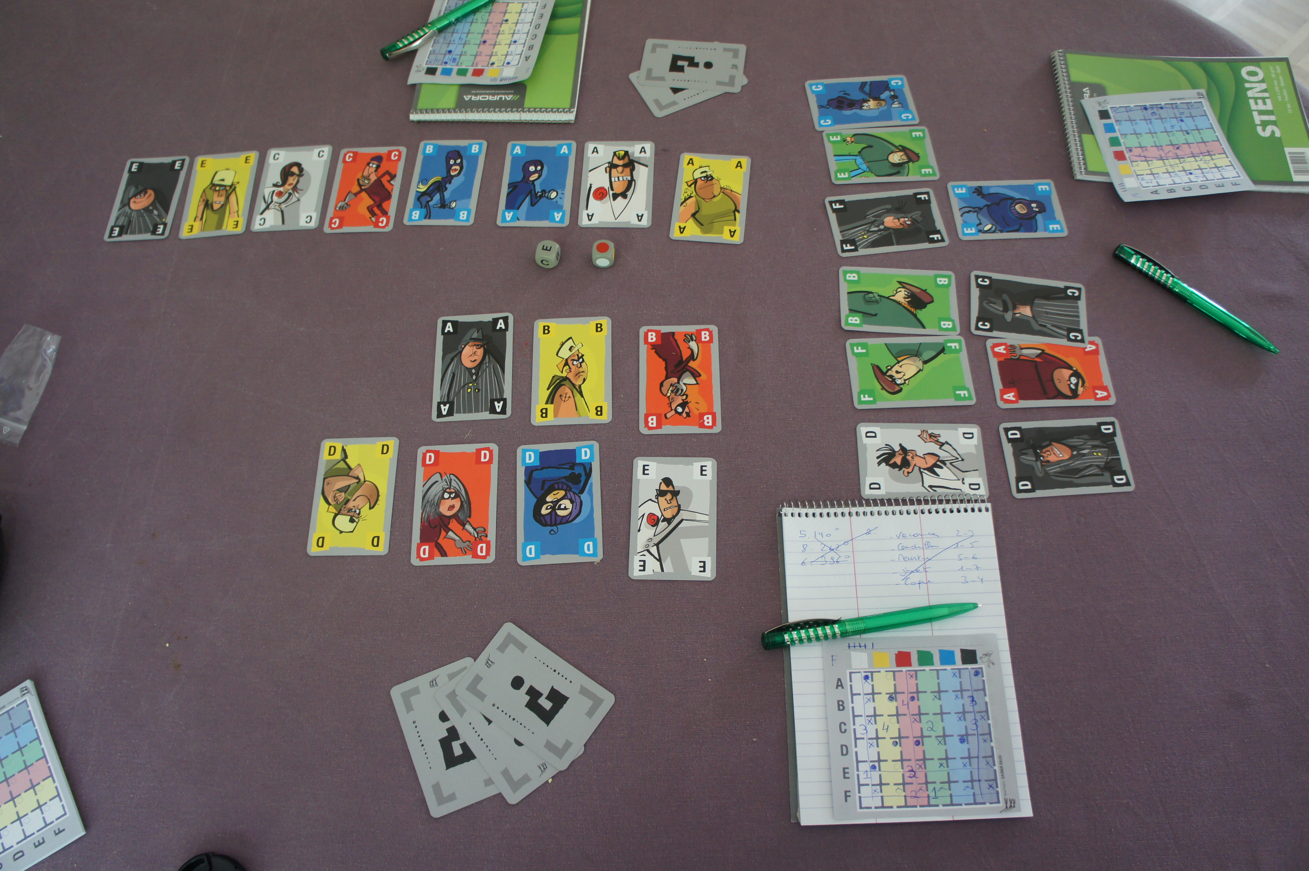 Le principe est assez simple et ingénieux.  On distribue les cartes entre les joueurs.  Ces cartes représentent des voleurs et ont 2 indications qui montrent où ils se cachent dans l’immeuble bien quadrillé : une lettre qui indique la colonne où il se trouve et une couleur qui indique la ligne : au croisement de cette ligne et de cette colonne se trouve le voleur en question.