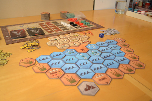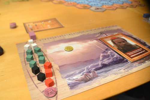 -Le village viking où le joueur va pouvoir passer du temps pour acquérir différentes ressources pour se préparer au long voyage qui l’attend. Chaque action va lui coûter un certain temps, il ne faudra pas qu’il s’attarde de trop dans le village. Il va placer toutes les ressources acquises sur les emplacements limités de son bateau. C’est là une des gestions intéressantes du jeu : ne pas dépenser trop de temps au village tout en choisissant les bonnes ressources à emporter pour notre voyage. Evidemment, on a envie de tout prendre mais on ne sait pas…