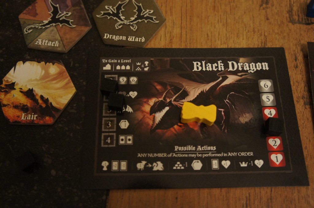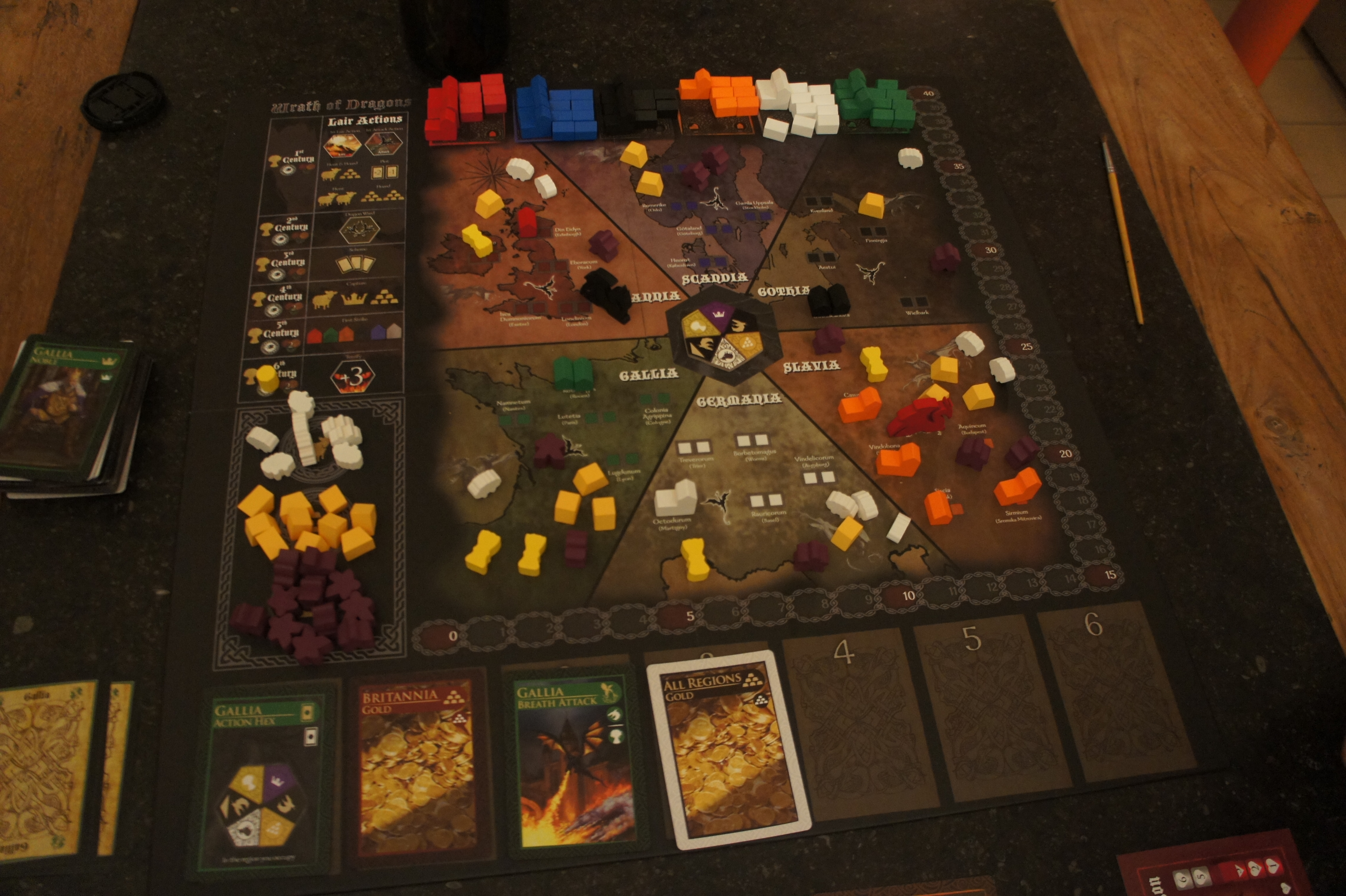 Les joueurs vont jouer les cartes qu’ils ont précédemment acquises pour réaliser leurs actions. Chaque carte est associée à une des 6 régions et pour pouvoir jouer une carte il faut que son dragon soit situé sur la région correspondante. Les cartes vont permettre de récolter des ressources ou d’attaquer les villages/villes/cités. La mécanique d’attaque est quant à elle très Allemande: un village fait perdre un point de vie, une ville et une cité en font perdre 2 à votre dragon. Et c’est tout, vous le détruisez un point c’est tout! Pas de jets de dés ni d’autres subterfuges aléatoires. Ce qui ne veut pas dire que l’aléa n’est pas présent bien entendu. Il est présent à 2 endroits: d’abord dans la désignation des régions qui vont voir leurs villages grossir et puis dans la pioche des cartes fort hasardeuse. Et c’est là où Wrath of Dragons pourra déplaire à certains. A l’exception d’une carte par tour, toutes les autres cartes seront piochées au hasard (souvent vous en piocherez 2 et en défausserez une). Et c’est pas très cool car c’est le jeu de la carte qui