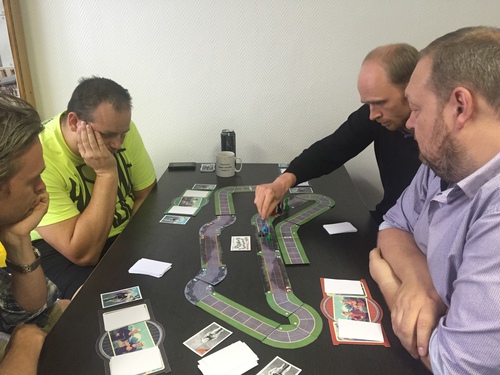 1337-essen-39-flamme-rouge-1J’adooore les jeux de course cycliste!  Ca me fait trop penser à mes parties endiablées d’Eddy Merckx de mon enfance.  Celui-ci semble assez simple.  Vous devez gérer 2 cyclistes: un rouleur et un sprinter.  Et il n’y a pas de dé…
