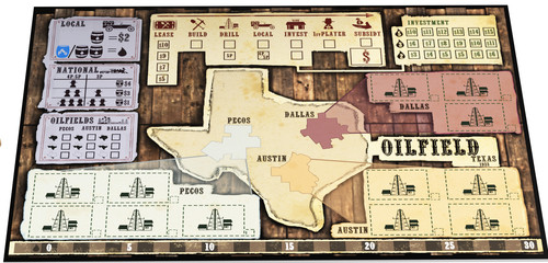 Jeu sur le pétrole avec une combinaison de mécanismes interessante: choix simultanés, enchères « à la five tribes », placement d’ouvriers et contrôle de zones.