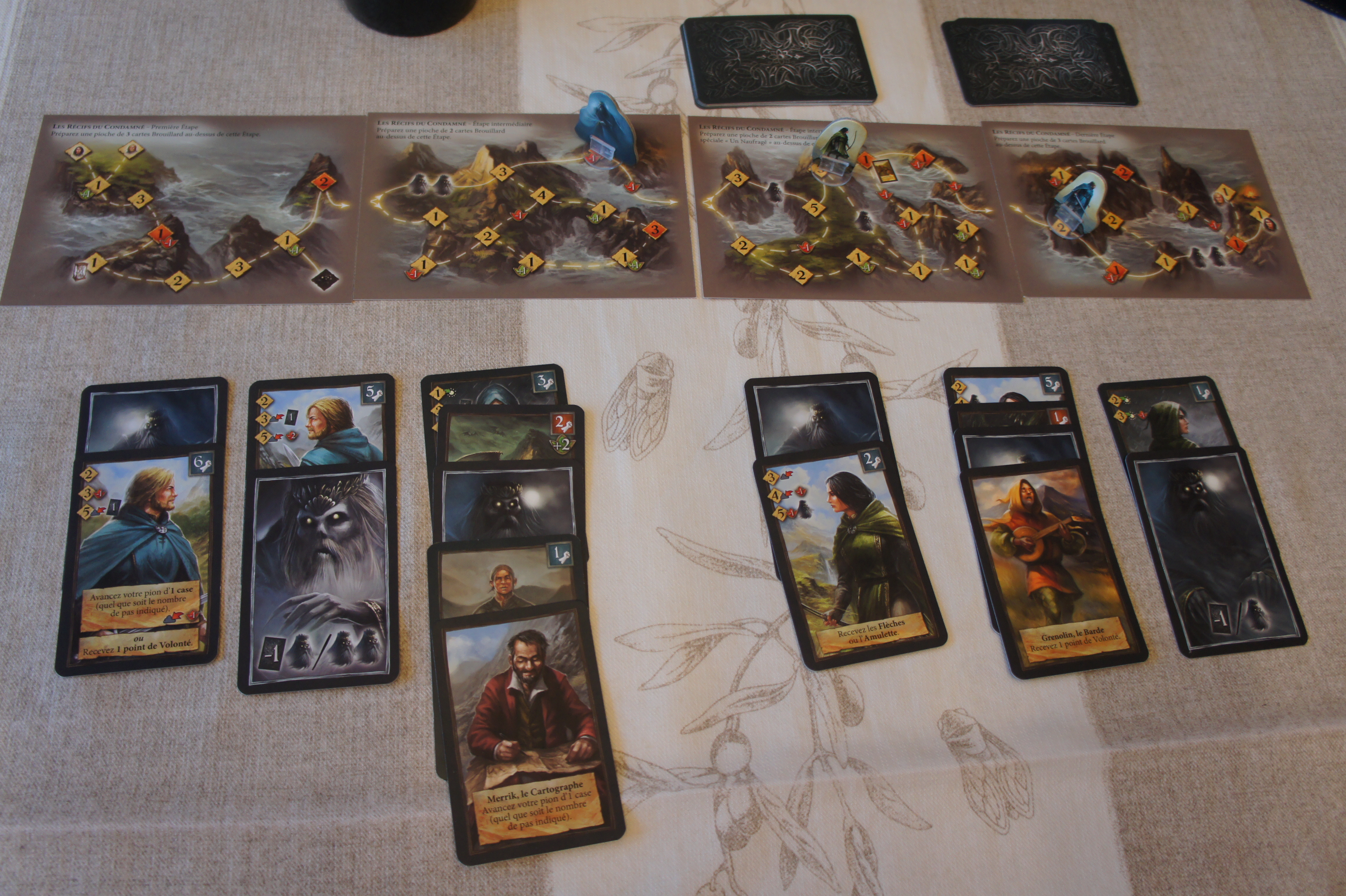 Et l’aventure ? ça marche très très bien, grâce à la petite mécanique maline de mini deck building. Car plus le jeu avance et plus les cartes qui remontent de nos decks sont des vacheries, des rencontres que l’on voudrait bien éviter… En plus on fatigue, le fait de retourner nos cartes nous fait avancer moins vite, du coup le ressenti est très très sympa : on commence une petite balade tranquille, les mouettes tout ça… puis la malédiction surgit… ha… bon va falloir gérer, on est moins tranquille… Puis on commence à mettre des cartes brouillard dans nos deck et des monstres débarquent de plus en plus… Plus on avance dans l’île plus la tâche devient dangereuse et plus difficile jusqu’au dénouement final qui normalement se fera dans un ouf… Ouf… heureusement on est arrivé vu les cartes qui suivaient… ouf… on est arrivé, encore 2 tours et on se prenait la malédiction. Un vrai film d’aventure Hollywoodien, en tout cas ce fut mon ressenti et j’ai vraiment aimé.