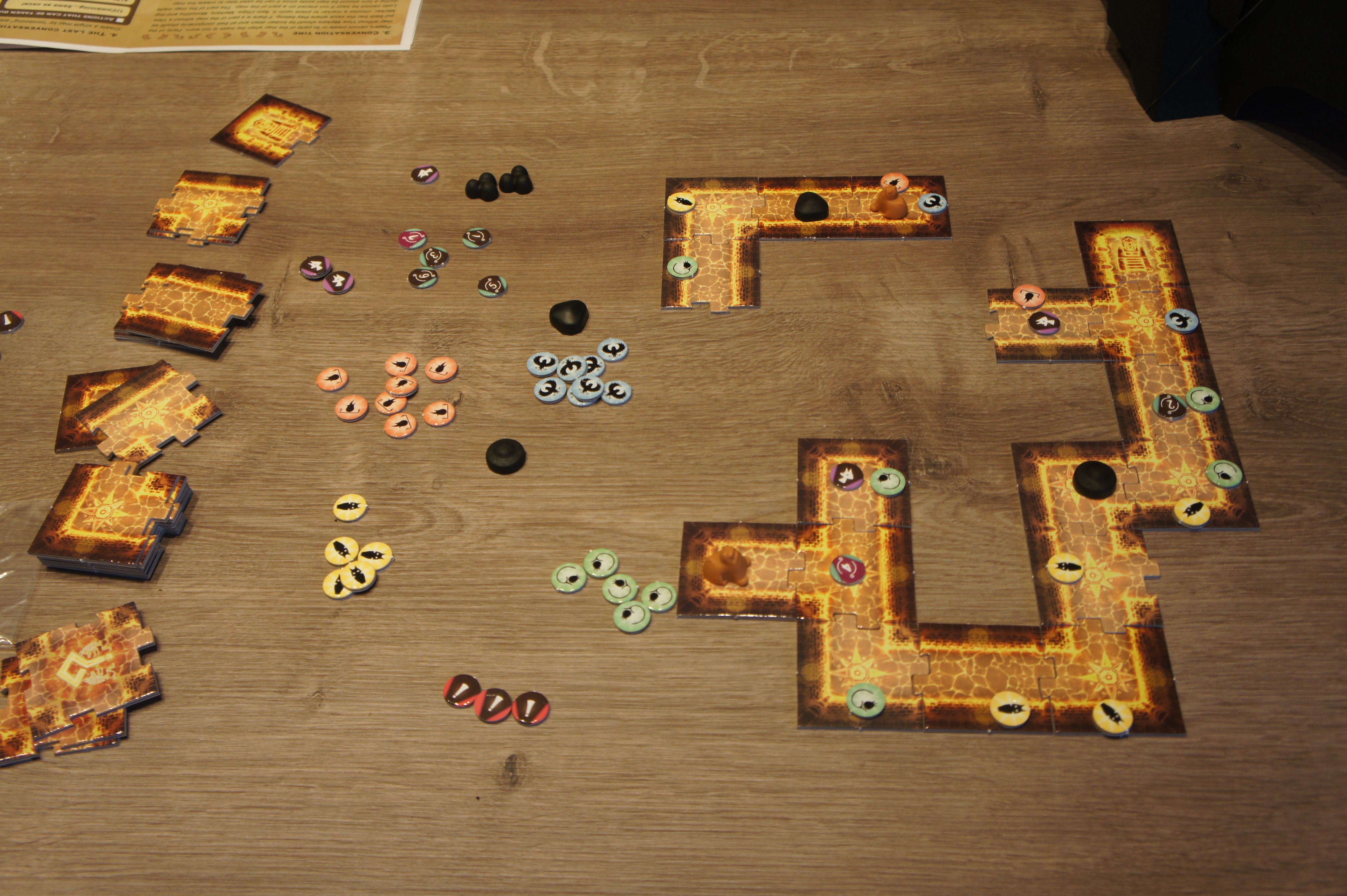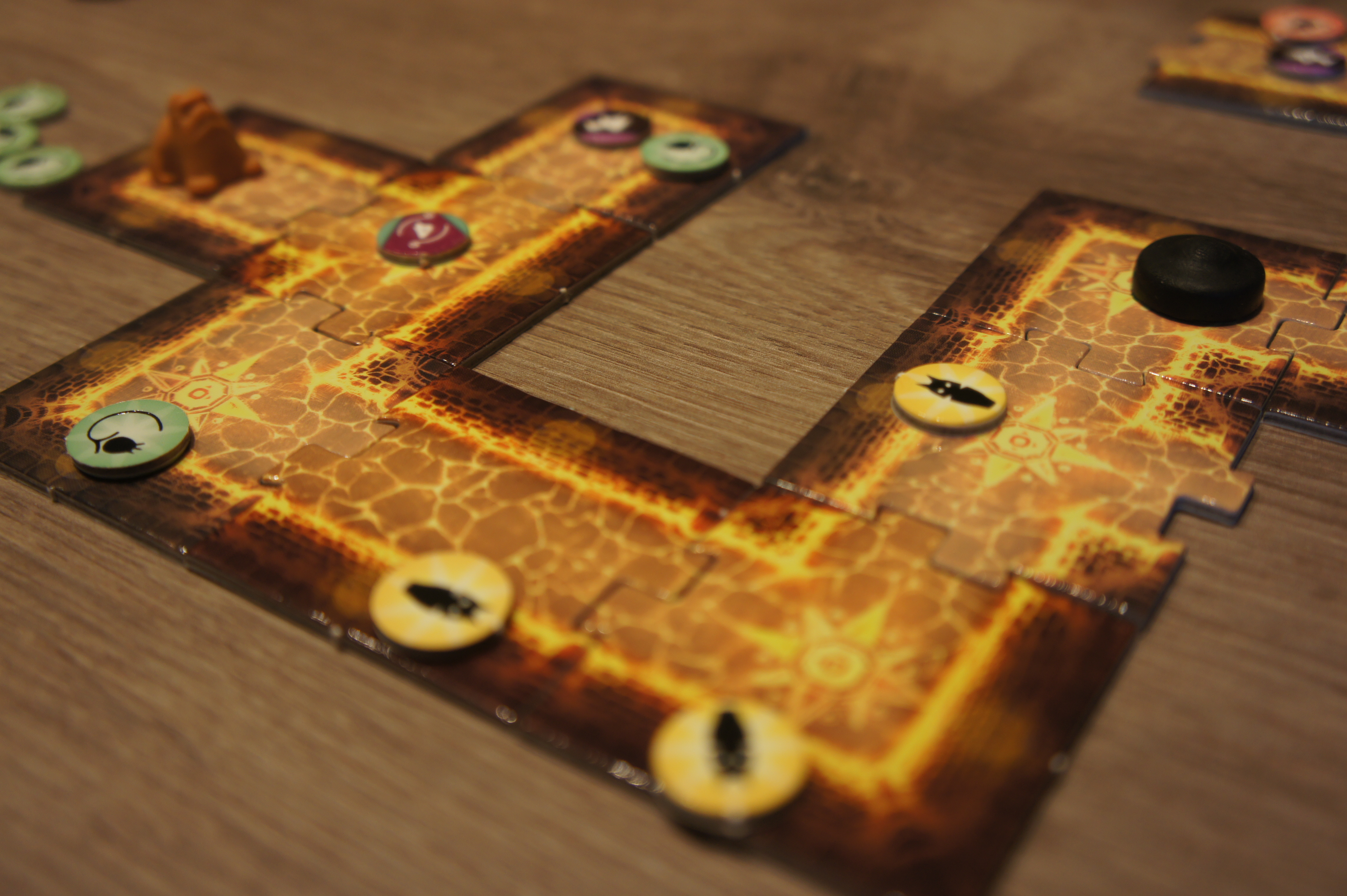 Les joueurs vont jouer chacun à leur tour et, à son tour, on insère le smartphone dans le masque d’Anubis, on lance l’app en regardant en l’air et « pouf » on se retrouve au milieu du labyrinthe.  On a alors 60 secondes pour décrire ce qu’on voit aux autres joueurs.  C’est du style : je suis sur une dalle avec 2 ouvertures : devant et derrière.  A ma gauche, un mur vierge, à ma droite, un mur avec une peinture dessus.  Derrière, un cul de sac avec le chien.  Devant, une dalle droite avec une sculpture sur le mur de gauche puis une dalle en coin donnant sur la gauche.  Sur le sol de cette dalle, un artéfact rond noir et sur la dalle à sa gauche, je vois une fleur et une torche…  Pendant qu’il décrit ce qu’il voit, les autres joueurs, à l’aide des tuiles et des différents éléments de décors vont reconstruire le labyrinthe.  Quand vient le tour du joueur suivant, lui aussi va être plongé dans le labyrinthe mais à un autre endroit.  Il va décrire ce qu’il voit