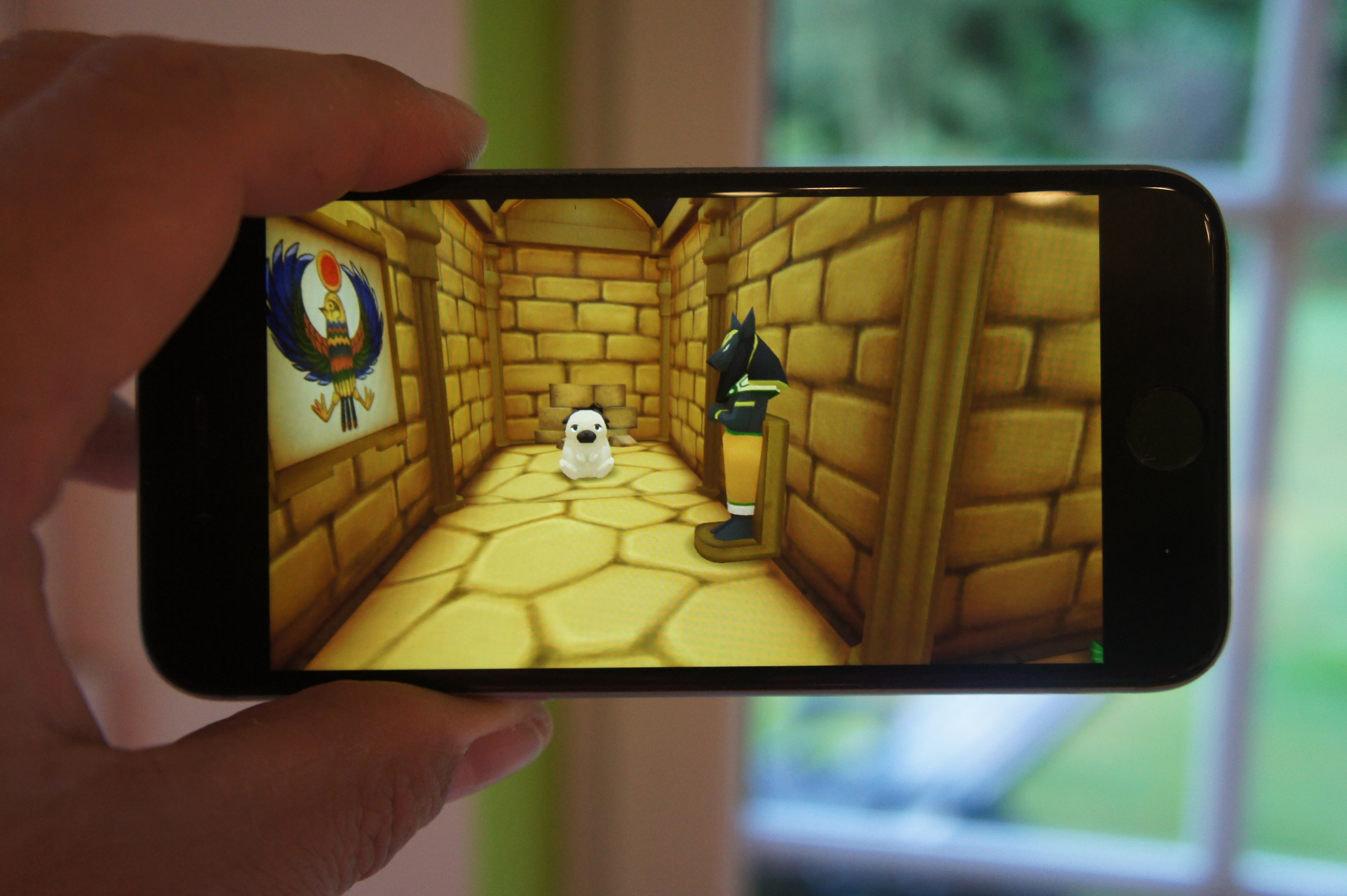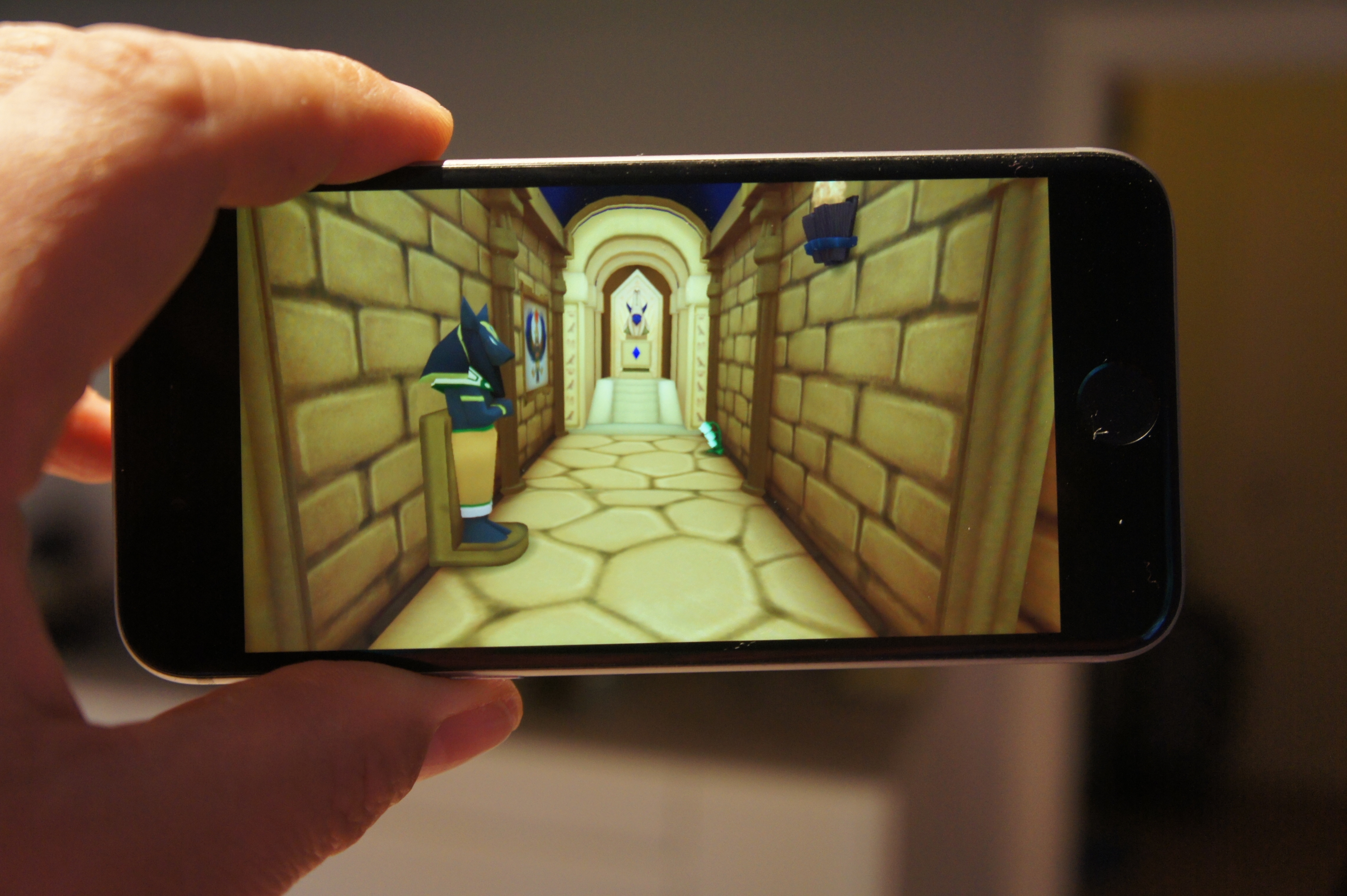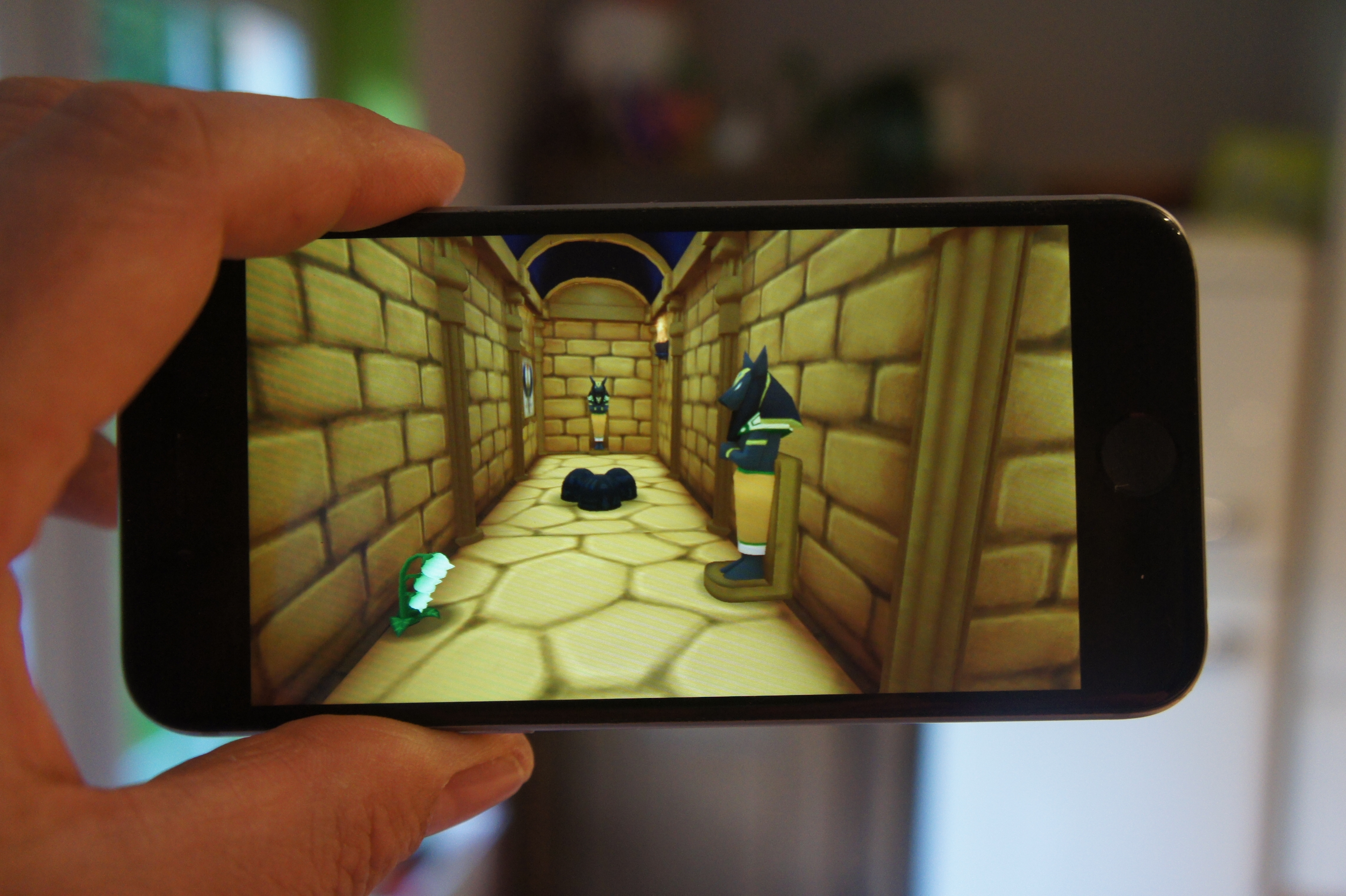 SONY DSCégalement, et les autres vont reconstituer une nouvelle partie de labyrinthe.  On va faire ça quelques fois (le nombre de point de vues différents varie en fonction de la difficulté du niveau).  Ensuite, les joueurs vont tenter, ensemble, d’assembler le labyrinthe grâce aux éléments du décor.  Quand ils remarquent que certains éléments sont comparables sur deux portions de labyrinthe différentes, il vont assembler ces portions pour, au final, arriver à un seul labyrinthe assemblé.  Les joueurs vont alors guider le chien dans le labyrinthe pour le conduire au sarcophage du pharaon.  Ils vont comparer leur réponse à celle de l’app qui indiquera la réussite ou la défaite de l’équipe.