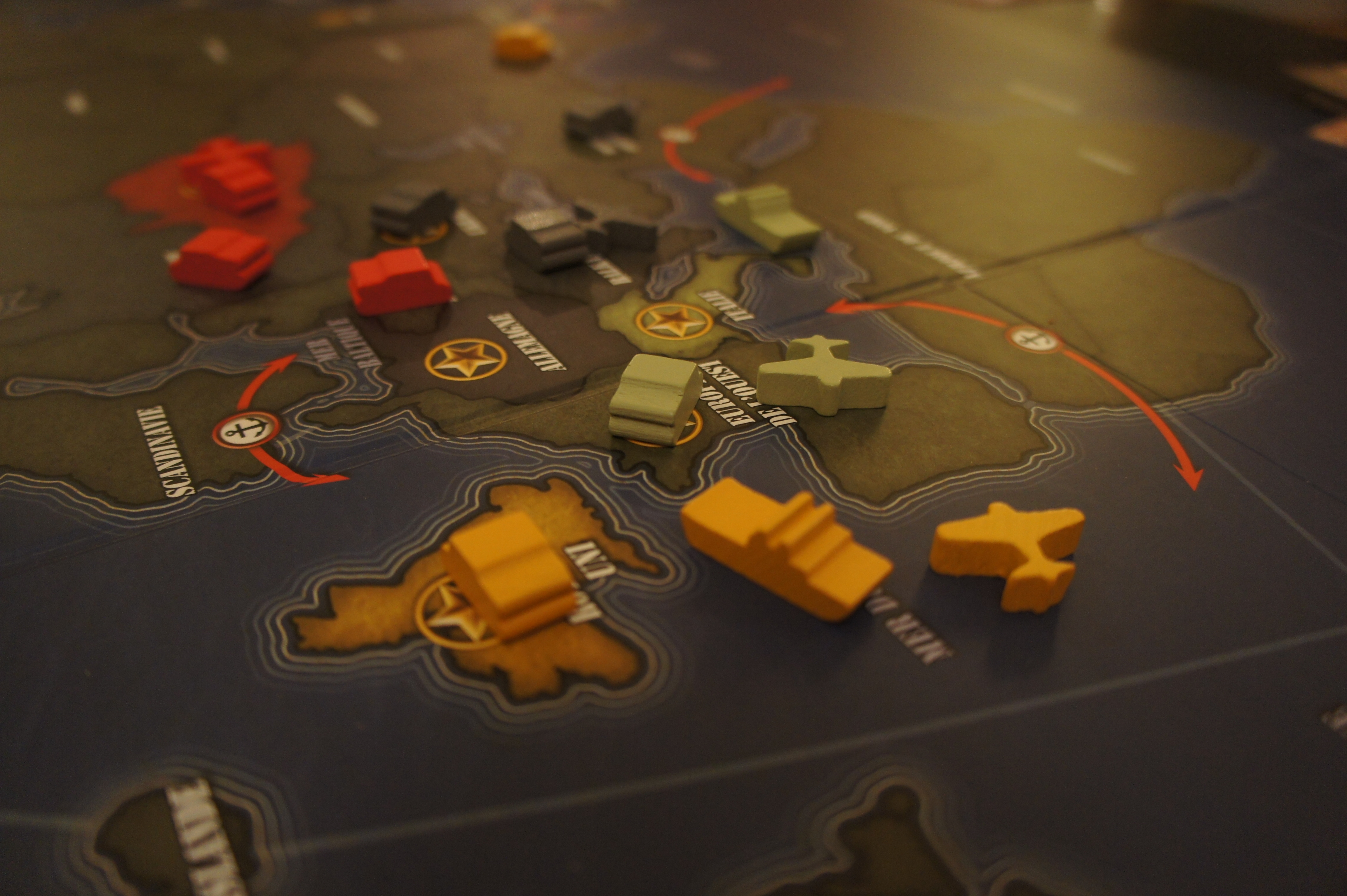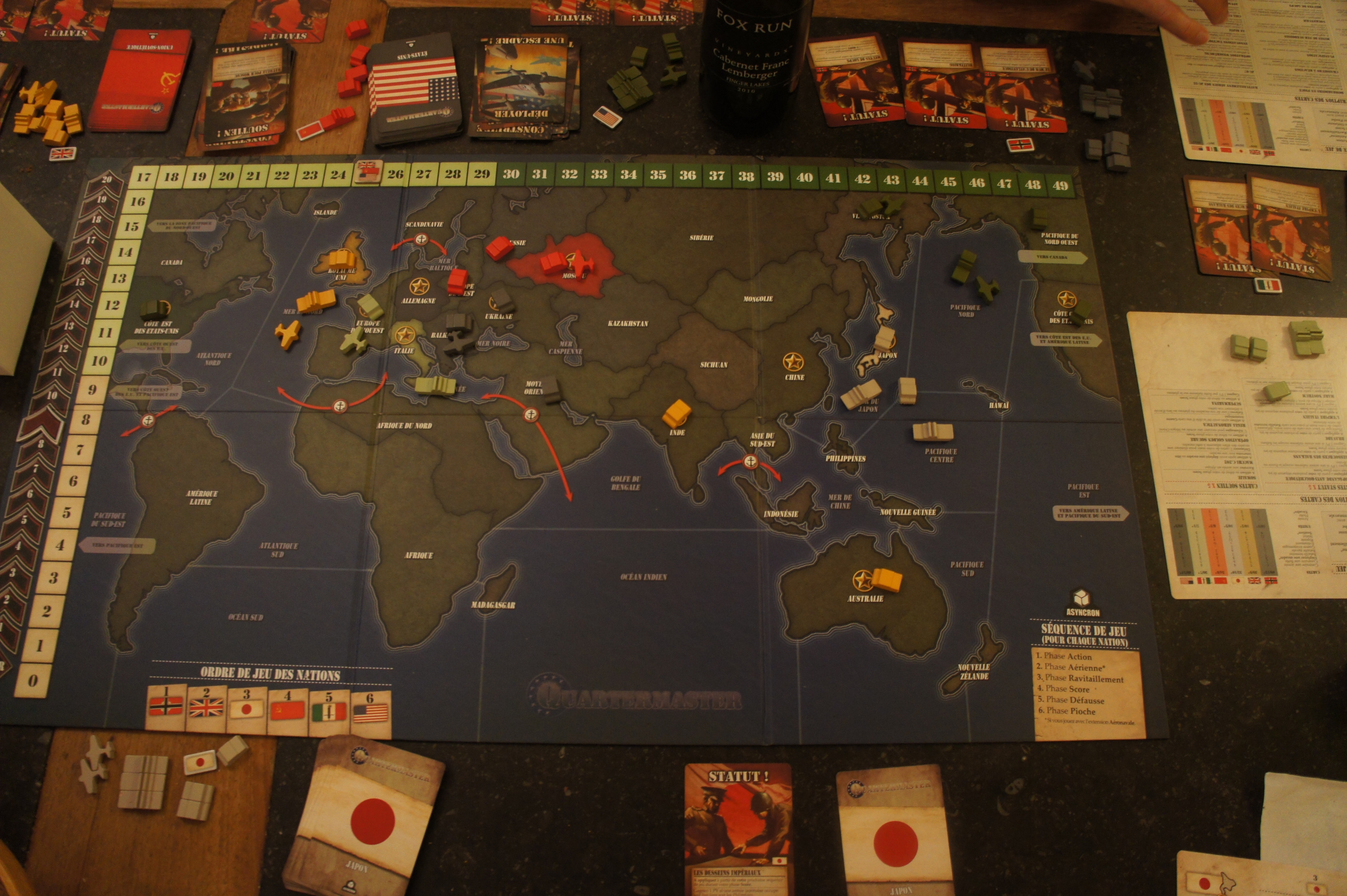 Chaque joueur, et c’est là le coeur du jeu, a un deck de cartes prédéterminé, dans lequel il va sélectionner son deck pour la partie. Chaque carte représente une action (attaque terrestre, attaque navale, attaque aérienne, puisqu’on a joué avec l’extension Air Marshal, action spéciale, carte donnant des points de victoire…). Les decks sont évidemment différents par pays, et seront fonction des forces et faiblesses de chacun. Les faces de citron auront par exemple plus de cartes attaques navale, alors que les macaronis auront plus de cartes attaque terrestre. La manière de joueur chaque puissance sera donc fortement orientée par votre deck, reflétant en ça la vérité historique.