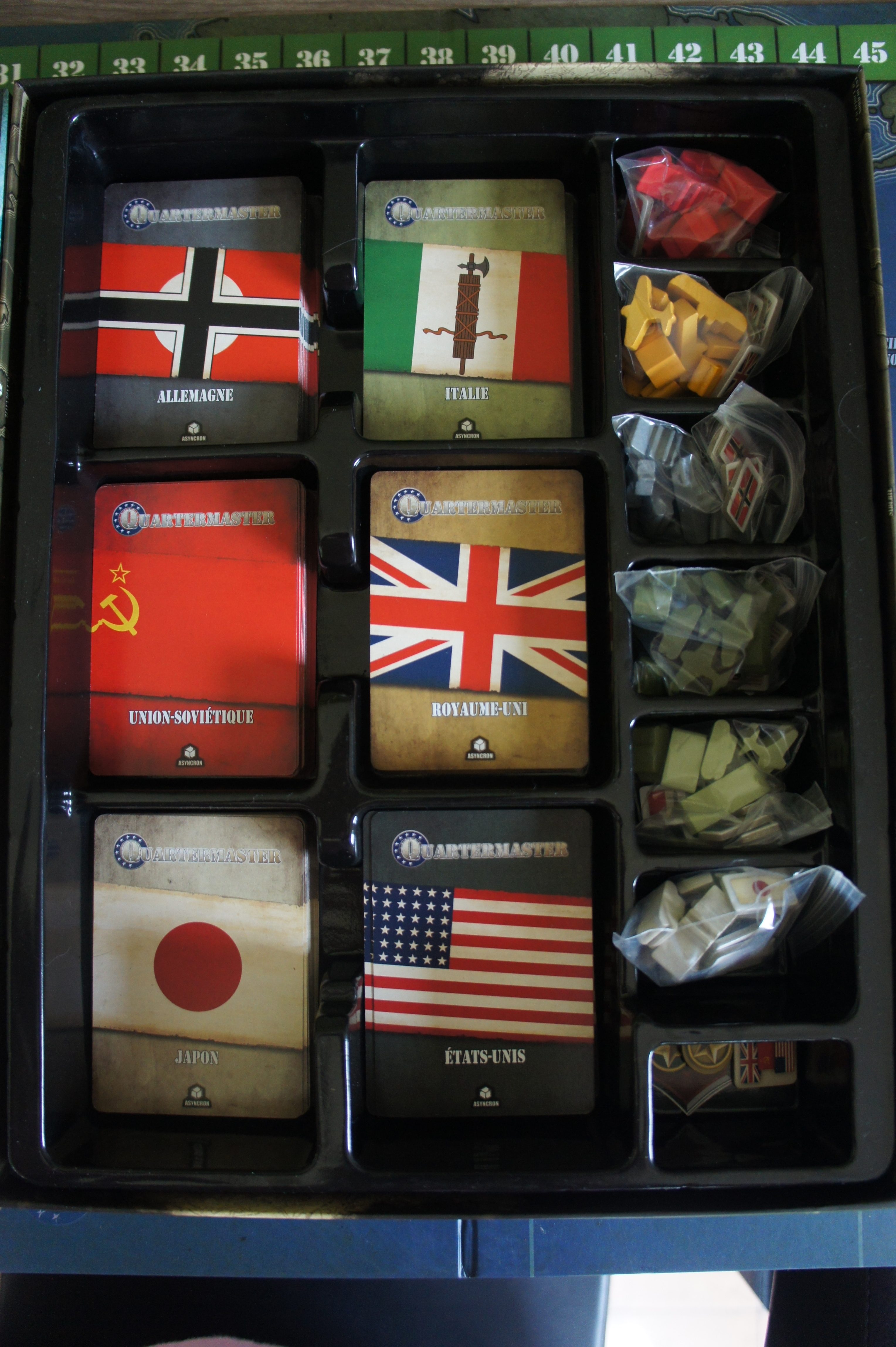 Le thème de la seconde guerre mondiale transpire dans Quartermaster General. Les joueurs vont se répartir les 6 nations principales de cette guerre : l’Allemagne, le Japon et l’Italie pour l’Axe, les Etats Unis, l’Angleterre et la Russie pour les Alliés. Au moins de joueurs on est, au plus de nations d’un même camp un seul joueur jouera. A 3 joueurs par exemple, un joueur va jouer 3 nations tandis que les 2 autres joueurs se répartiront les 3 nations de l’autre camp, 2 pour un joueur et 1 nation pour le dernier. Ce type de répartition n’est pas idéale puisque chaque nation joue à son tour et le joueur ne jouant qu’une seule nation ne jouera qu’une fois sur 6…