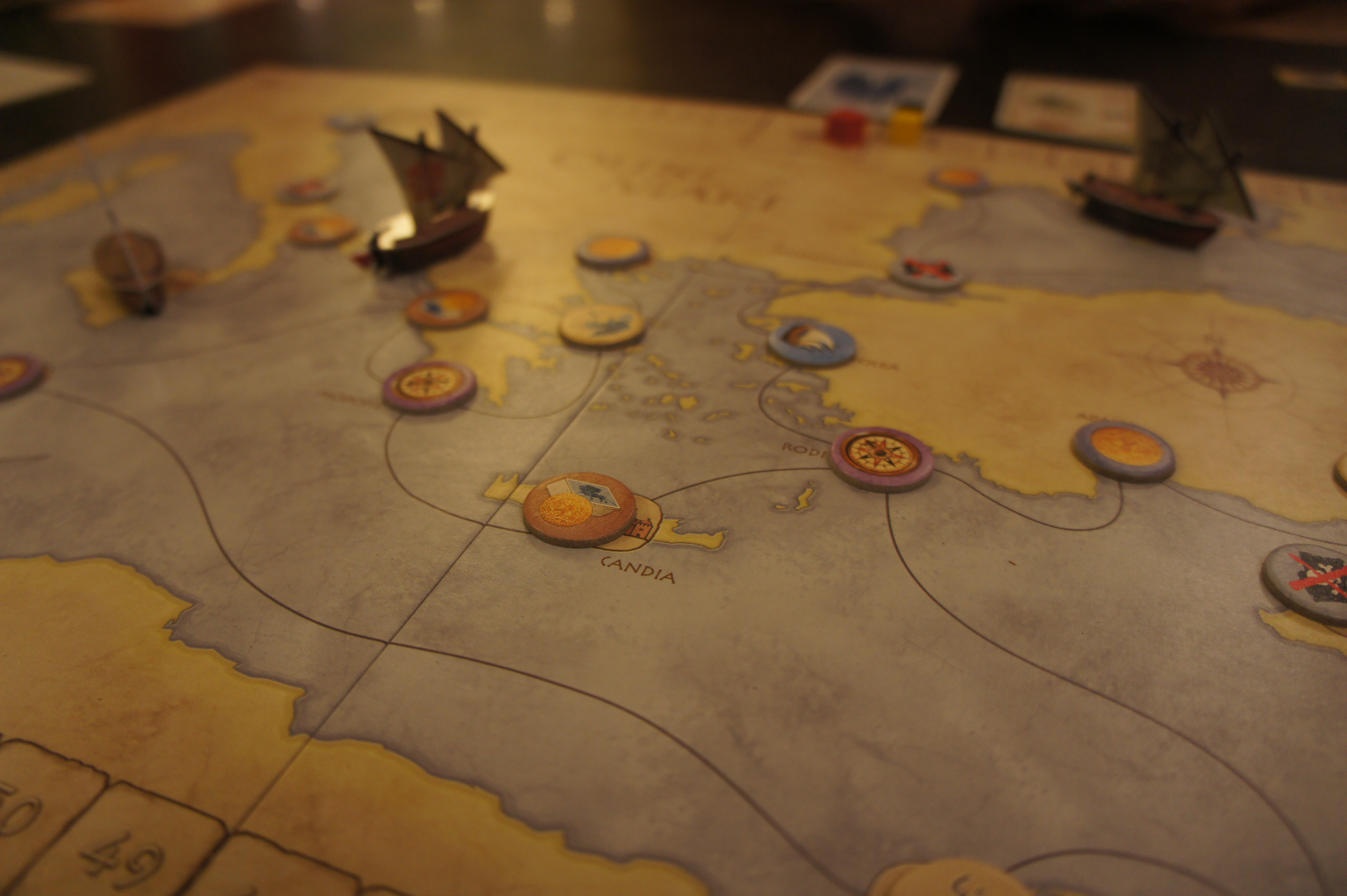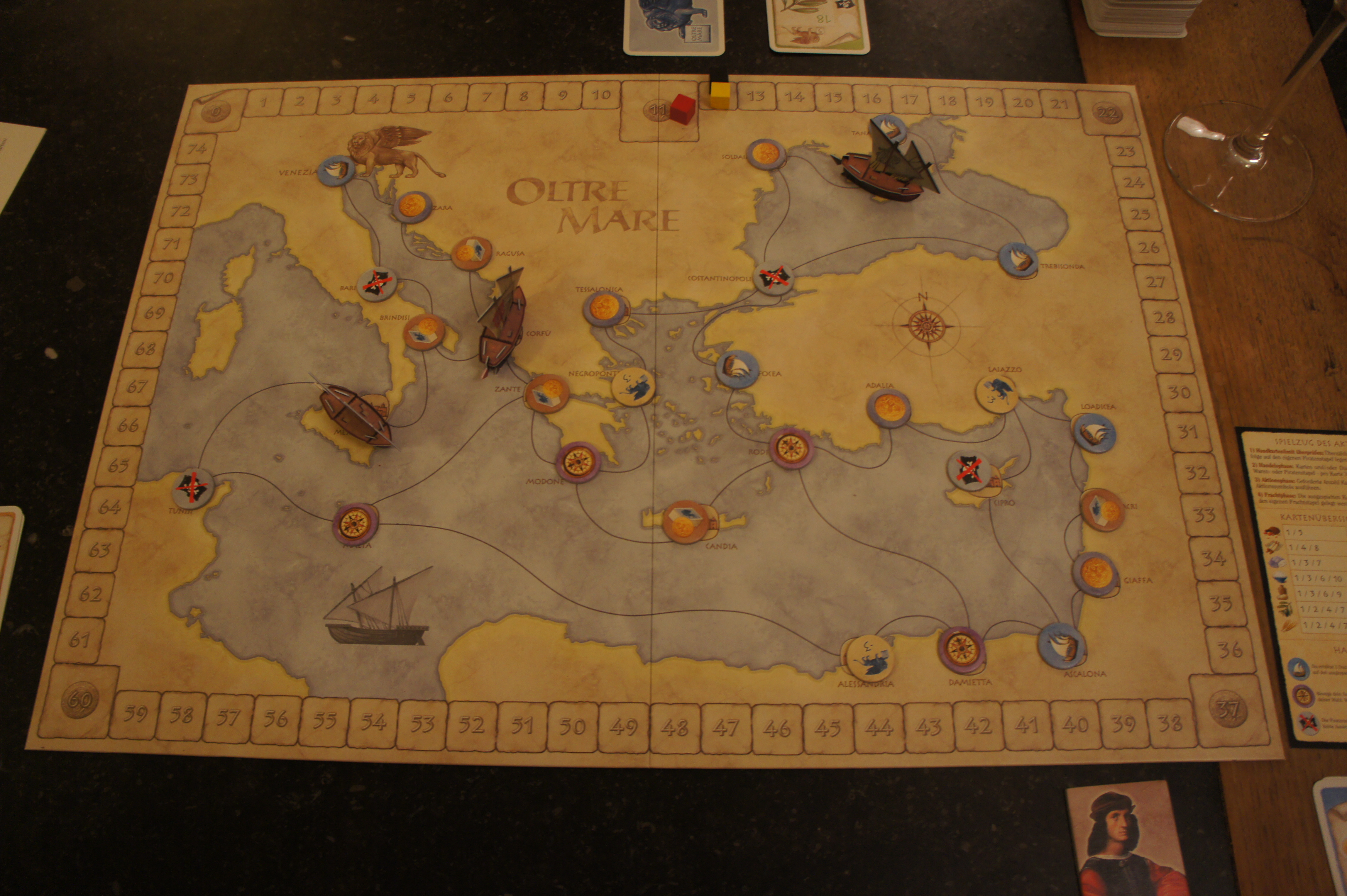 Dans Oltre Mare chaque joueur est un marchand vénitien qui tente de gagner le plus de ducats possible en commerçant autour de la méditerranée. Le jeu se joue sur un plateau avec des cartes représentant les marchandises qu’on va essayer de vendre. A son tour un joueur effectue 4 phases: