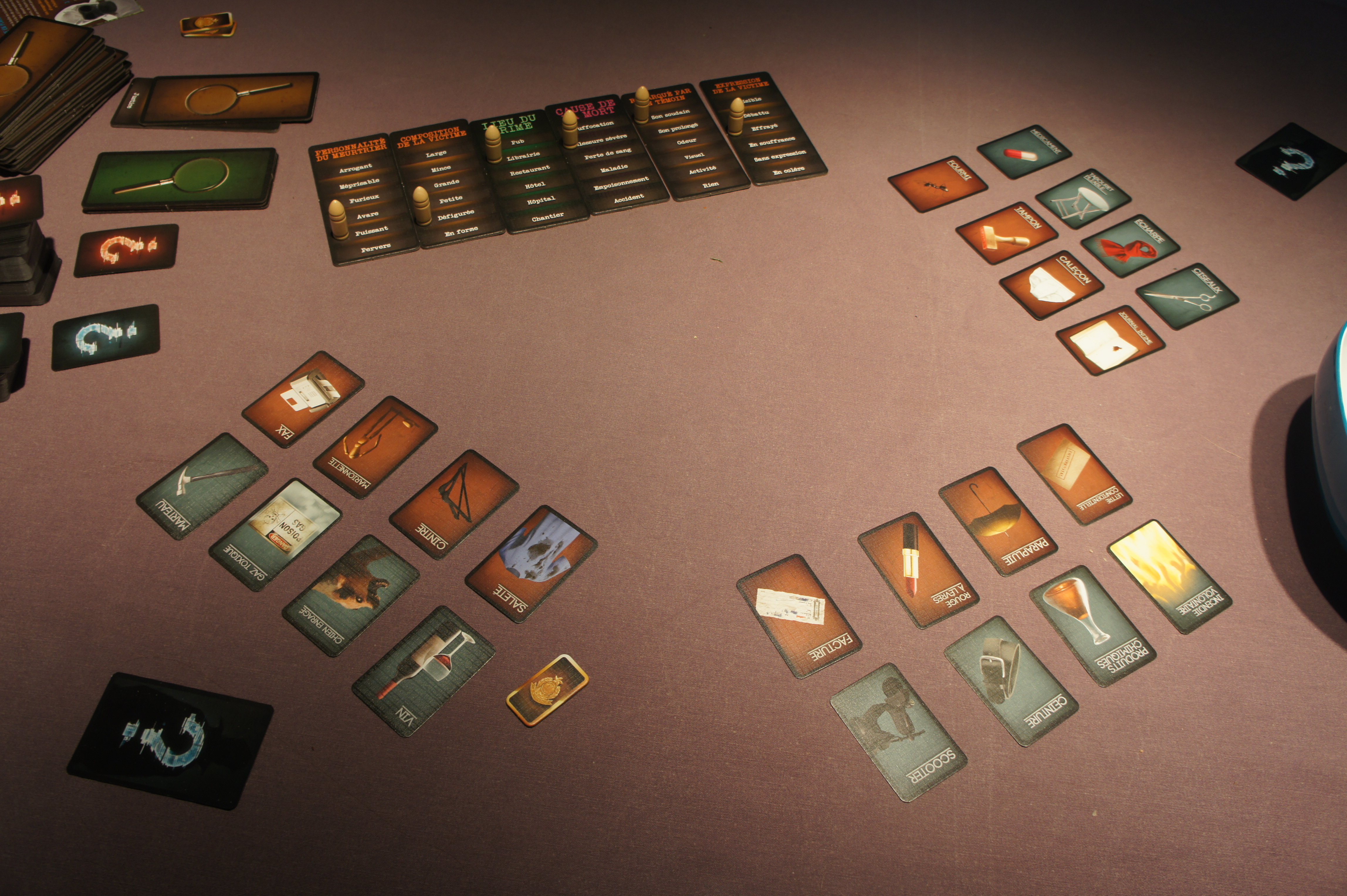 Les joueurs doivent découvrir l’arme du crime ainsi que l’indice qui prouve l’identité du meurtrier.  Chaque joueur a 8 cartes devant lui : 4 cartes arme du crime et 4 cartes indice.  Il va falloir retrouver le bon indice et la bonne arme du crime.