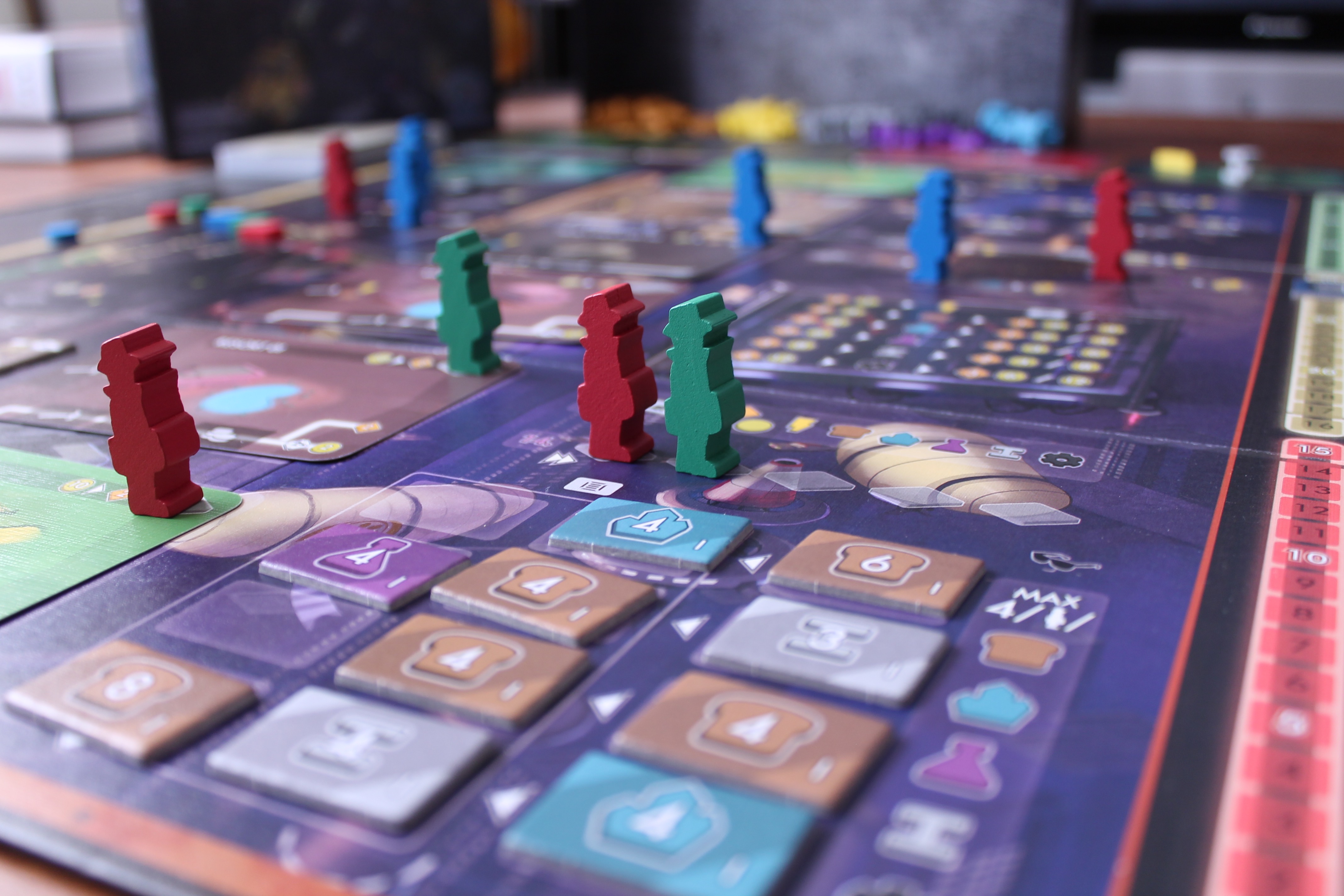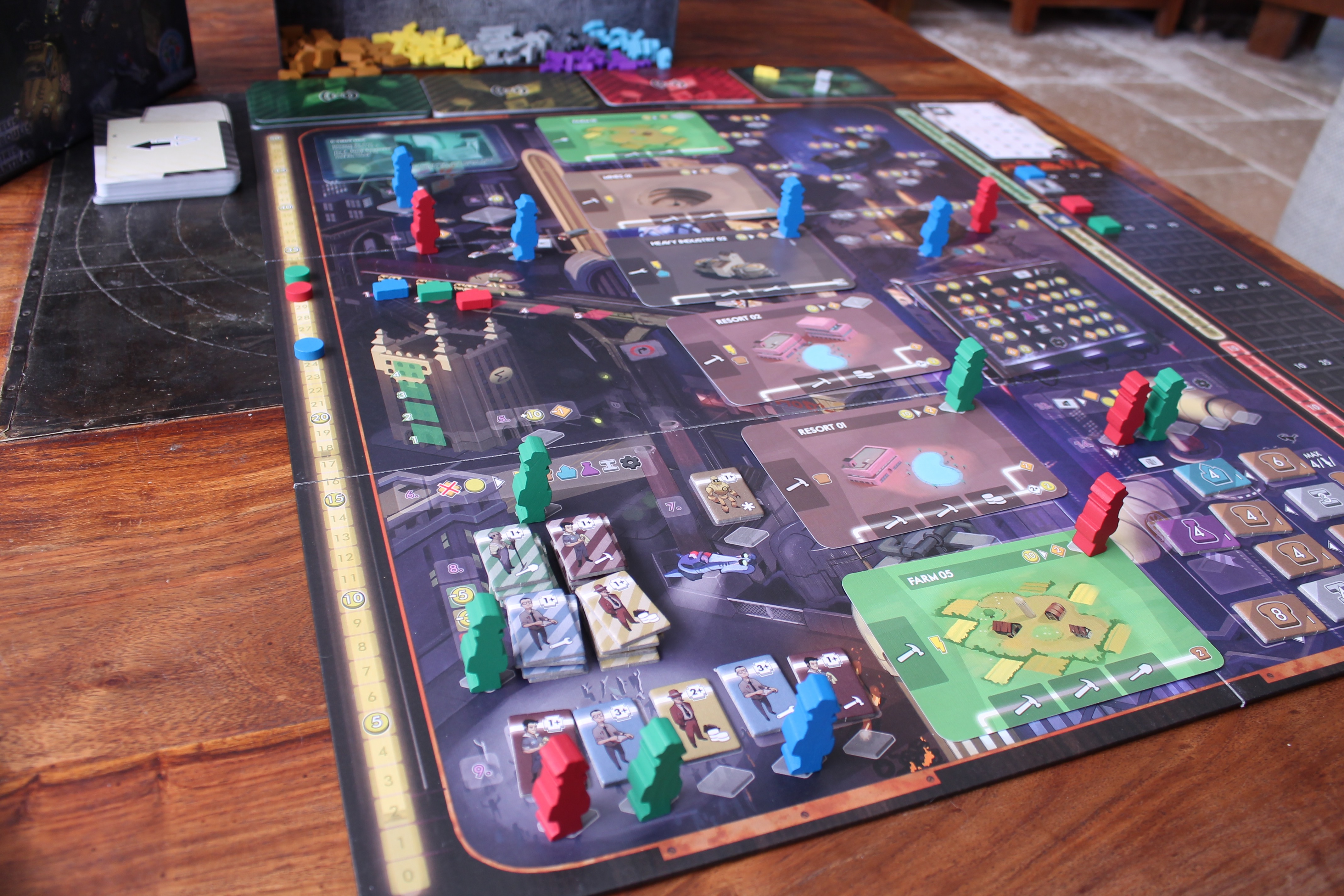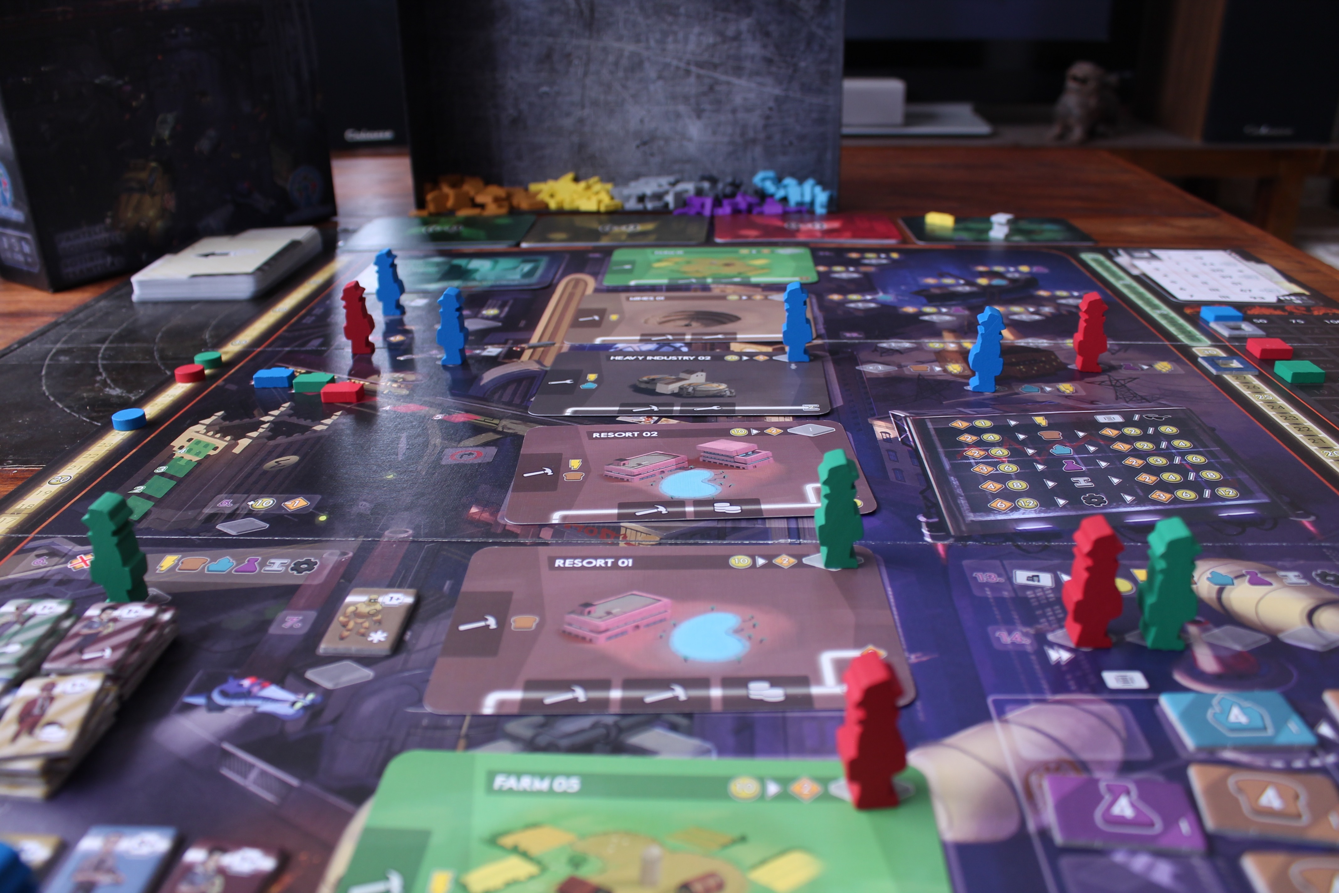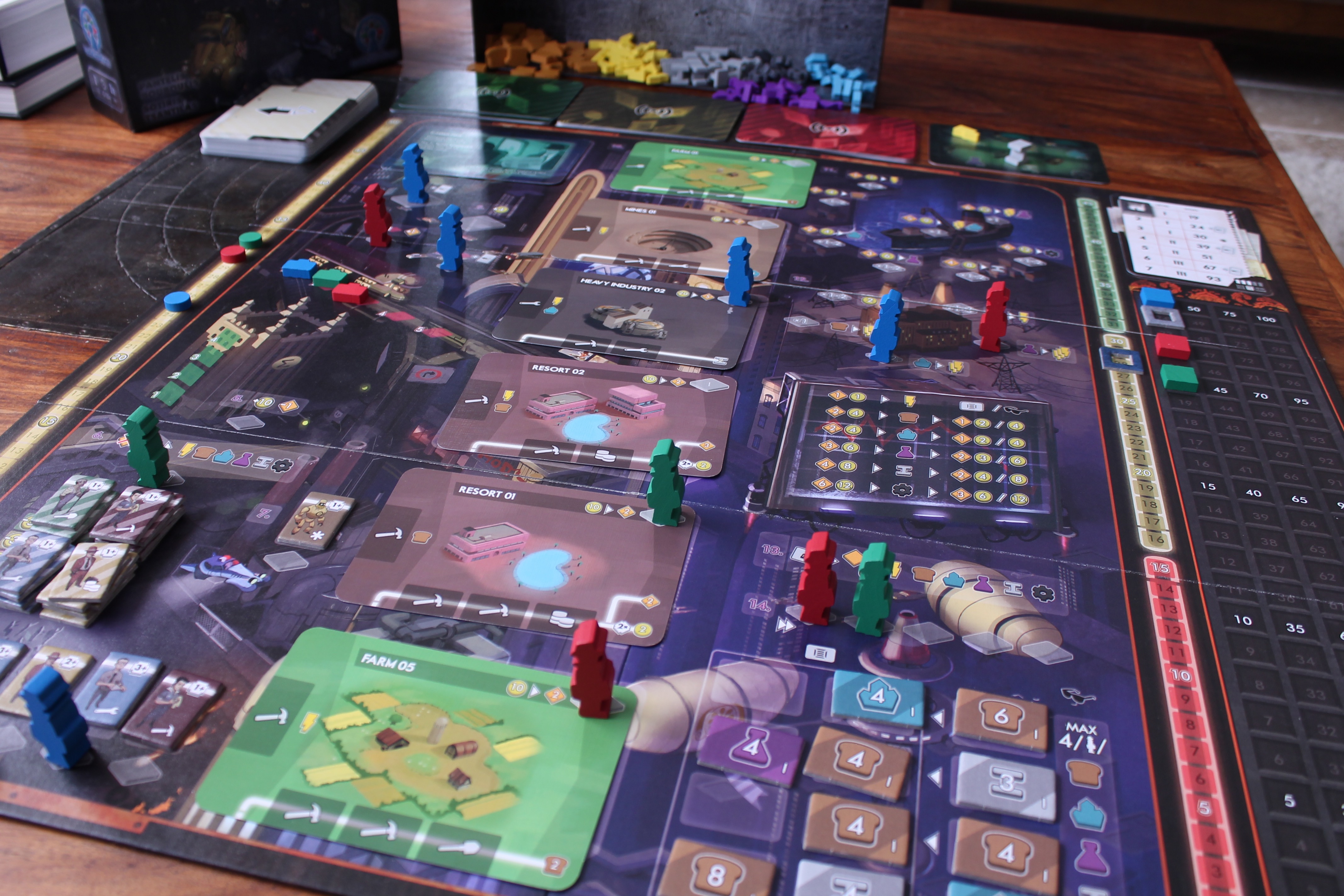 Mais ne fuyez pas il ne s’agit pas de simulation économique. Placer ce jeu dans un pays futuriste détend l’atmosphère et permet de créer un plateau tout en couleur pour un jeu très fluide. Mais l’allusion est énorme 😉 Et l’ambiance est plus à la BD qu’à la simulation économique froide rassurez-vous.