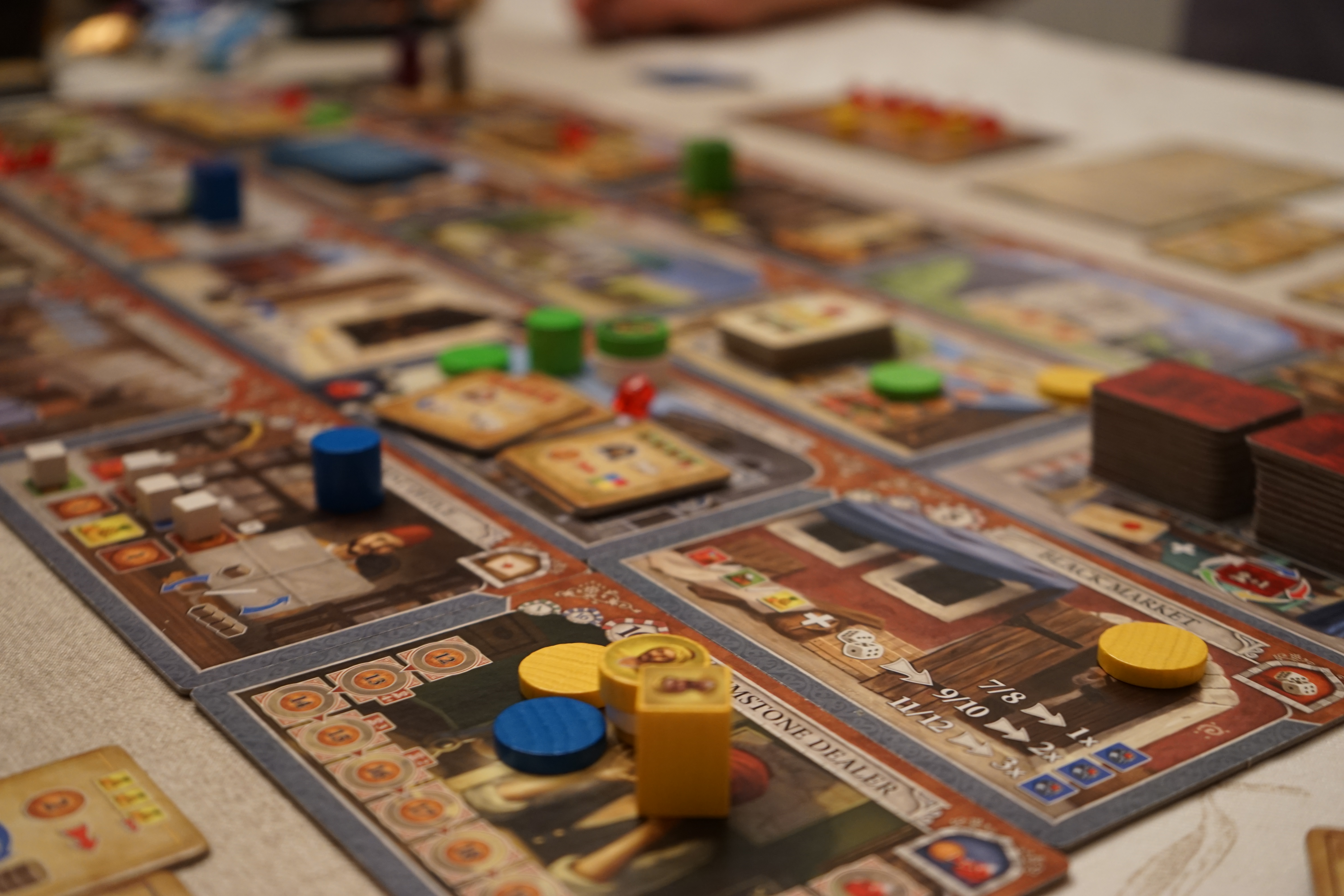 Ces lettres sont, somme toute, une façon assez simple d’obtenir des rubis et il serait dommage de s’en passer. Néanmoins, si on veut optimiser ses actions et ses déplacements, il va falloir tenir compte des endroits où les lettres devront être délivrées. Cela va orienter votre stratégie et vous allez peut être être forcé à opter pour une stratégie diversifiée plutôt que concentrée sur un des aspects de récolte de rubis. De plus, elle offre des choix supplémentaires car les joueurs vont devoir réfléchir à 2 fois si le jeu en vaut la chandelle et s’il ne vaut mieux pas renoncer à la livraison de certaines lettres pour optimiser encore plus sa stratégie. Cette extension apporte également une tuile permettant d’acquérir des cartes objectifs grâce à un système d’enchère assez bien foutu et donne un personnage supplémentaire : le compagnon. Vous pouvez le mettre en jeu après avoir utilisé la fontaine (elle regroupe toujours vos assistants sous votre marchand). Le compagnon ne se déplace que d’une case mais n’a pas besoin d’assistant pour réaliser les actions. Il va vous donner encore plus de liberté dans vos choix et les combos seront encore plus nombreuses.