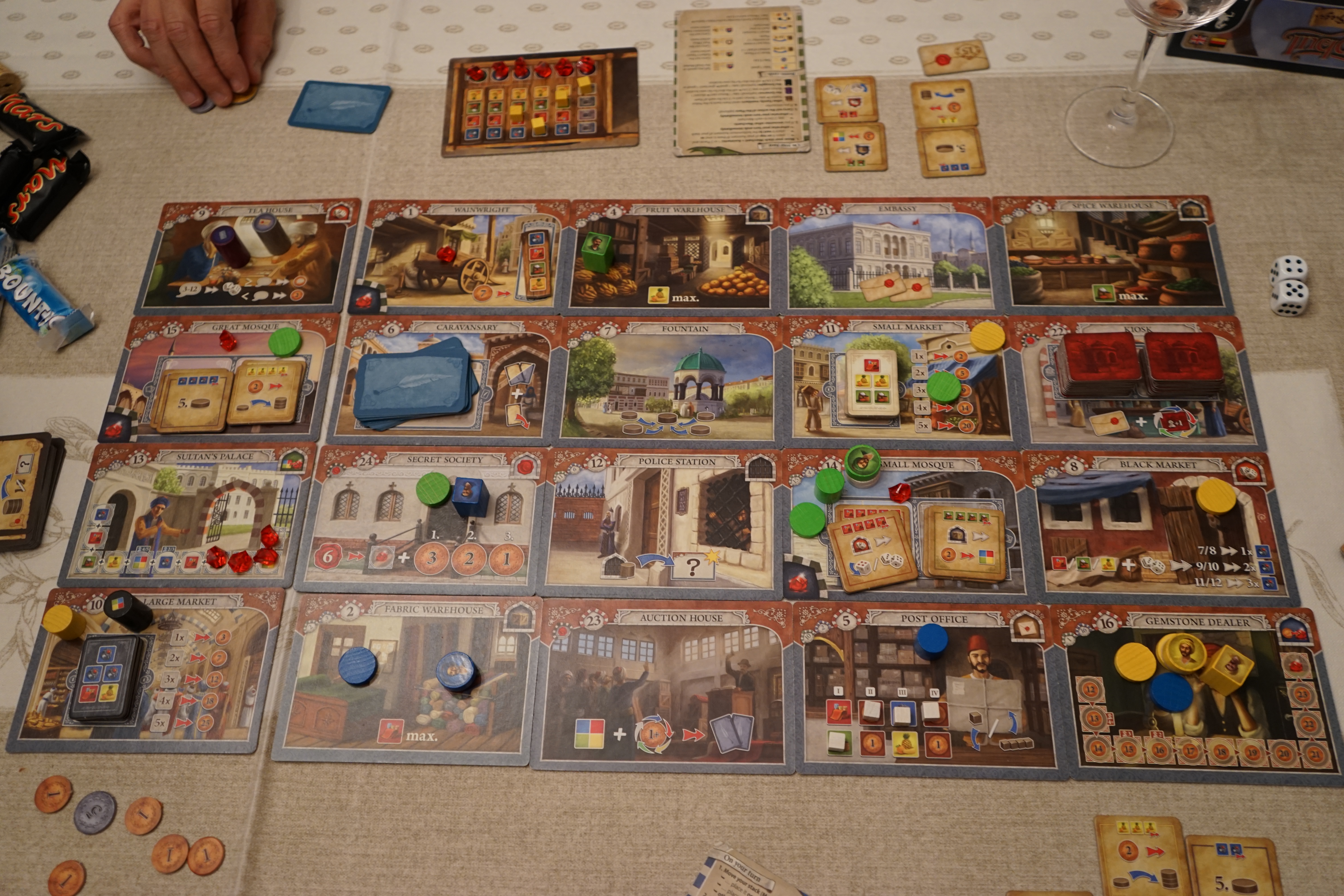 Sur la tuile « lettres », on peut échanger 6 sceaux contre 1 rubis. On prend ce rubis sur une des tuiles donnant les rubis : la piste des ressources, la piste de l’argent ou la piste café si on joue avec Mosha & Baksheesh.