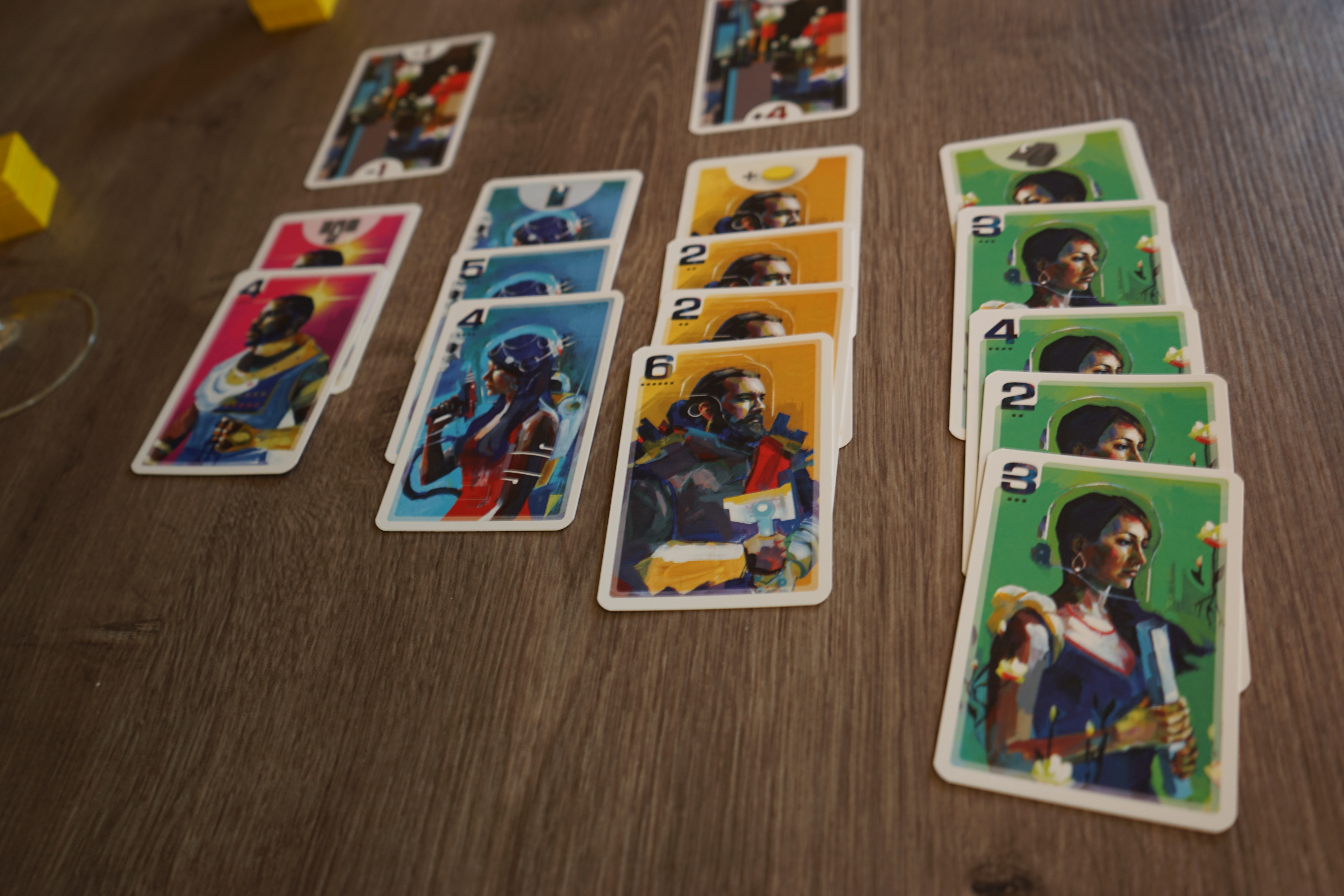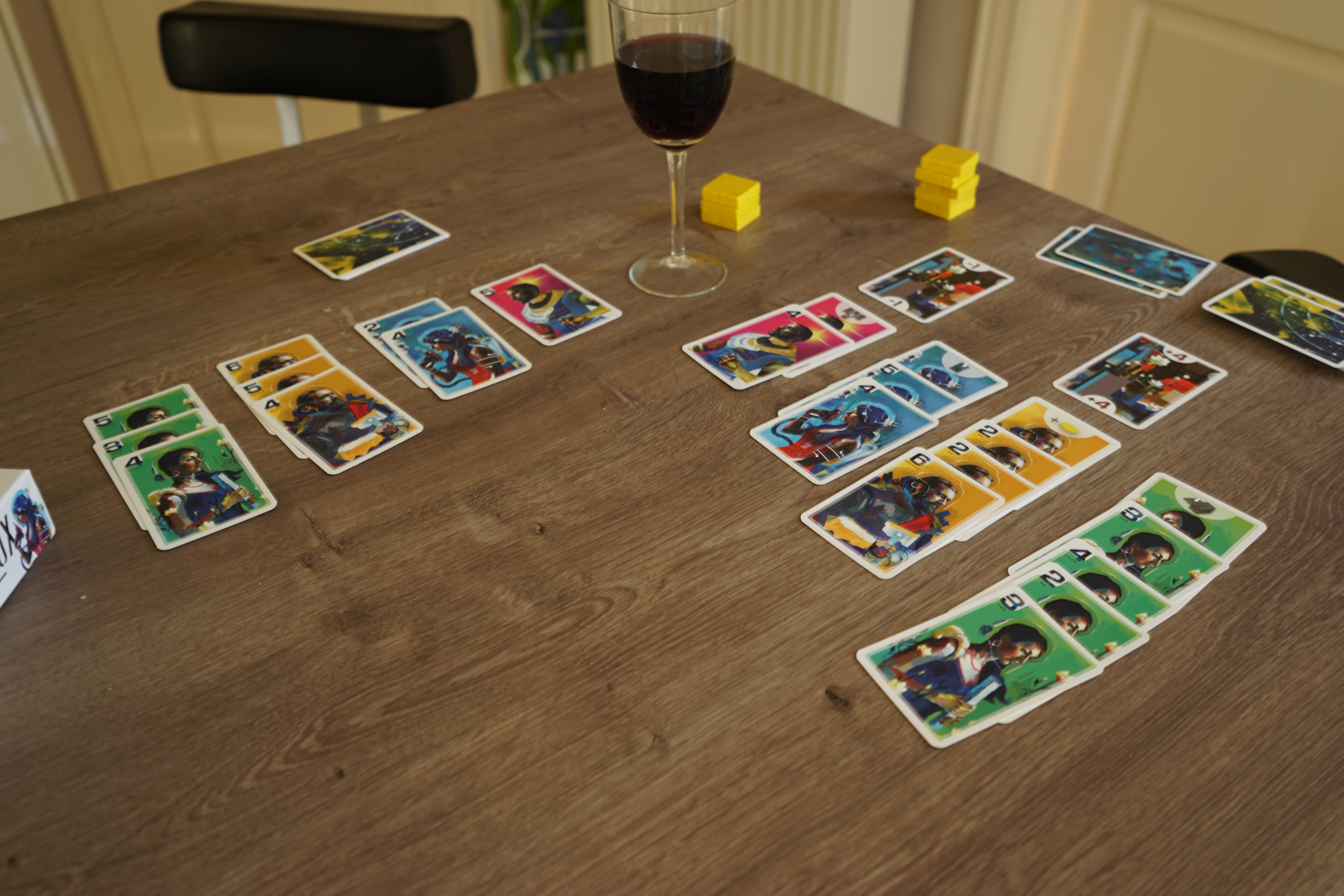 Après ce draft, chaque joueur, à son tour, va jouer une carte. Quand on joue une carte, on peut la jouer à 2 endroits possibles : devant soi ou au milieu de la table. Si vous jouez une carte devant vous, elle y reste jusqu’à la fin de la partie à condition que, pour chaque couleur, la somme des valeurs des cartes devant vous soit inférieure ou égale à la somme des valeurs des cartes au milieu de la table. Si, par exemple, on possède 3 cartes jaunes : 2-4-5 et qu’on les place toutes devant soi, pour pouvoir les garder devant soi et engranger les PVs, il faut que la somme des cartes jaunes au centre de la table soit au moins équivalente à 11. Si il n’y a pas de cartes jaunes au centre de la table, on a alors intérêt à placer ses cartes « 4 » et « 2 » au centre et sa « 5 » devant soi car « 5 » est inférieur à leur somme, 6. L’idéal étant, bien entendu, qu’un autre joueur place les cartes jaunes au centre de la table pour que vous puissiez les jouer toutes devant vous. Voilà pourquoi la phase de draft est importante car vous allez pouvoir vous faire une idée des cartes adverses. Si vous savez qu’un adversaire possède aussi des cartes jaunes, vous allez patienter pour qu’il les joue au centre de la table à votre place et que vous en profitiez. Mais peut être fait-il de même avec vous…