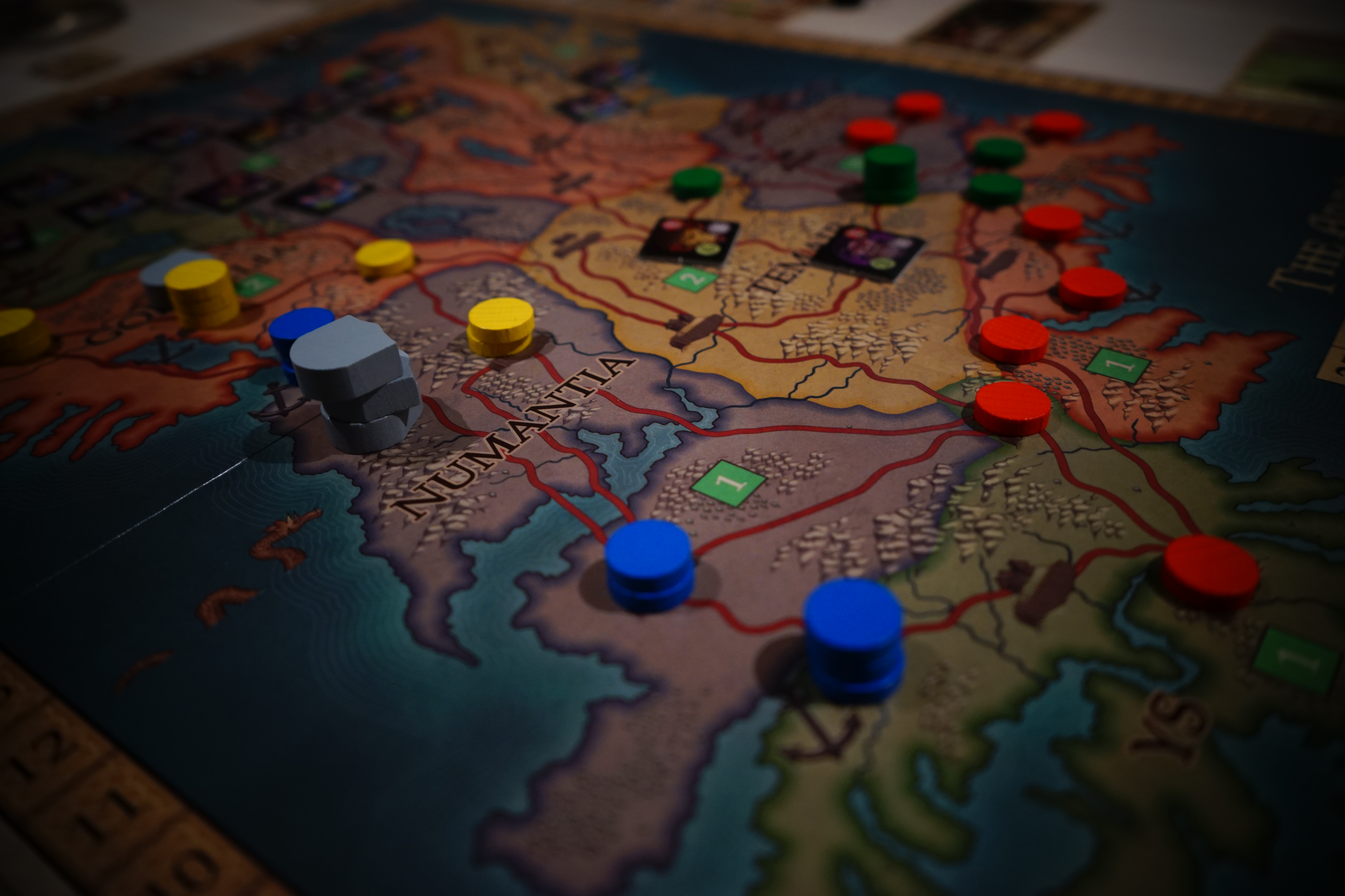 – Placer ses fortifications sur la carte : les joueur vont étendre leur zone d’influence en plaçant des disques à leur couleur sur les villes de la carte. Un disque peut être placé sur une ville vide ou au-dessus d’un de ses propres disques pour augmenter sa résistance face à l’ennemi. C’est une des grandes sources de point de victoire car, à la fin du jeu, les joueurs vont gagner des PVs en fonction des endroits où ils se situent. Les endroits les plus risqués (= les plus proches de l’ennemi) rapporteront plus de PVs que les endroits plus éloignés.