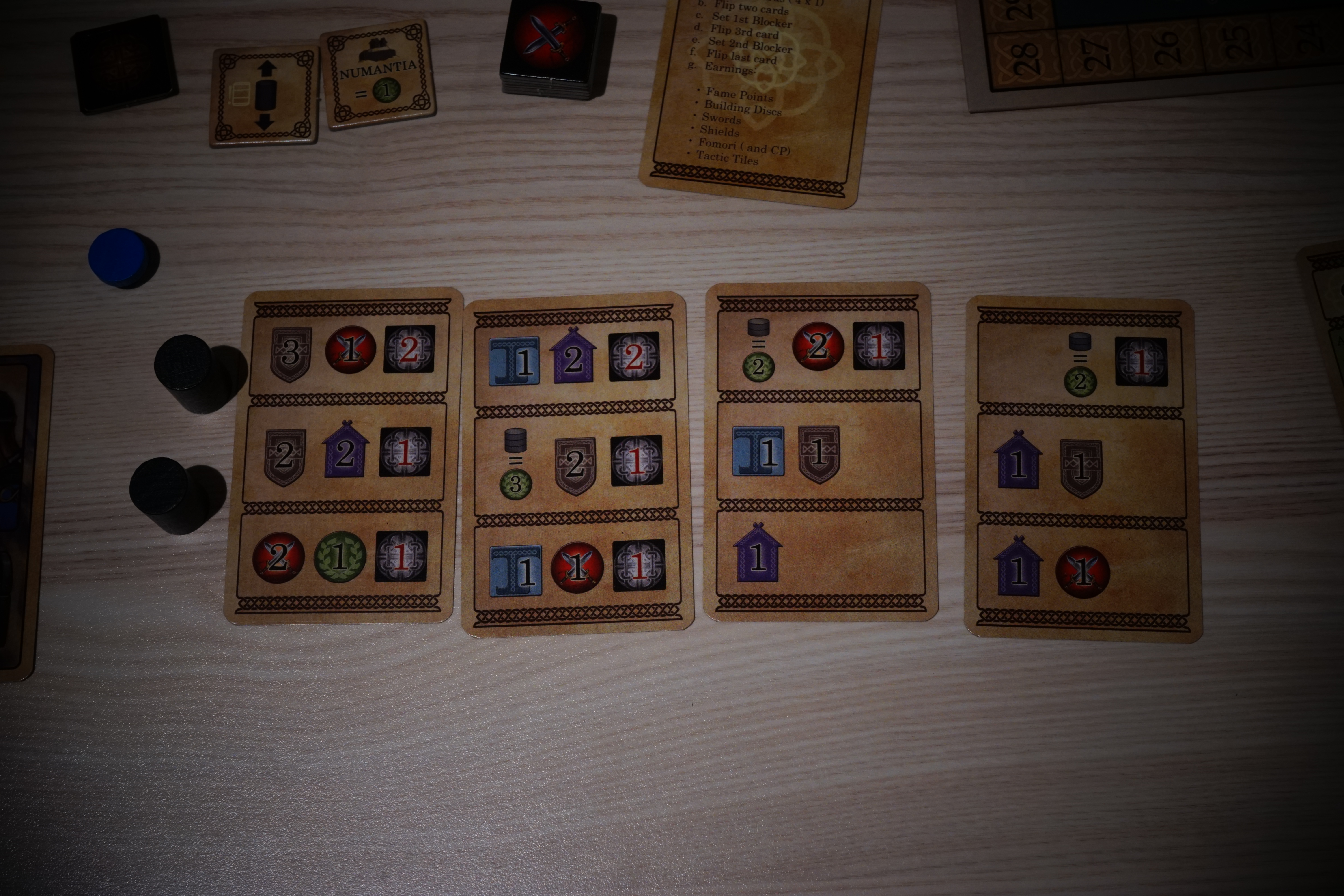 + Ce degré d’incertitude lorsqu’on sélectionne la ligne à supprimer. En effet, on élimine une rangée avec 2 cartes visibles seulement. On élimine une 2ème rangée après avoir révélée la 3ème carte. La dernière carte est donc inconnue et est révélée quant les choix sont fait. On sait quand même que la première rangée sera riche en symboles divers mais aussi en nombre d’ennemis qui arrivera en jeu. Alors que la troisième offrira moins de symboles mais limitera aussi l’apparition des ennemis venant du nord. Cela influencera bien évidemment nos choix mais peut ne pas convenir à ceux qui préfèrent éviter le hasard de cette mécanique;