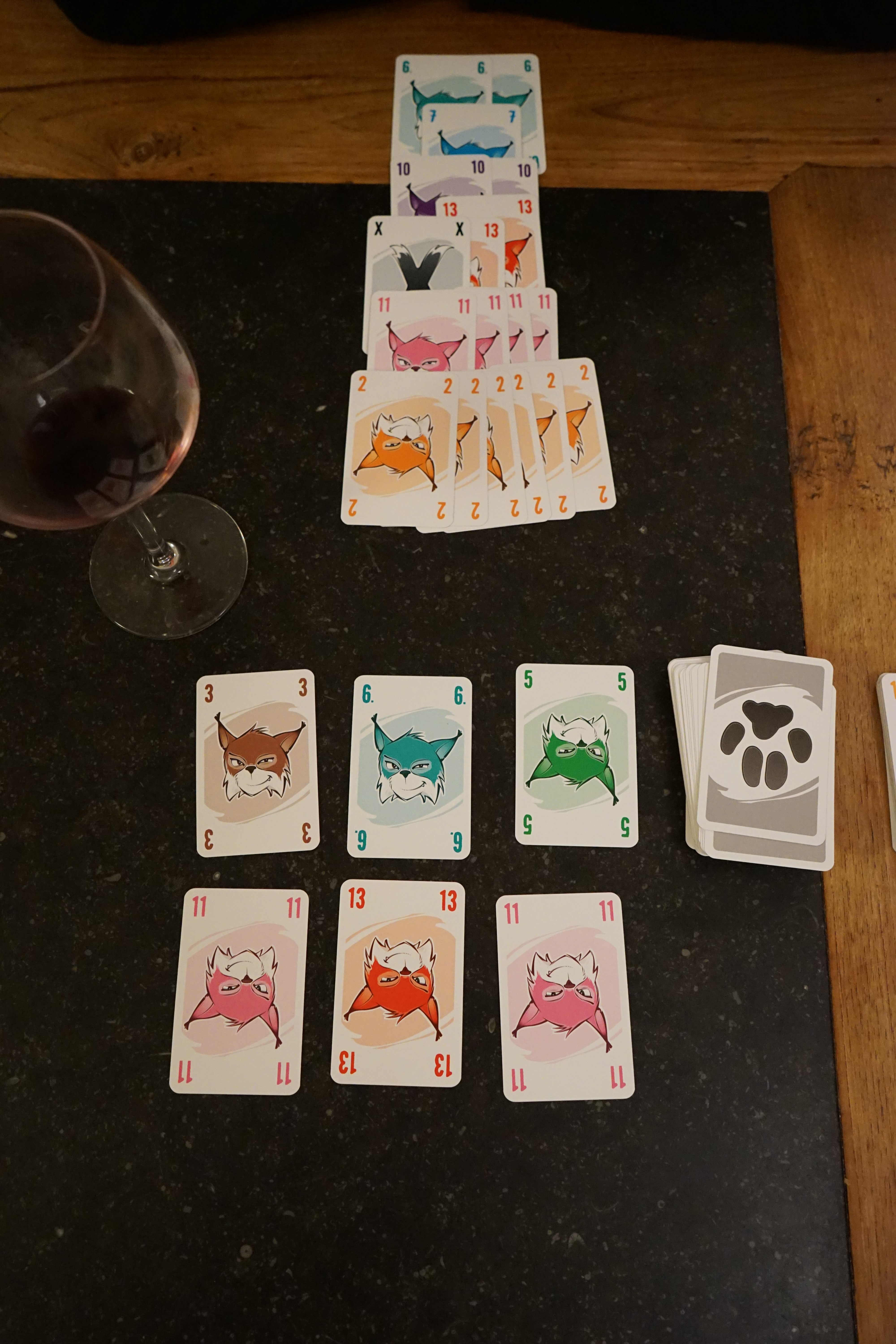 Inspiré par le Trou du Cul, le but de Linko est de se débarrasser en premier de toutes ses cartes. Pour cela, chacun à son tour va les jouer par 1, 2, 3 ou plus du moment que toutes les cartes jouées portent le même numéro. Si un joueur joue exactement le même nombre de cartes que vous mais d’une valeur supérieure, il a le choix entre prendre vos cartes ou vous les laisser. S’il vous les laisse, vous pouvez soit les reprendre en main, soit en piocher autant de la pioche commune comprenant 6 cartes face visible. Et c’est là que le jeu est malin car il peut être intéressant de se faire battre pour pouvoir piocher des cartes qui se combinent mieux avec votre jeu.
