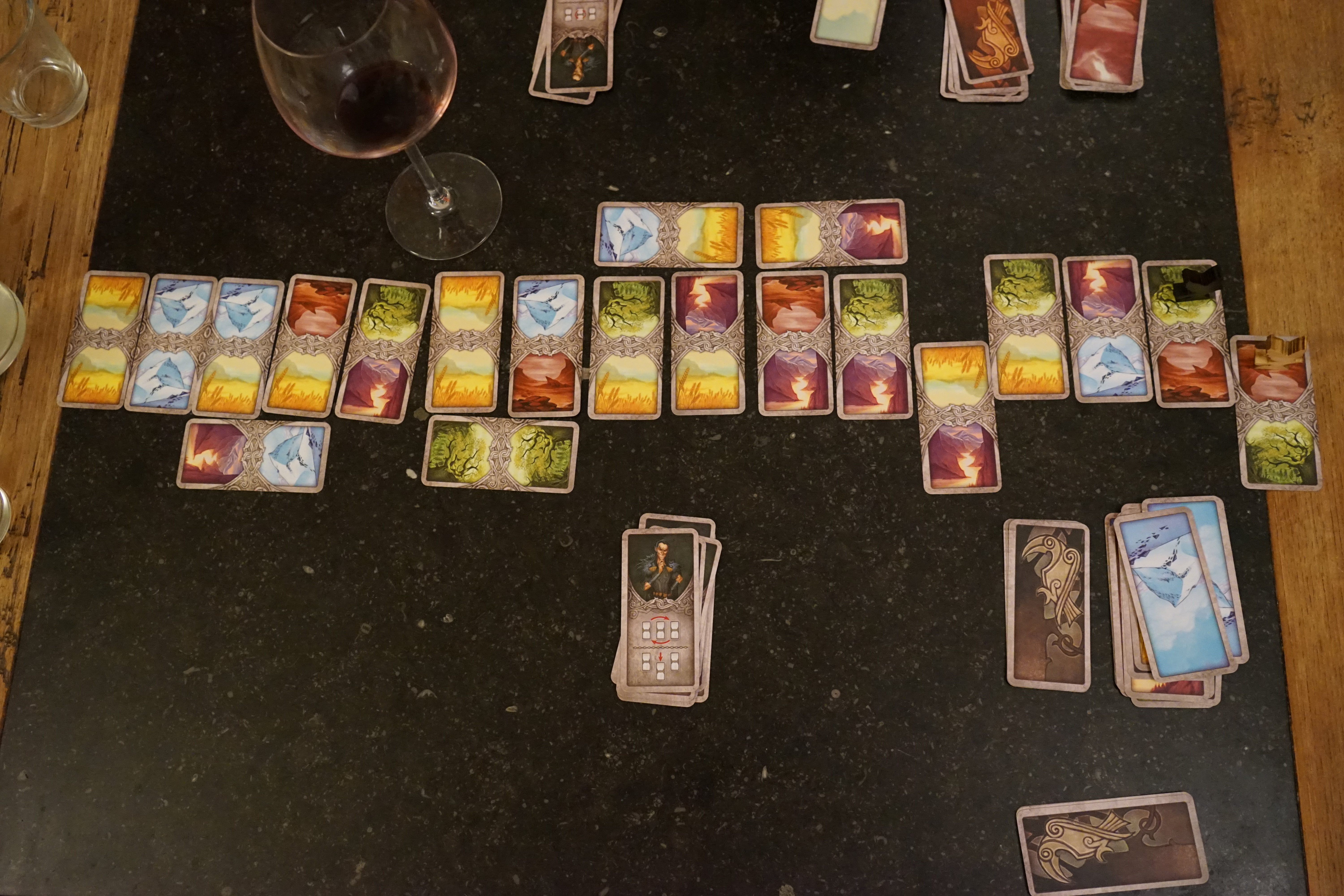Le jeu est donc composé de deux rangées de cartes, représentant des types de terrain. Chaque joueur doit faire l’aller-retour. A son tour un joueur pose autant de cartes qu’il veut pour avancer son corbeau. Soit il pose une carte correspondant au terrain devant lui, auquel cas il avance. Soit il pose deux cartes identiques d’un autre type de terrain, auquel cas il avance aussi (ça équivaut à un joker). Soit il pose une de ses cartes Loki (chaque joueur a les mêmes cartes Loki), qui permettent de réaliser des tours et ainsi ralentir l’adversaire ou au contraire l’aider dans sa progression: on peut par exemple ajouter une carte obligeant l’adversaire à faire un détour, on peut avancer d’une case gratuitement, on peut intervertir deux cartes… On peut également repiocher des cartes, en ayant alors le choix entre piocher des cartes terrains, des cartes Loki (en nombre limité, et comme dit plus haut identiques pour les deux joueurs, donc pas d’avantage de la chance, juste un ordre de tirage qui sera différent) ou un mélange des deux. Et le premier qui a fait l’aller-retour a gagné.