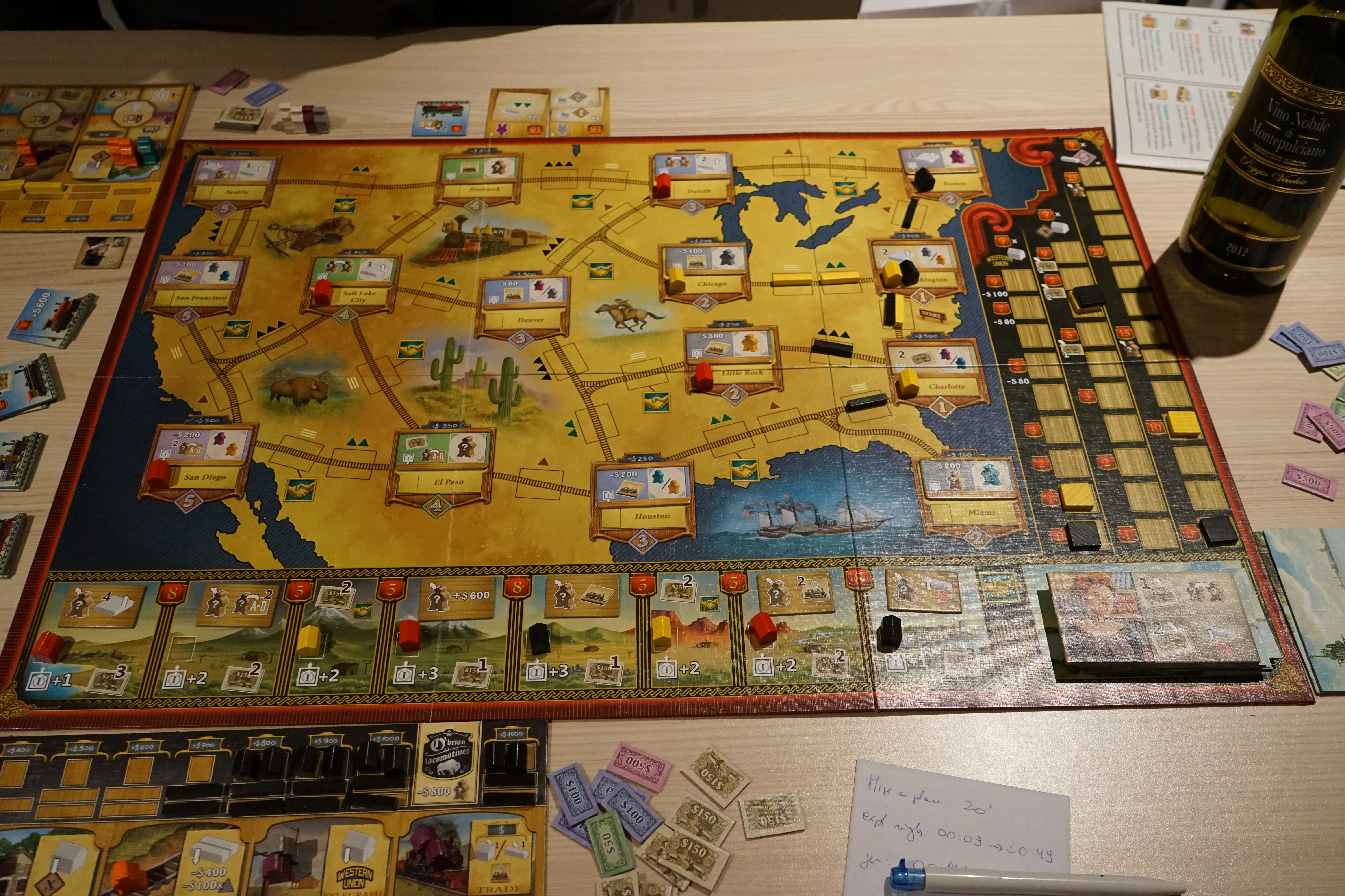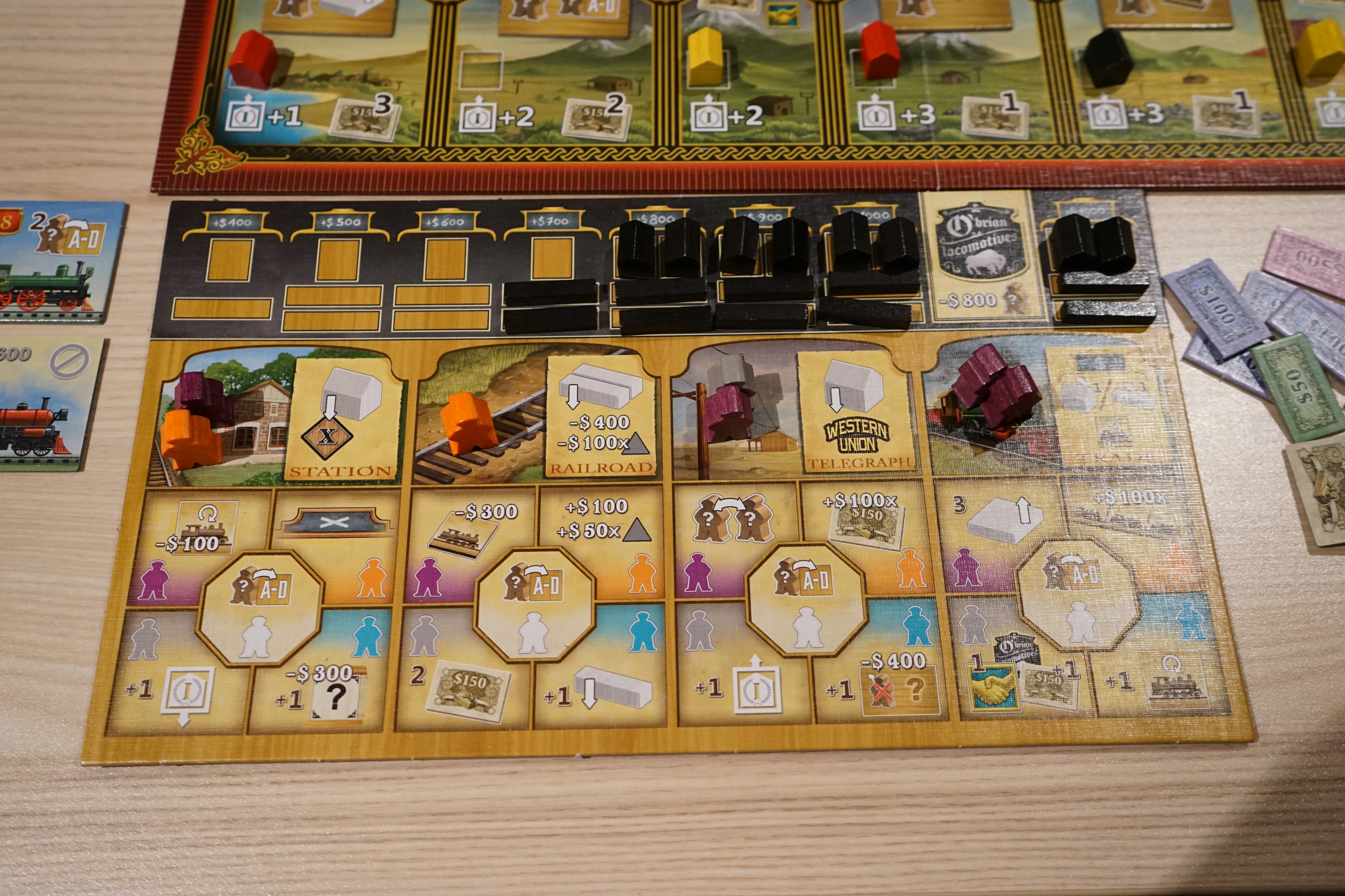 Le dernier élément qui ajoute une tension dans le jeu: le bonus du premier « constructeur ». En effet, le premier à construire une gare dans une ville bénéficiera de 2 bonus. Idem pour les bureaux de télégraphe (en bas du plateau sur la photo). Certainement pas à négliger. Il peut même y avoir une petite course, pour atteindre une ville avant les autres et bénéficier ainsi de ce bonus extra.