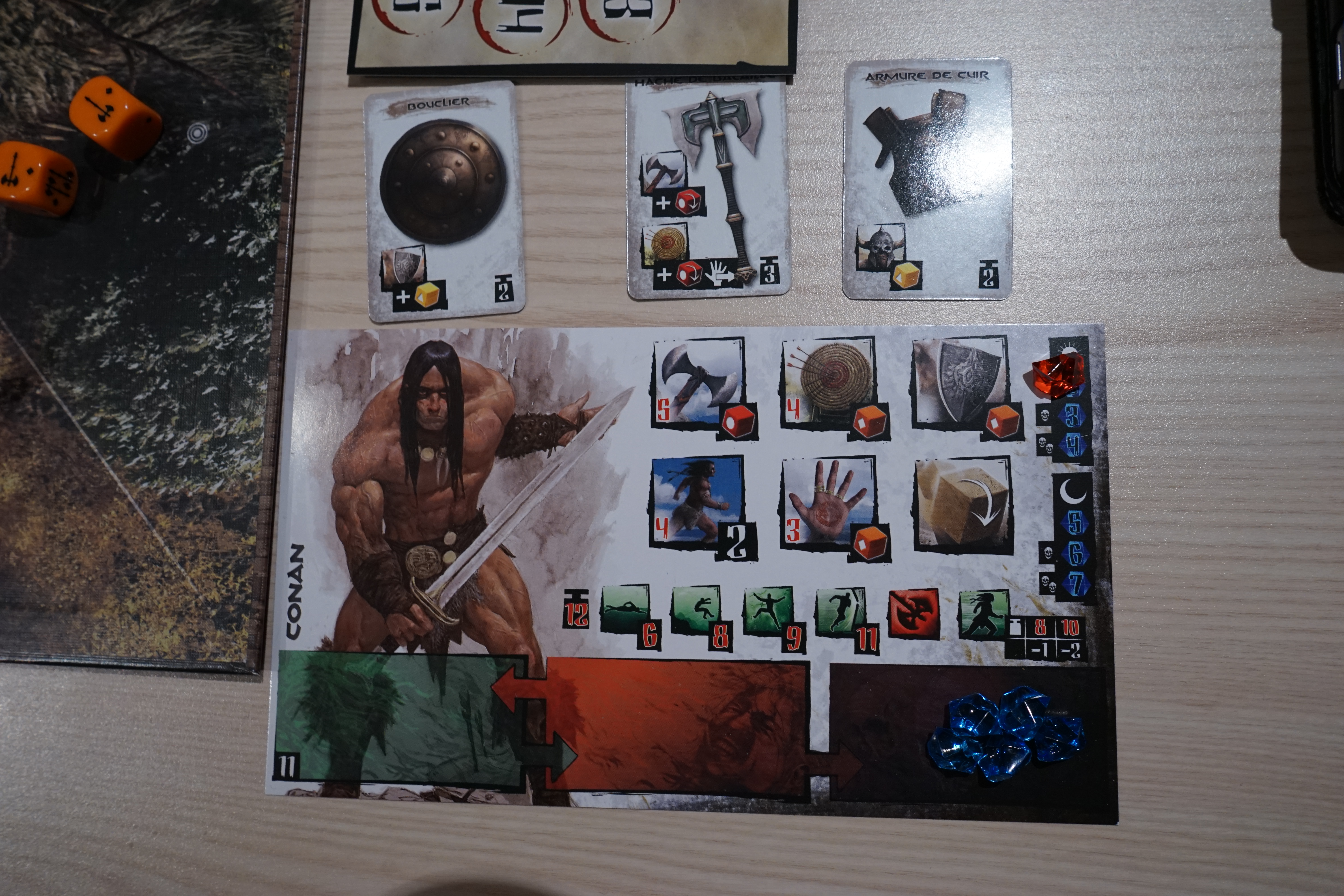La grande originalité et l’idée géniale de Conan est sa gestion des gemmes.  Pour pouvoir exécuter une action, une héroïne doit dépenser une ou plusieurs gemmes.  Chaque action lui coûte une ou plusieurs gemmes qu’elle va déplacer de sa zone disponible à sa zone de fatigue.  Quand on sait qu’en fonction du scénario joué, seul un nombre très limité de gemmes pourra étre déplacé de la zone fatigue à la zone disponible, il vous faudra bien gérer cet élement.  A la place de réaliser vos actions d’ailleurs, vous pourrez aussi simplement vous reposer.  Cela vous permet de gagner plus de gemmes dans votre zone disponible.  Et même si ça vous fait perdre un tour (c’est cher), c’est indispensable surtout que ces gemmes vont vous servir à vous protéger durant la phase de l’overlord s’il vous attaque.  Ce sont ces gemmes d’ailleurs qui sont déplacées dans la zone blessure lorsque le héros doit encaisser des dégâts.  Et ça fait très mal car un héros blessé disposera de moins de gemmes du coup.  Il aura moins de souplesse dans ses actions et pourra plus difficilement se défendre.  C’est logique et thématique tout ça 🙂