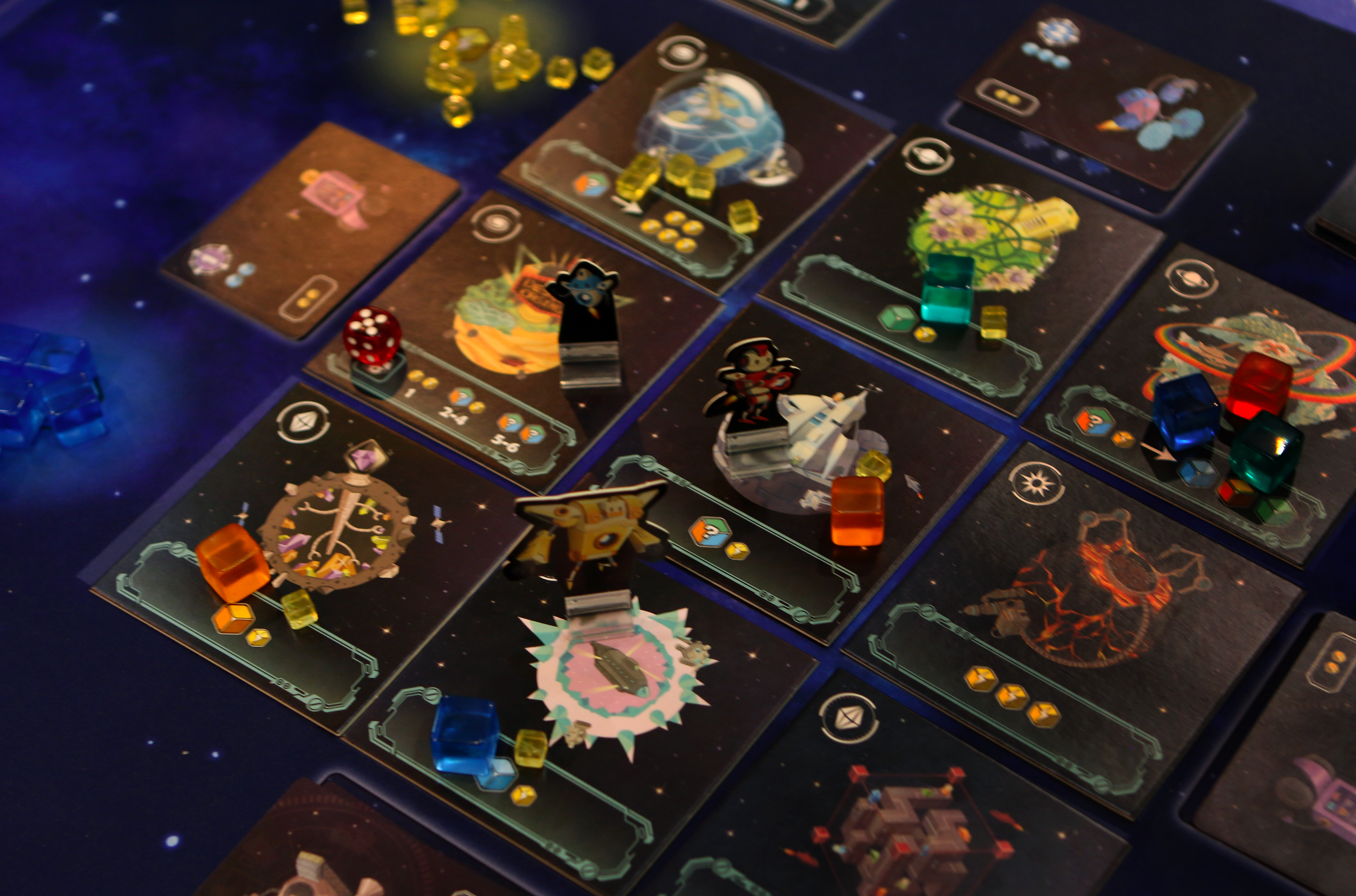 Dans Planet Defenders, vous allez contrôler 3 defenders différents. La particularité c’est que ces 3 defenders sont contrôlés par tous les joueurs. Le plateau est modulable puisqu’il est constitué de 9 cartes planètes posées aléatoirement. A votre tour, vous allez payer une énergie pour déplacer un des defenders et réaliser l’action de la planète d’arrivée. Les planètes permettent de classiquement gagner ou échanger des ressources/énergies contre d’autres. Si vous le désirez, vous pourrez réaliser une seconde action en payant 2 énergies. Vous pouvez également réaliser une action extra en achetant une technologie qui vous procure un bonus permanent (échanges avantageux, réduction de coût,…) ou en capturant des robots qui apportent les PVs nécessaires à la victoire.