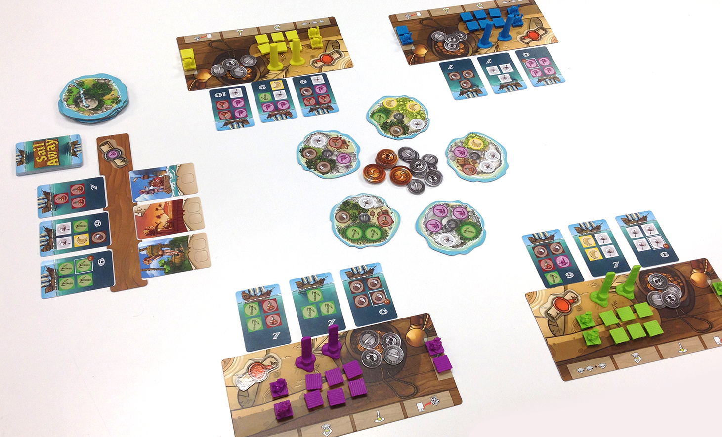 Sail Away est un jeu de pick-up & deliver très simple : on va prendre des ressources pour les placer dans nos bateaux.  Pour prendre une ressource, il suffit de placer un de ses ouvriers (ici, des palettes) dessus.  Les ressources sont disposées sur différentes îles et quand une île est complète de palettes, on distribue les ressources aux joueurs qui les placent sur leur bateaux demandeurs en ressources.  Quand un bateau est rempli, il peut partir vous procurant des points de victoire et des habilités spéciales.  Les joueurs disposent de palettes pirates qu’ils pourront placer sur les palettes adverses afin de leur voler les ressources convoitées.