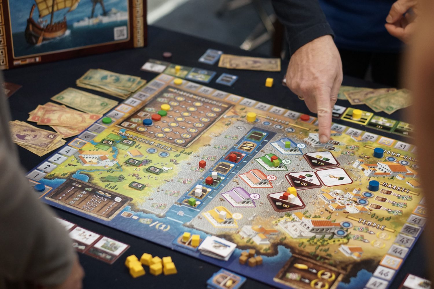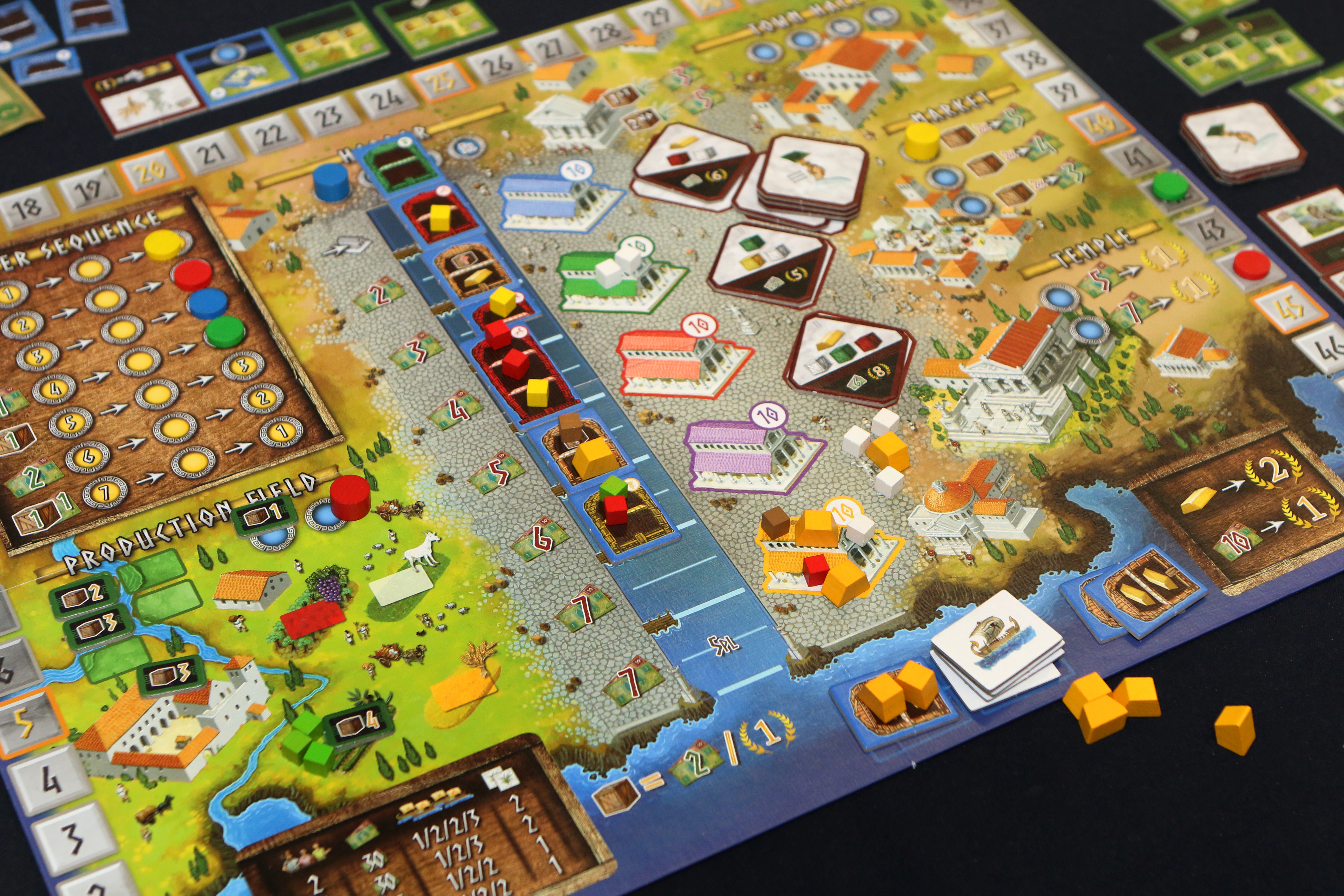 C’est une des actions les plus intéressantes du jeu car c’est grâce à elle que vous allez pouvoir actionner vos bâtiments. Vous les aurez précédemment acquis lors de l’action hôtel de ville où vous devrez dépenser vos derniers pour les bâtir. A noter qu’on a trouvé ces bâtiments forts chers et qu’on peut s’en passer pour prétendre à la victoire. Le reste des actions est tellement lucratif, qu’une joueuse peut aisément préférer réaliser ces autres actions plutôt que de construire des bâtiments aux fonctions anecdotiques. C’est évidemment fort dommage tant ce sont les bâtiments et leurs capacités qui apportent de la variété et de l’intérêt au jeu. Ils permettent, en général, de gagner plus de PVs, plus de ressources ou plus de drachmes lorsqu’on réalise certaines actions ou de gagner plus d’espace de stockage.