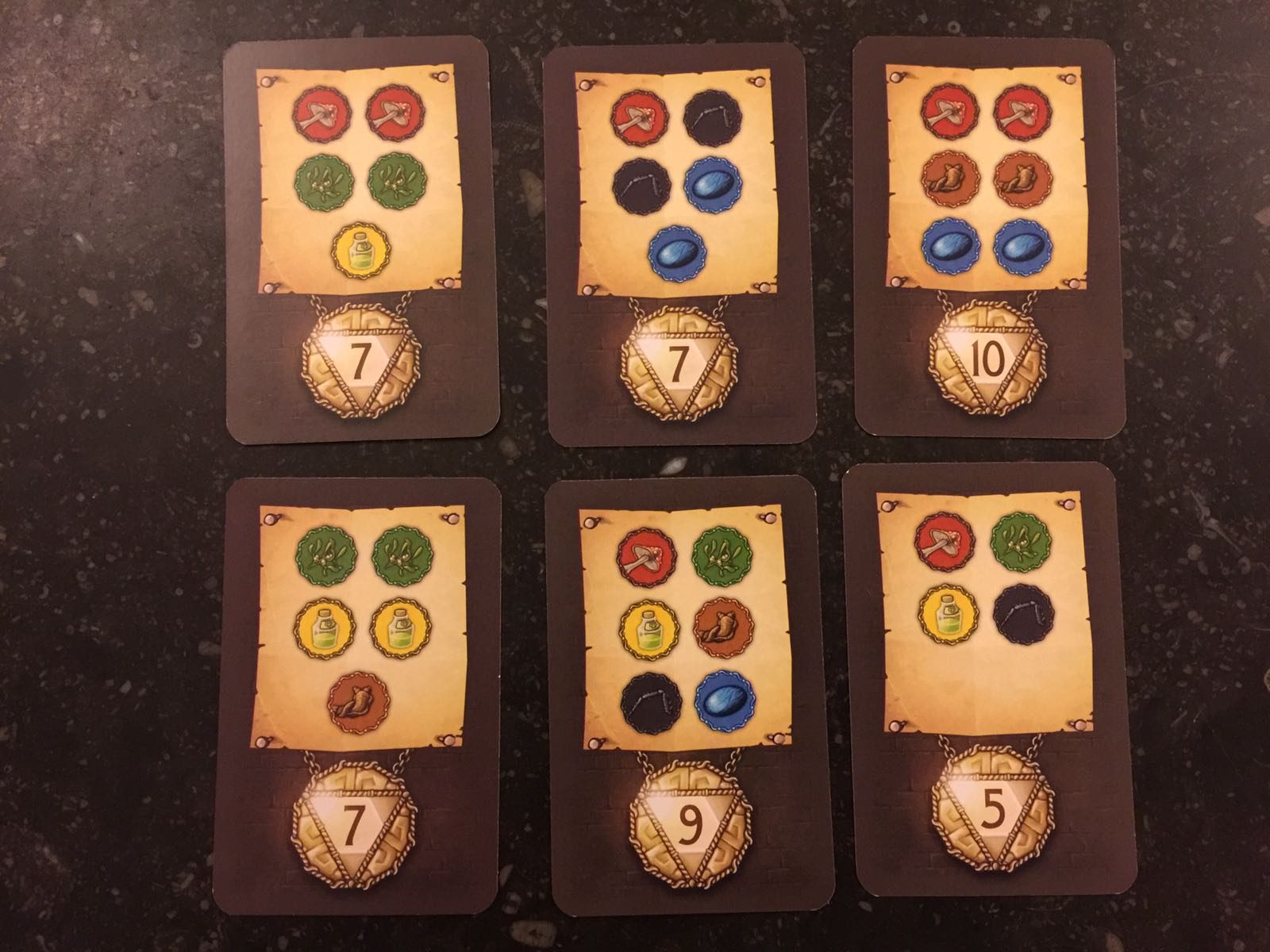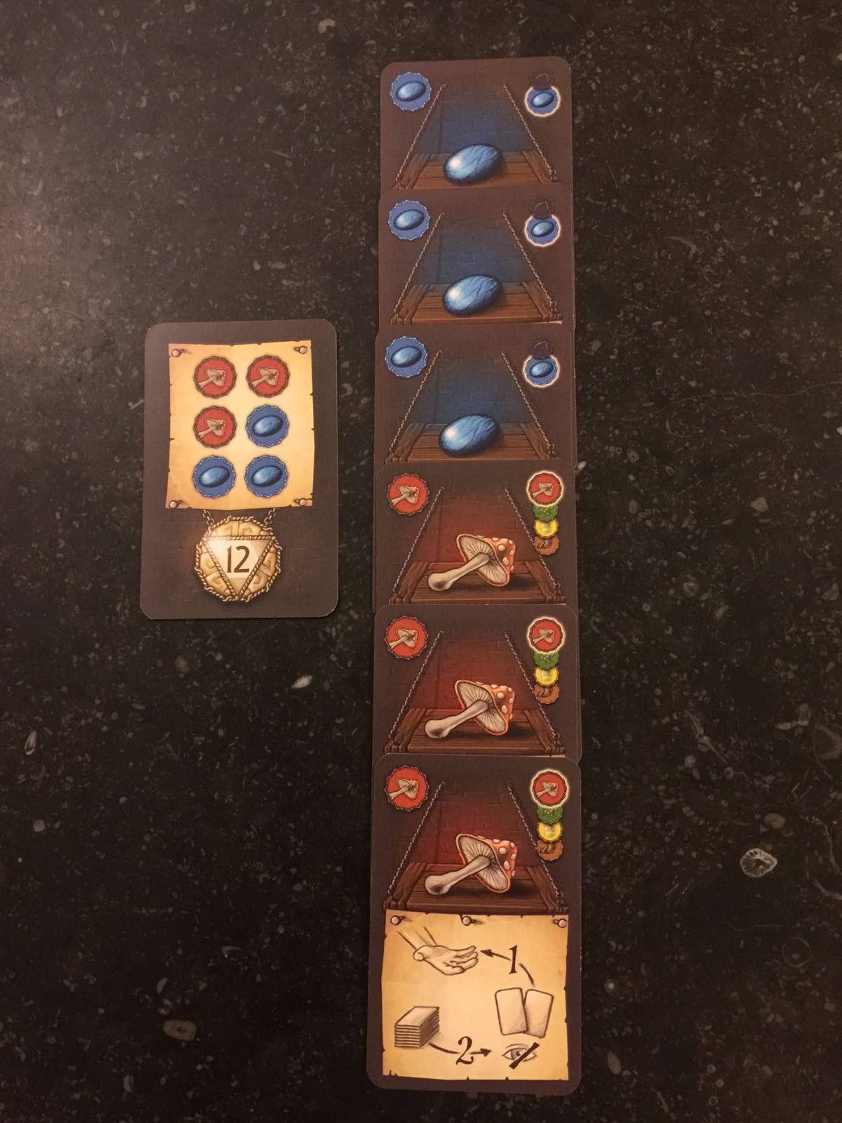 A son tour un joueur doit piocher deux cartes, selon certaines règles, en garder/recevoir une, et en donner une autre / se faire prendre une autre / défausser une autre (je vais y revenir). Ensuite il peut, ce n’est pas obligatoire, poser une carte pour fabriquer une potion, sachant qu’il peut fabriquer maximum 5 potions en même temps. Alternativement à la pose d’une carte il peut déplacer un ingrédient d’une potion où il a déjà au moins 3 ingrédients vers une autre potion en cours. Dès qu’une potion est complétée, le joueur défausse tous les ingrédients utilisés et récolte la potion, qui lui donnera des points de victoire (entre 5 et 12, selon le nombre et la complexité des ingrédients nécessaires). Le premier a 45 points a gagné.